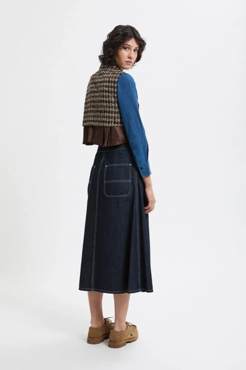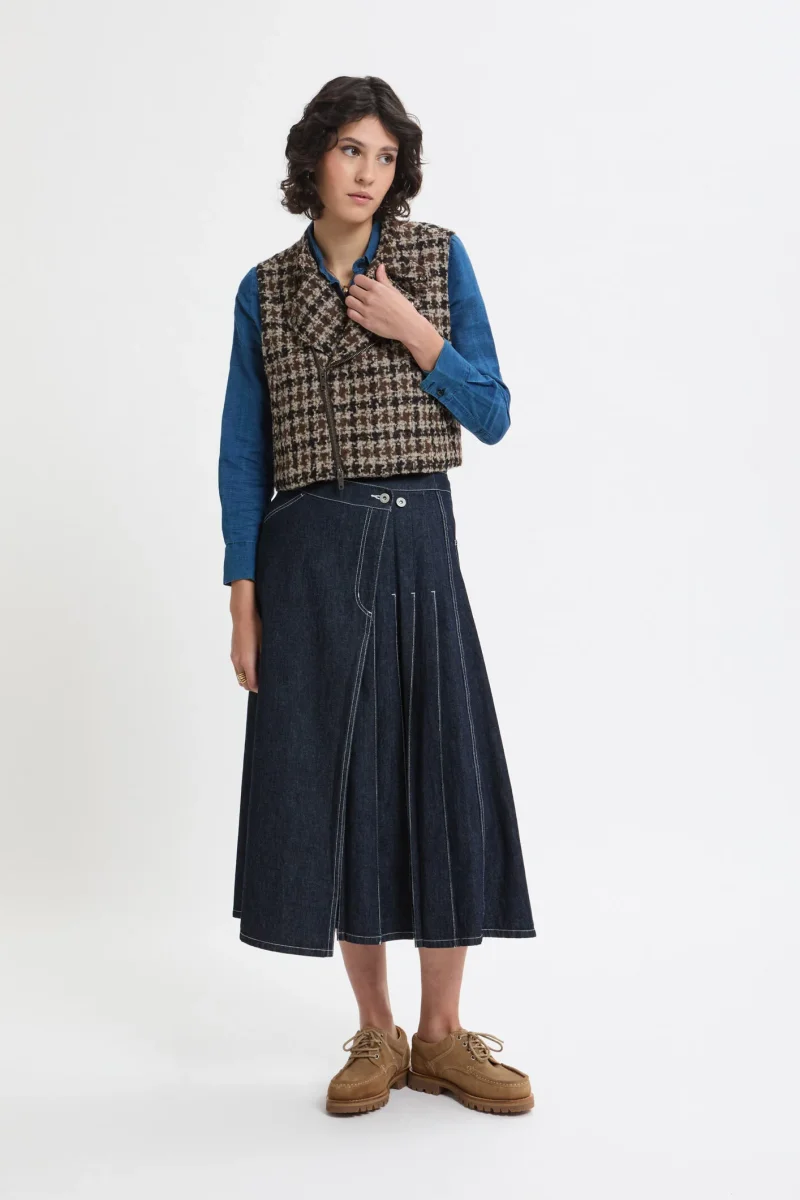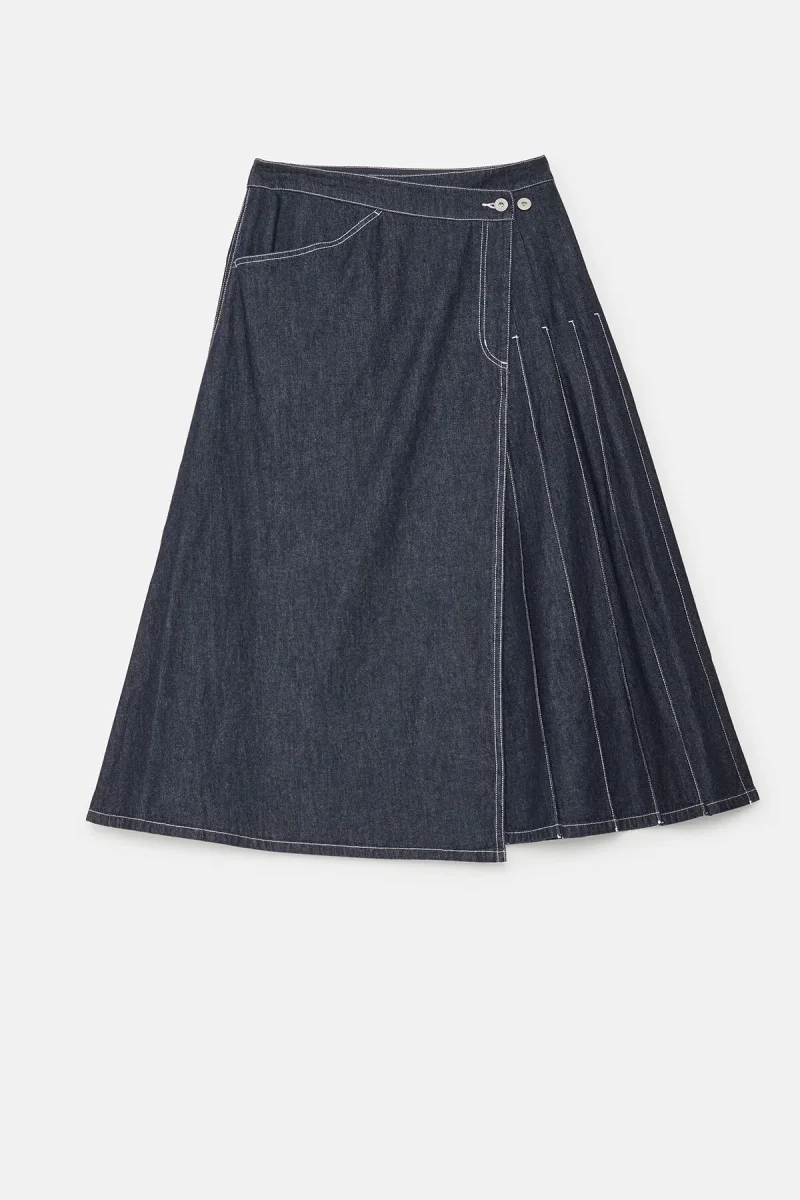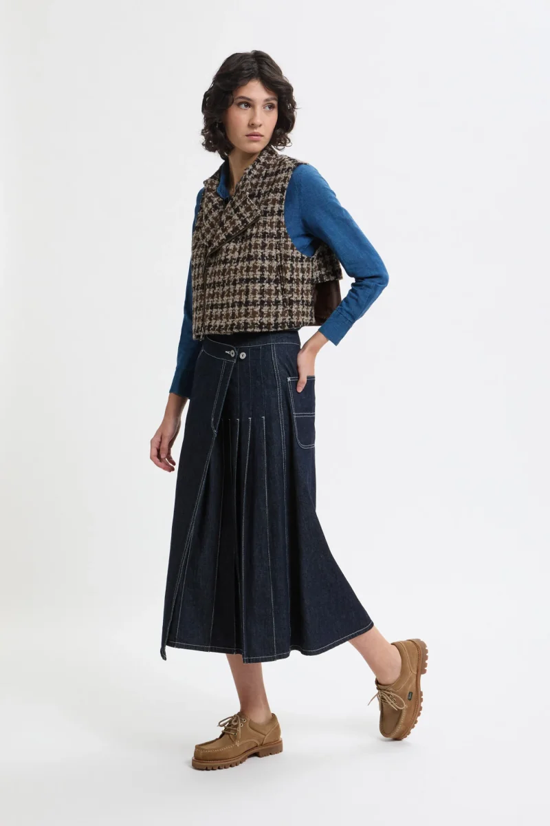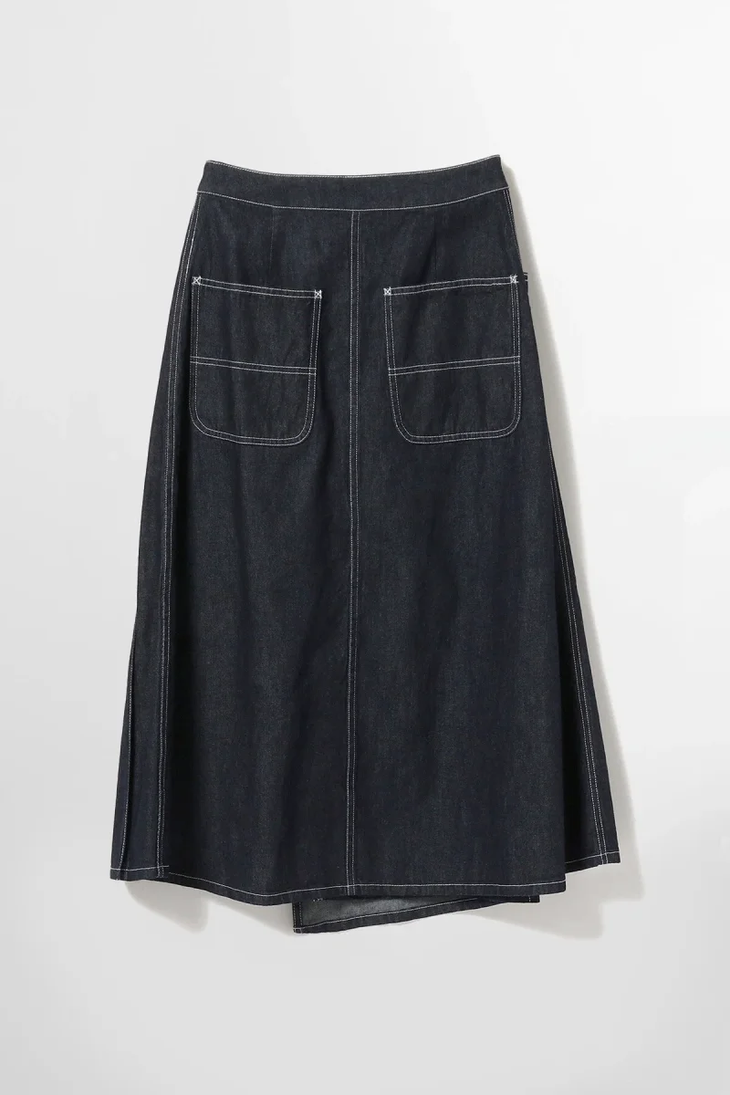 BEAMS BOY rivisita un classico in chiave workwear con questa gonna plissettata incrociata in denim. Realizzata in resistente denim indaco, presenta pieghe nette e una chiusura regolabile a portafoglio, che bilancia con naturalezza struttura e movimento. Un capo senza tempo dal tocco giocoso, perfetto sia per look casual che più ricercati.