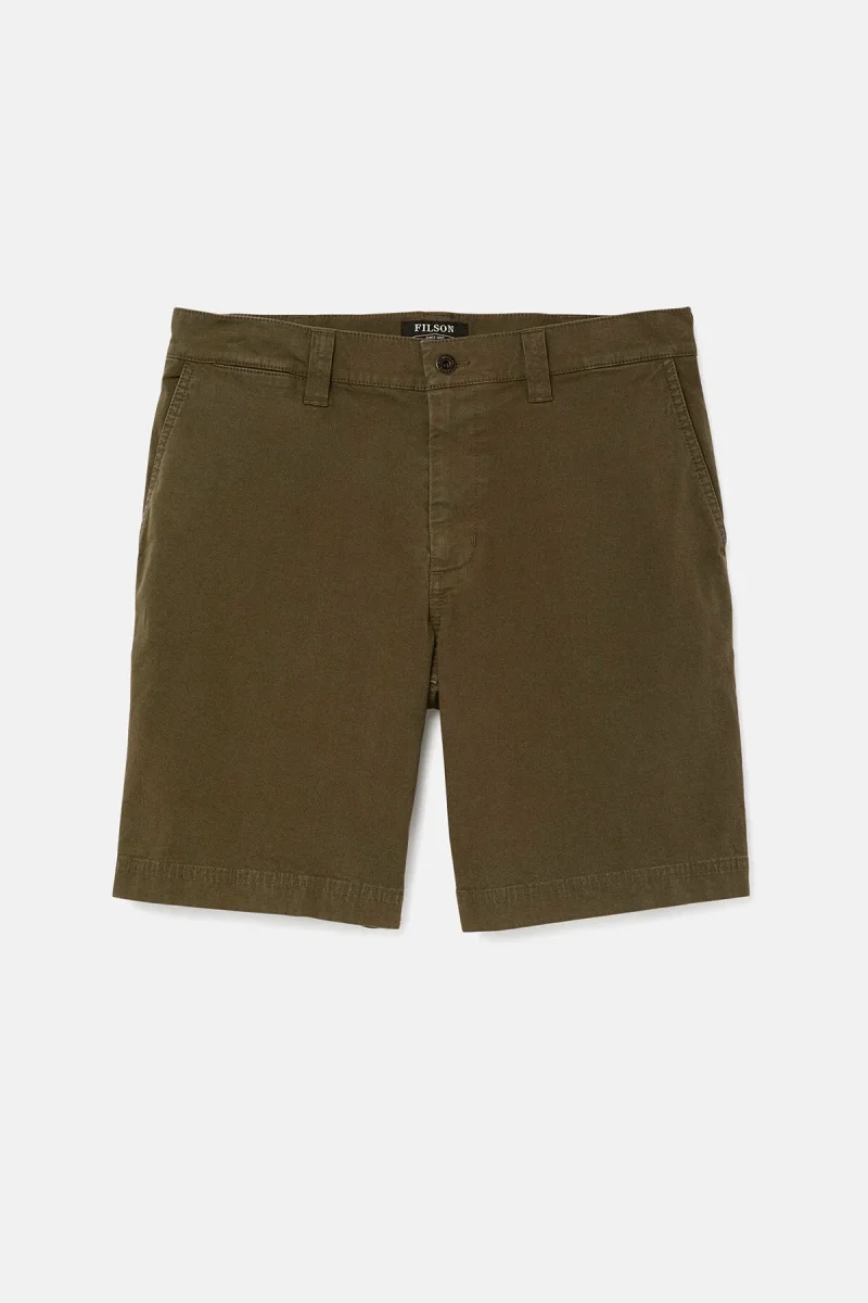 Realizzati in cotone da 269 gr con elastan elasticizzato, gli shorts Granite Mountain consentono di muoversi liberamente mentre si percorrono i sentieri. Sono provvisti di tasche oblique sul davanti e tasche posteriori a filetto. Dotati di sette passanti per cintura, vita con bottone in metallo e patta con cerniera. Una cucitura interna di 22 cm arriva appena sopra il ginocchio.