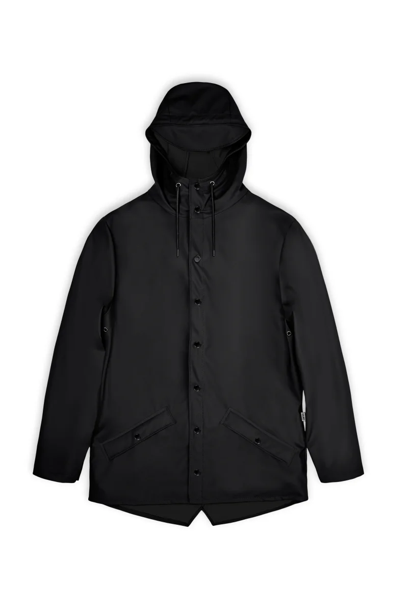 Impermeabile Rains 12010 con bottoni frontali, tasche e cappuccio regolabile, colore nero.