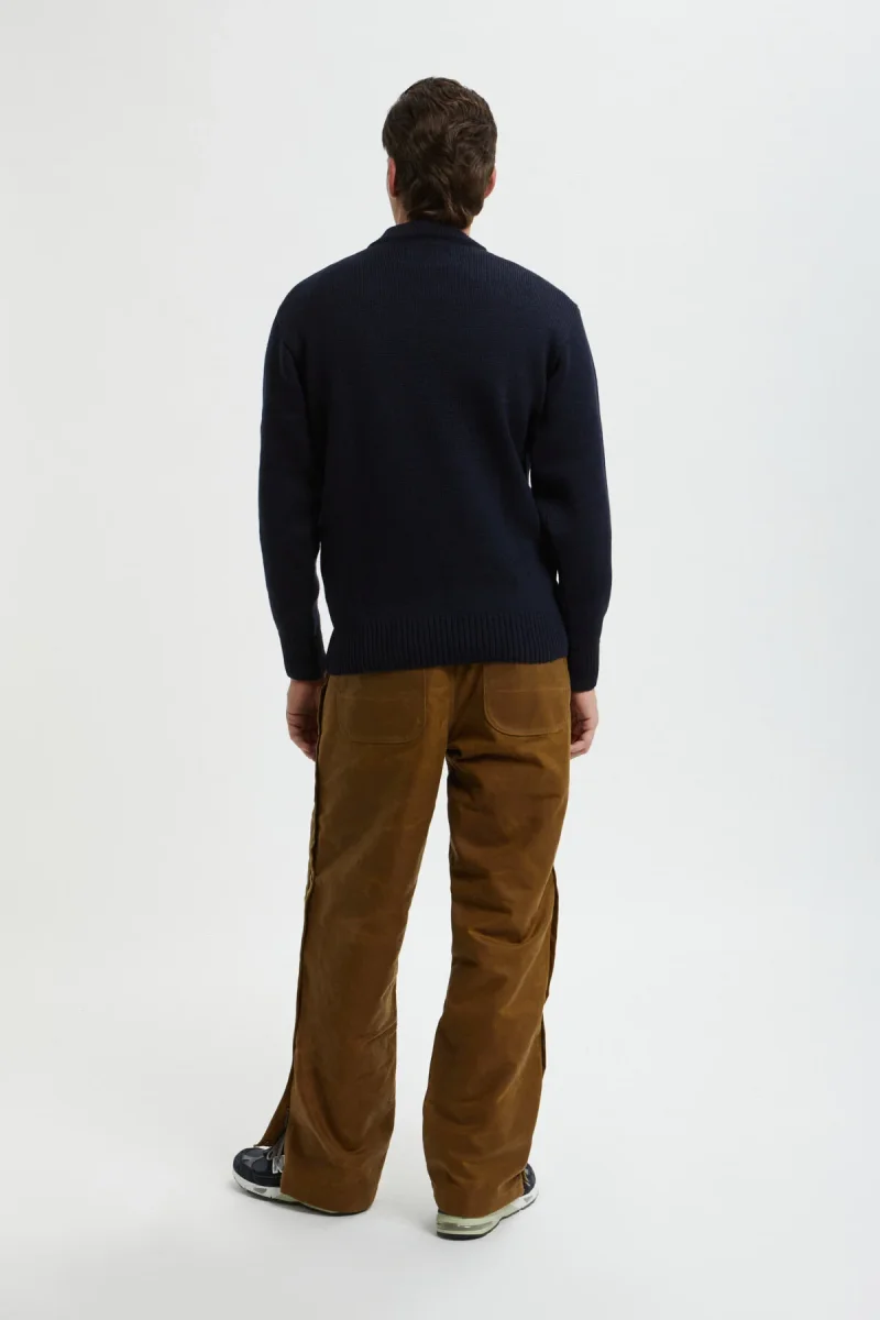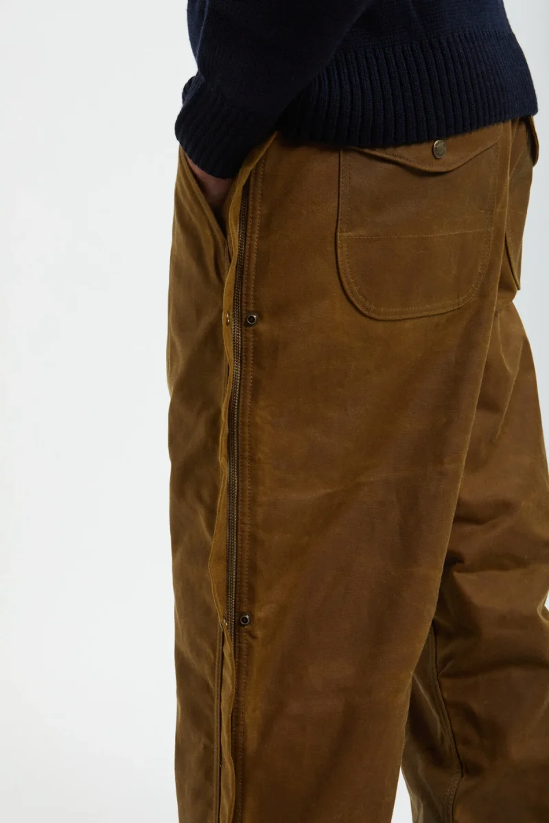 Questi pantaloni con sistema isolante in Tin Cloth uniscono la lunga durata e l’impermeabilità dimostrate sul campo dal nostro tessuto iconico a un sistema isolante trapuntato che assicura calore e protezione in caso di temperature rigide e clima umido. Sul posto di lavoro o in mezzo a una fitta boscaglia, il Tin Cloth non teme fori, strappi e abrasioni. Il sistema isolante in polyfill, invece, è leggero, isola anche da bagnato ed è in grado di asciugarsi rapidamente. Ampio quanto basta per poter essere indossato sopra un paio di pantaloni da lavoro, il modello comprende delle zip a tutta lunghezza con protezione antipioggia, che offrono versatili possibilità di ventilazione e li rendono più facili da indossare sopra gli stivali. I sette passanti in vita ne impediscono il cedimento e sono accostati a un bottone per bretelle, utile ogni volta che si rende necessario un sostegno supplementare. Le profonde tasche anteriori all’americana sono accostate dalle tasche posteriori con patta e bottoni a pressione. Il capo può essere cerato nuovamente, all’occorrenza, per preservarne l’impermeabilità. Chiusura con zip.
