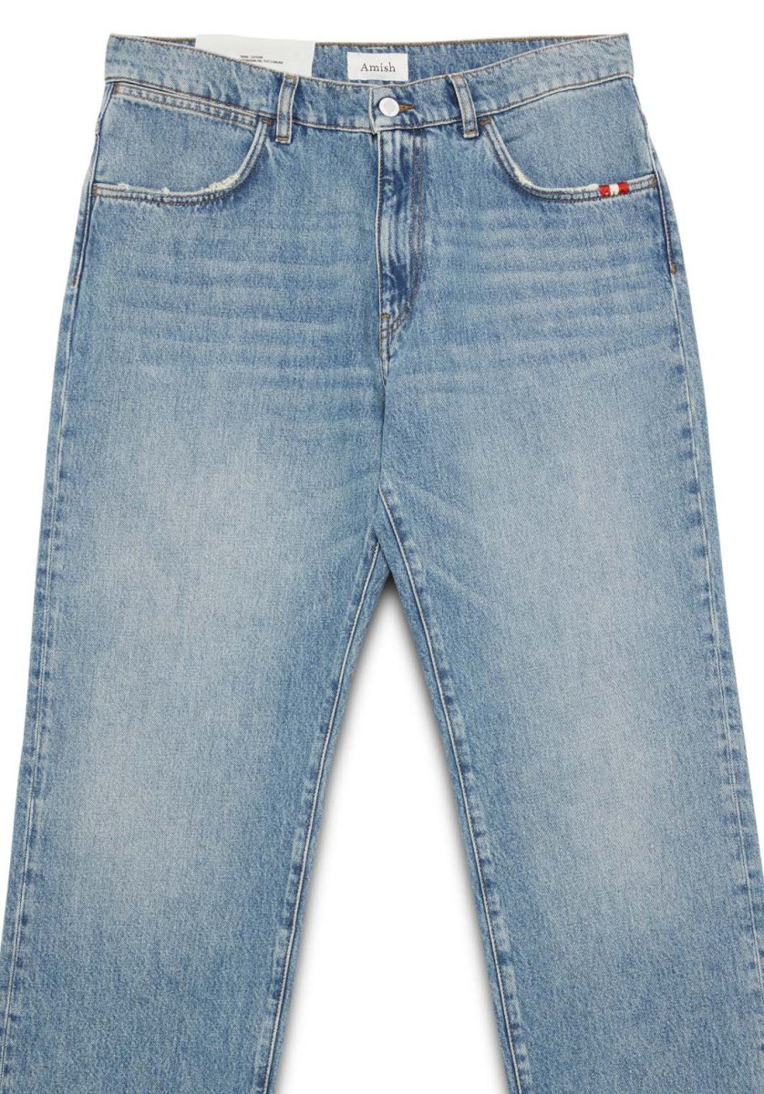 Jeans del brand italiano Amish con vita media con passanti e passante in tessuto logato sul retro. Fit loose abbondante e lavaggio tinto con schiaritura.