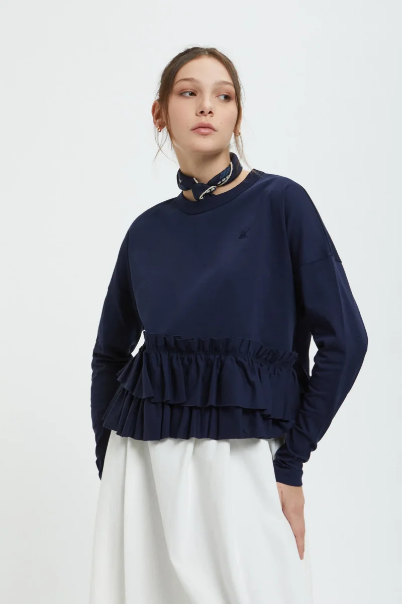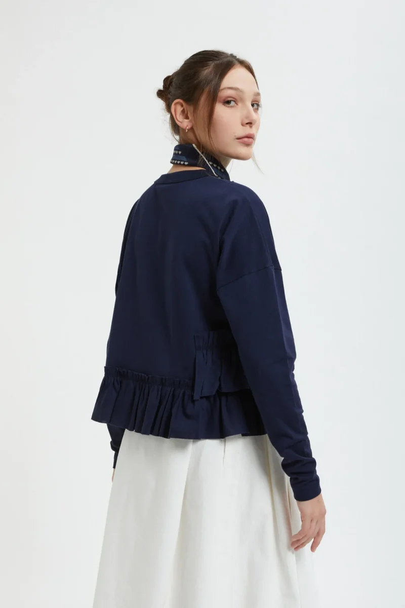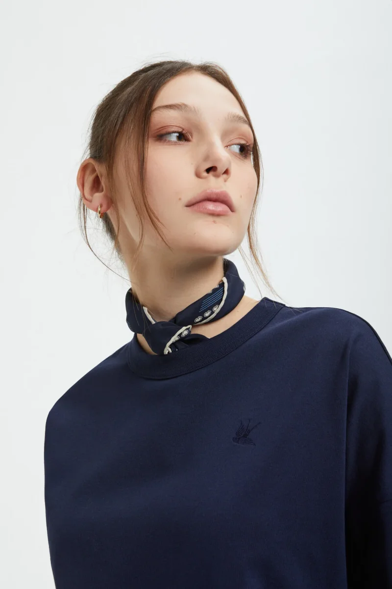 Questo top presenta un design audace con rondini ricamate, icona di RHODOLIRION. Ampie frange sono applicate in un motivo a spirale attorno alla vita, creando una silhouette a forma di A. Realizzato in jersey Basco 100% cotone, lavorato a maglia stretta con filo di cotone liscio. È un capo base che può essere facilmente sovrapposto come strato interno o indossato da solo.