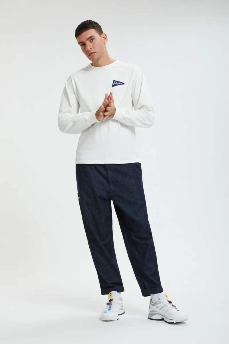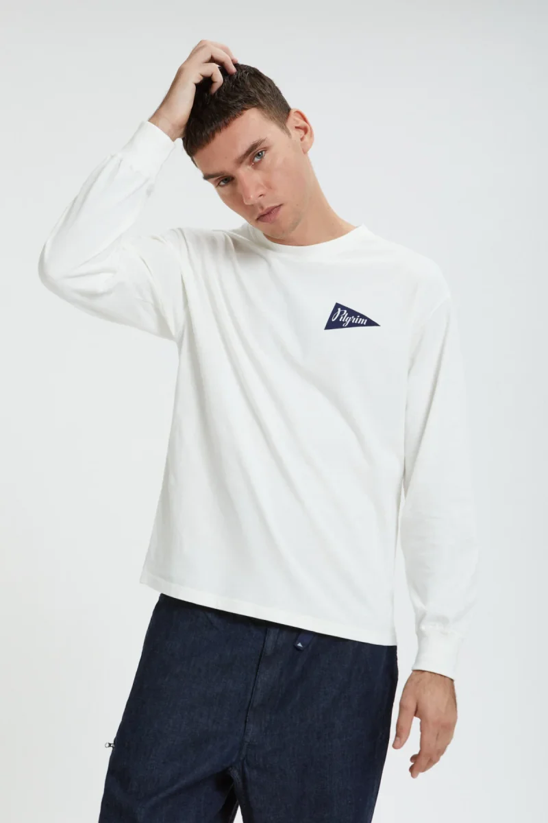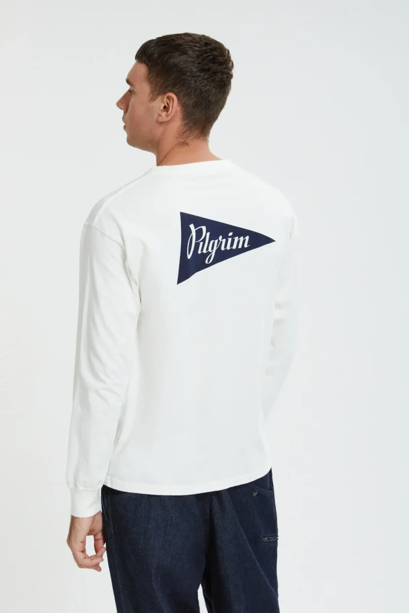 Pilgrim Surf Supply è un marchio di abbigliamento fondato da Chris Gentile, ispirato dalla visione romantica che Gentile ha della cultura del surf. La Pilgrim LS Pennant Team Tee è una maglia a maniche lunghe realizzata in Giappone in 100% cotone. Il logo Pilgrim Surf Supply completa il capo.