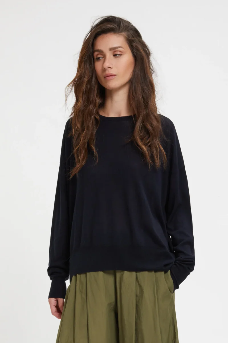 Maglia girocollo a maniche lunghe in seta e cashmere. La vestibilità over offre il massimo del comfort e della libertà di movimento.