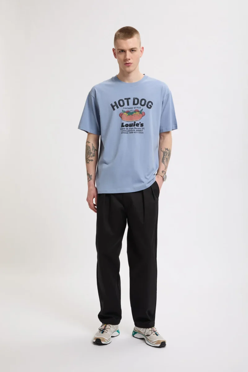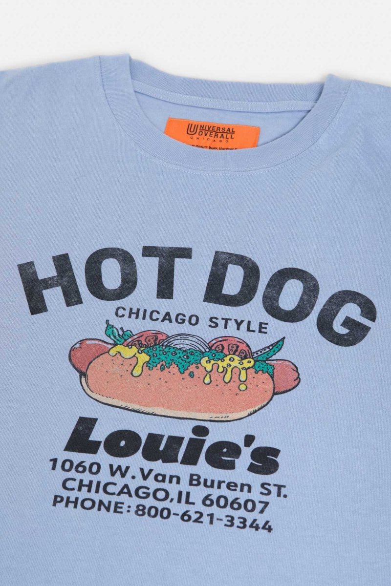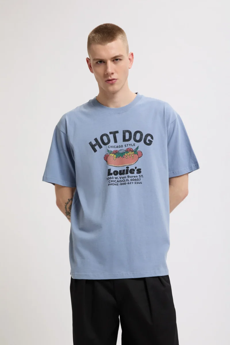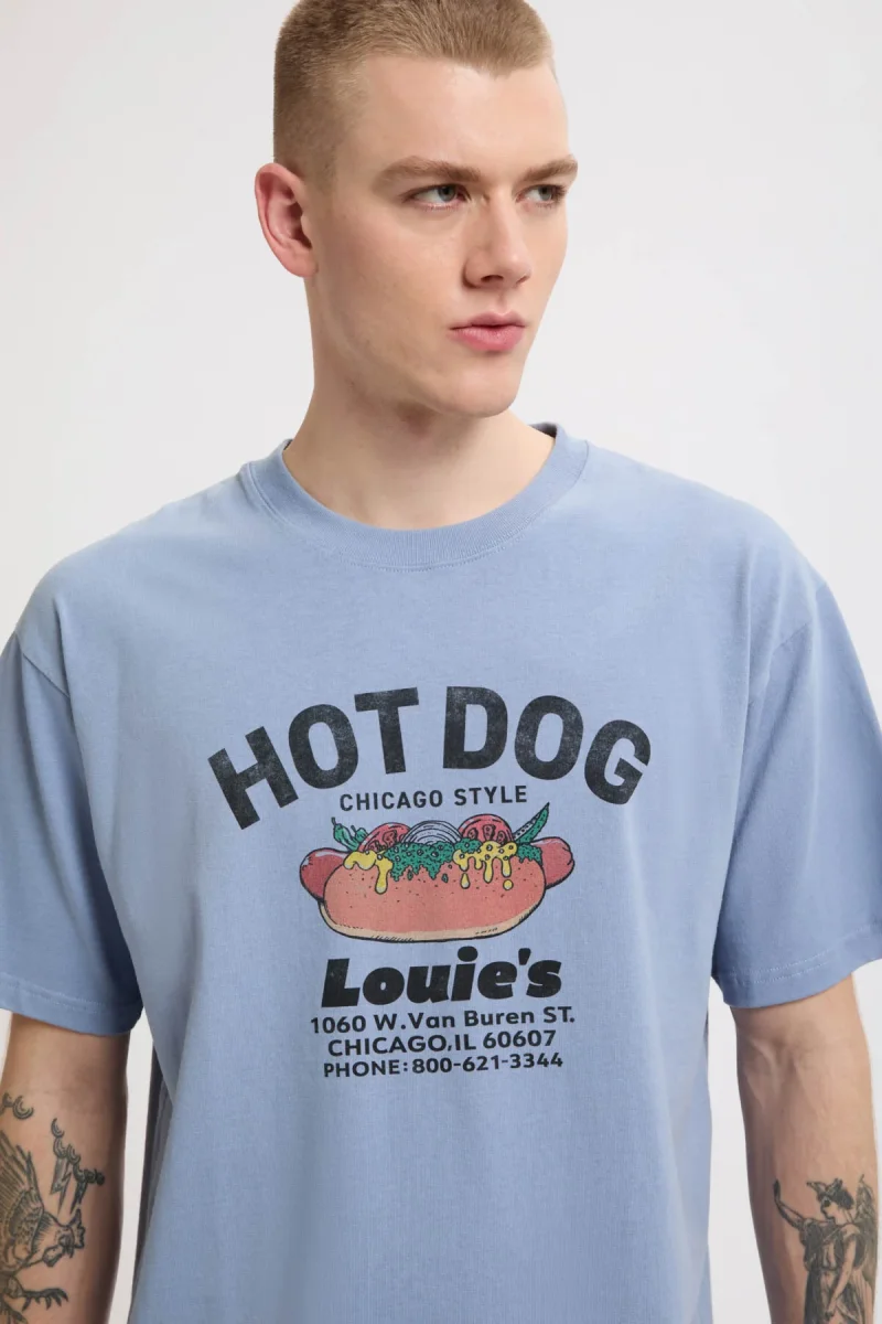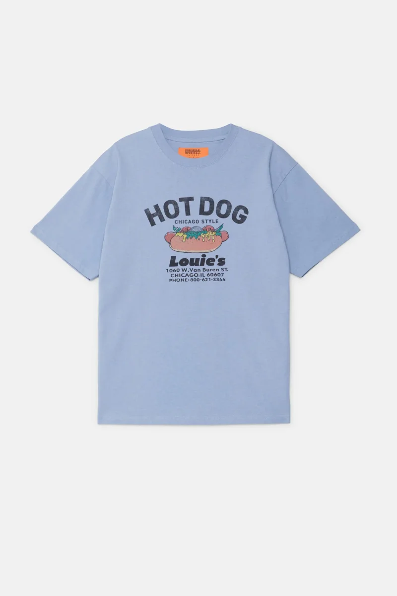 Questa T-shirt grafica è ispirata a un chiosco immaginario di hot dog in stile Chicago e presenta un’illustrazione originale disegnata a mano, che richiama l’estetica del classico merchandising souvenir.