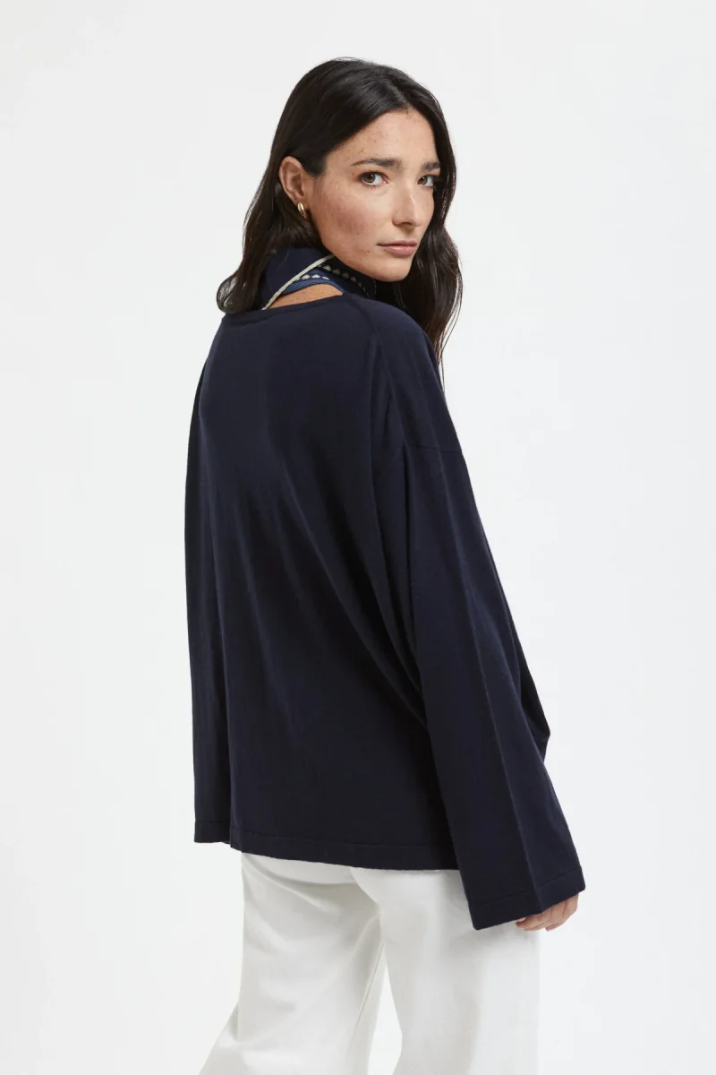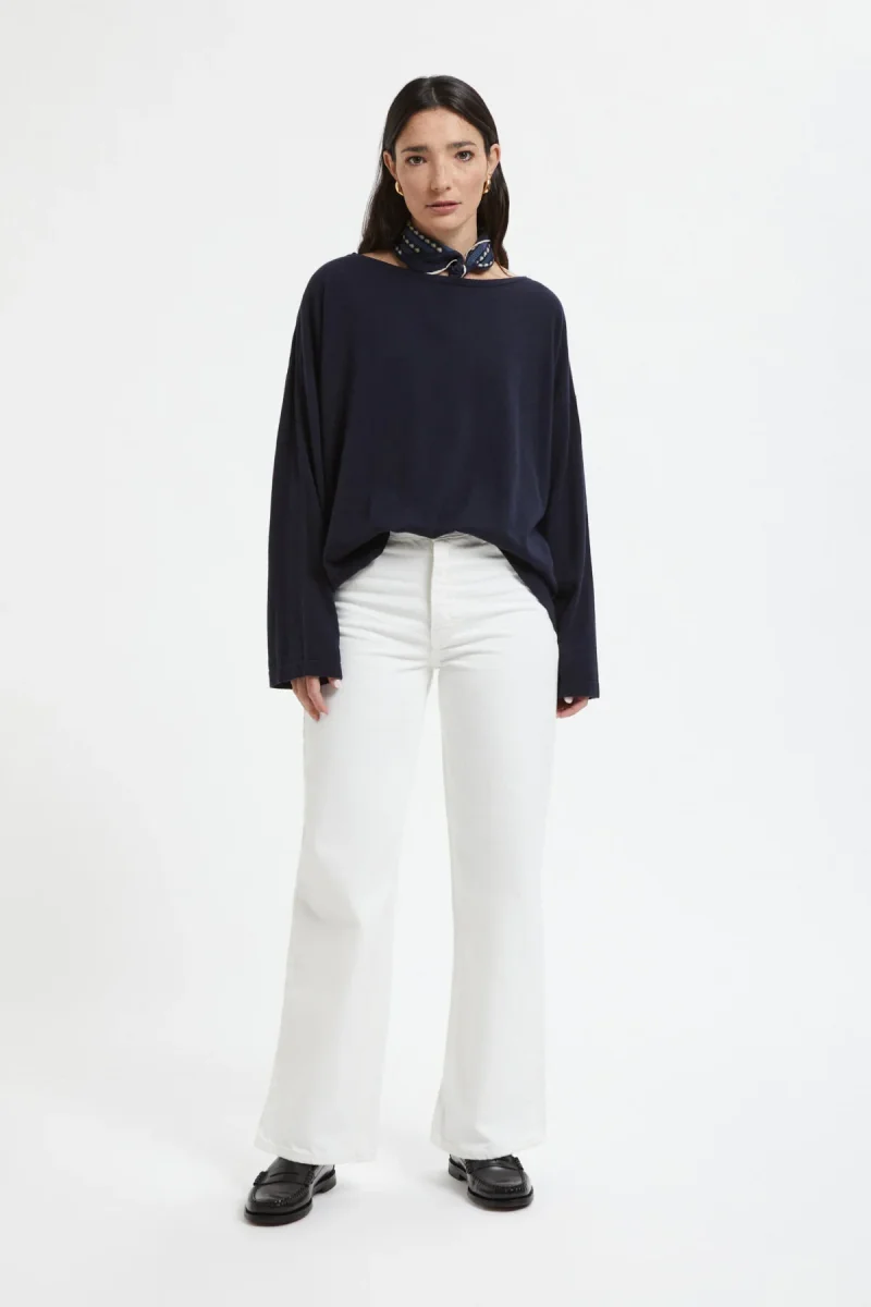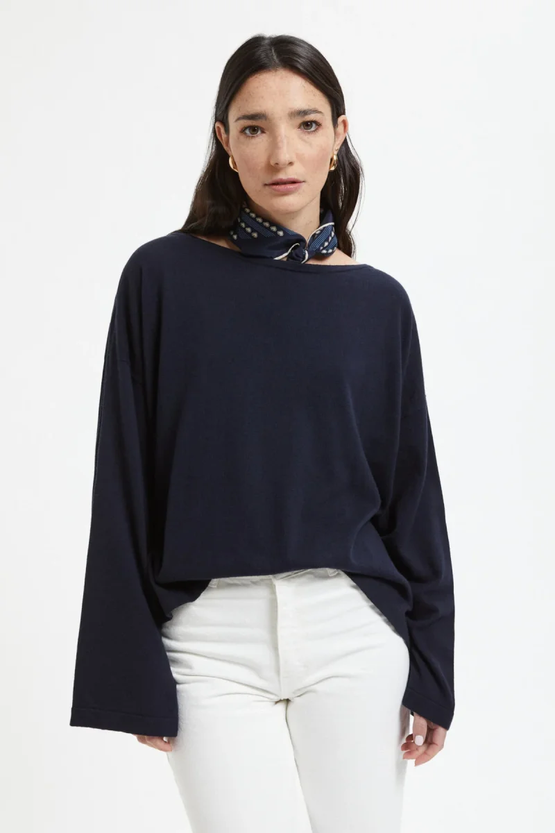 Maglione a maniche larghe in cotone e cashmere. Il materiale è morbido al tatto e può essere lavato a mano. Questo prodotto presenta uno scollo a barchetta e maniche larghe. È facile da abbinare a vari pantaloni e può essere indossato in un’ampia gamma di stagioni.