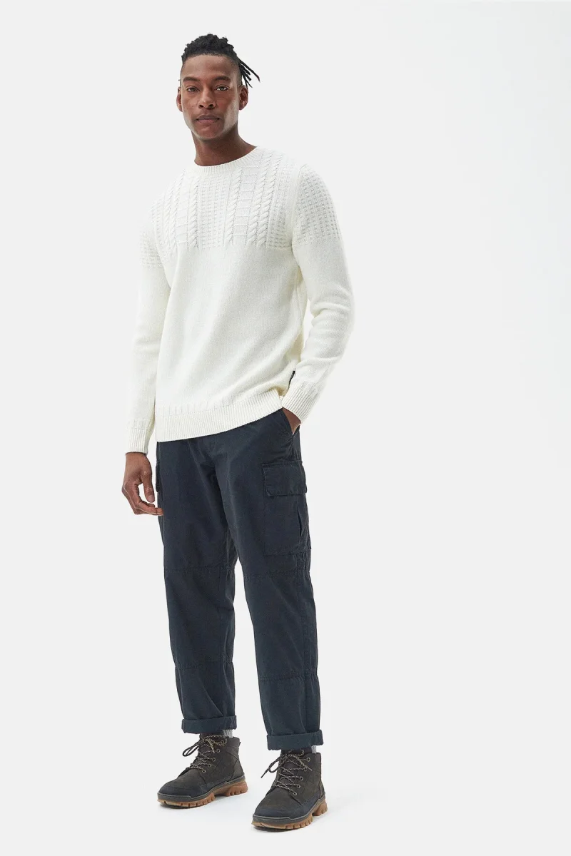 Contraddistinto da una vestibilità regular che dona un’ottima libertà di movimento, il maglione girocollo lavorato Foremast di Barbour riprende le tecniche artigianali della tradizione con il suo pattern in maglia a coste in stile pescatore. La trama liscia nella sezione inferiore rende moderno il look, e l’etichetta Barbour 55 in corrispondenza della cucitura laterale ne riconferma la qualità.