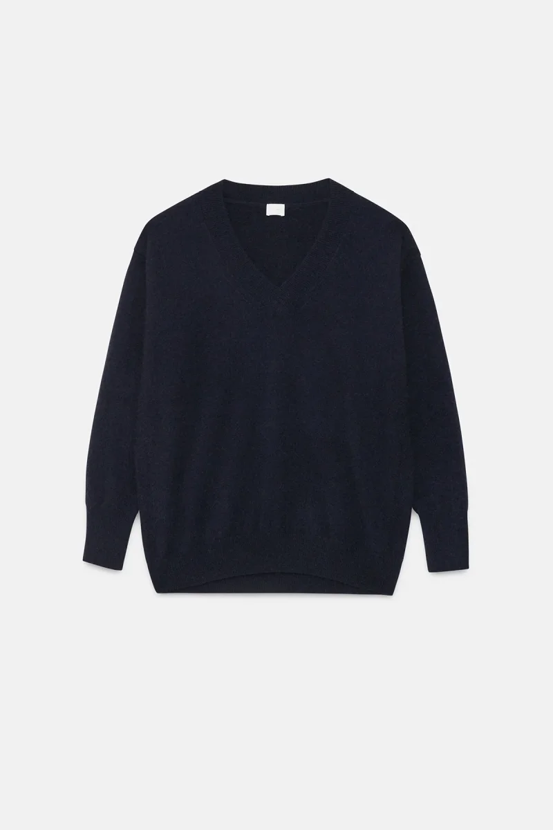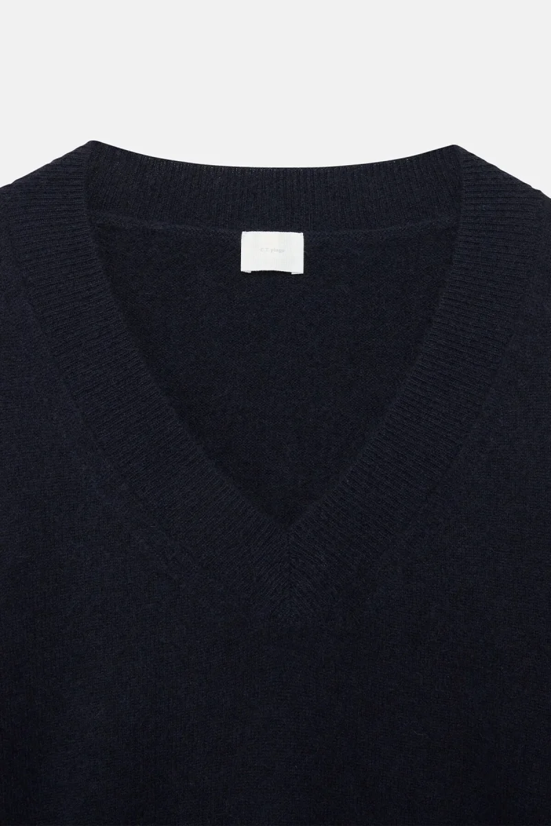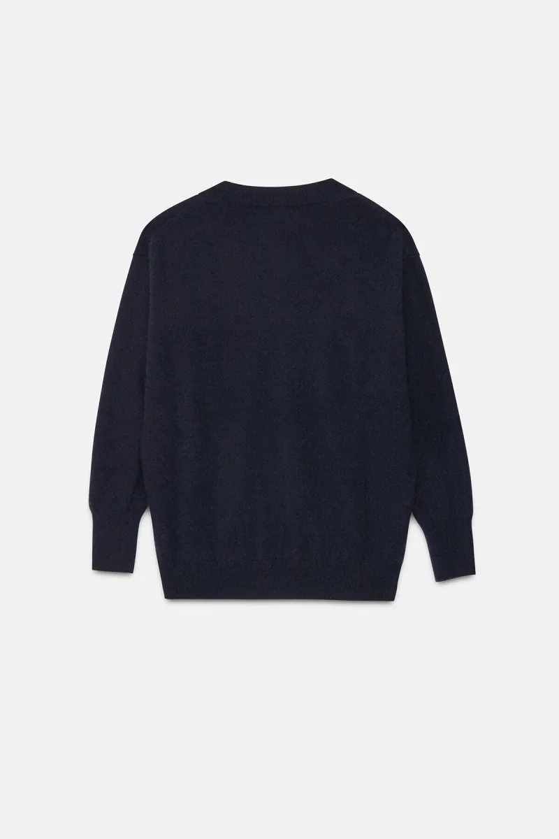 Maglia con profondo scollo a V, a maniche lunghe, in lana di procione misto cashmere. Il fondo, i polsini e lo scollo presentano una lavorazione a costine.