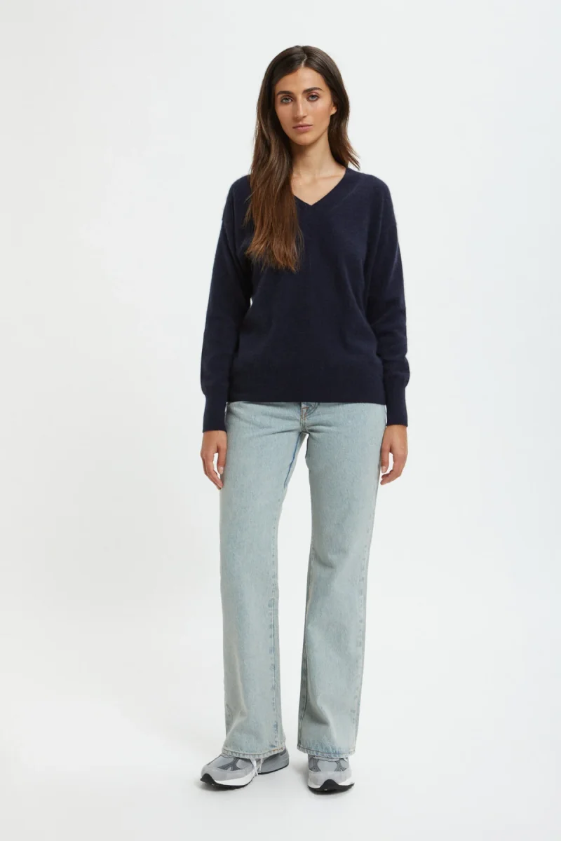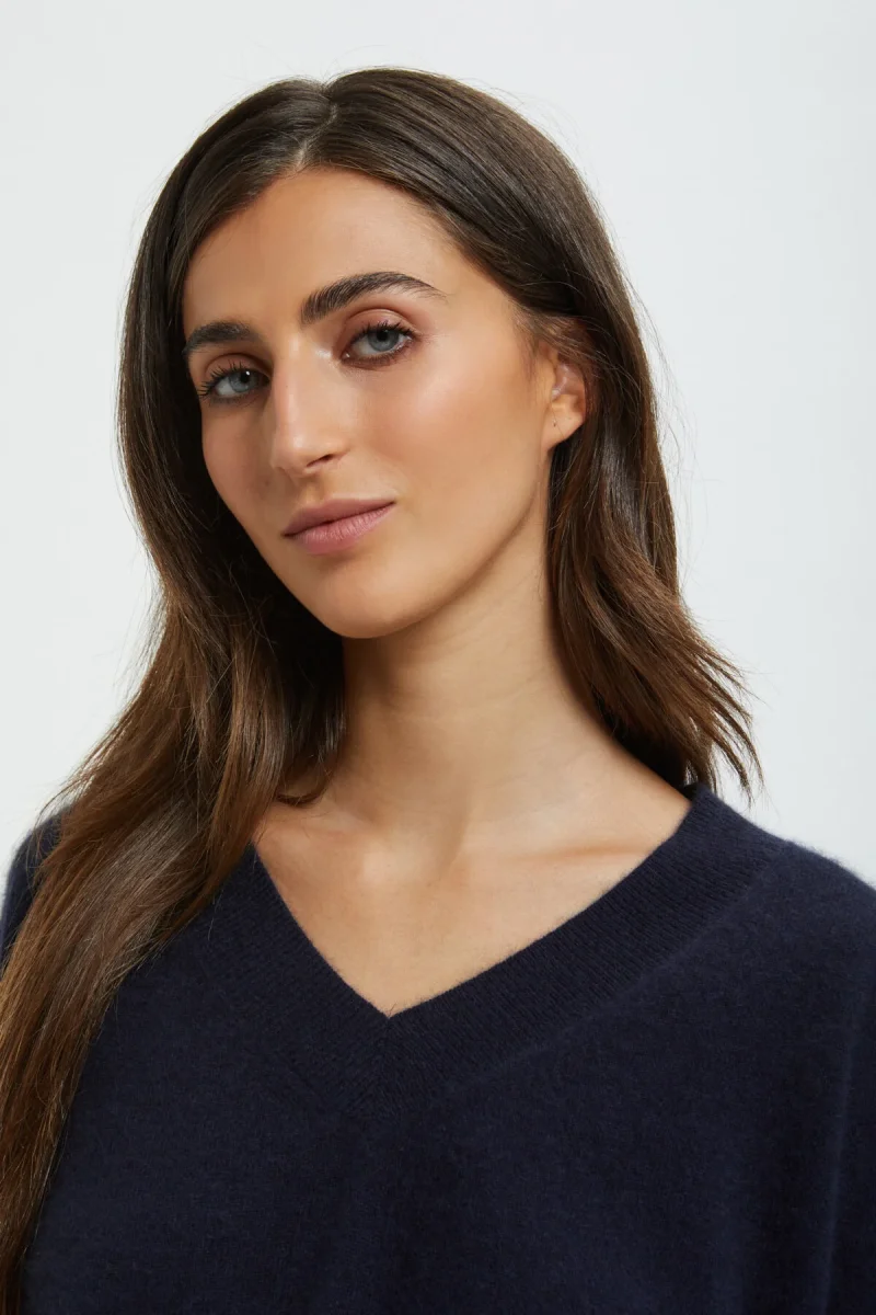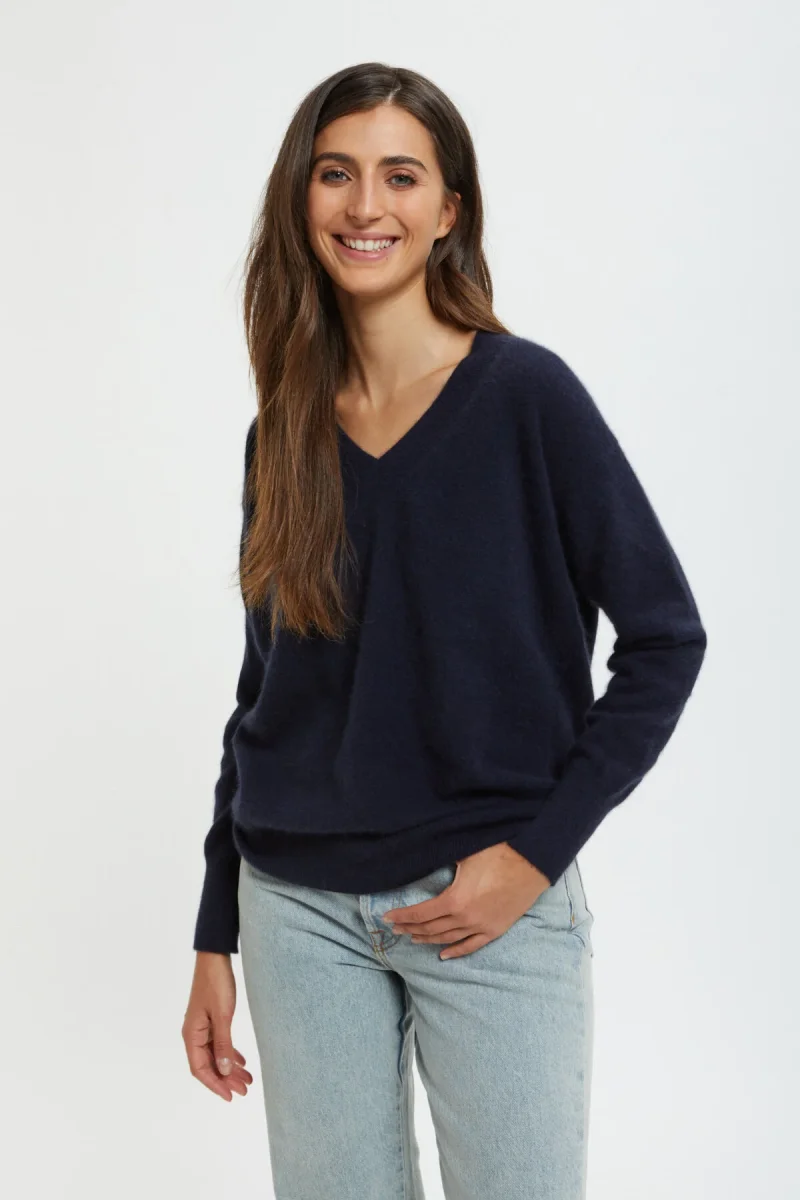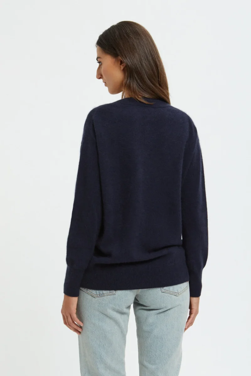 Maglia con profondo scollo a V, a maniche lunghe, in lana di procione misto cashmere. Il fondo, i polsini e lo scollo presentano una lavorazione a costine.
