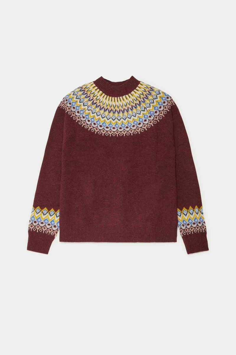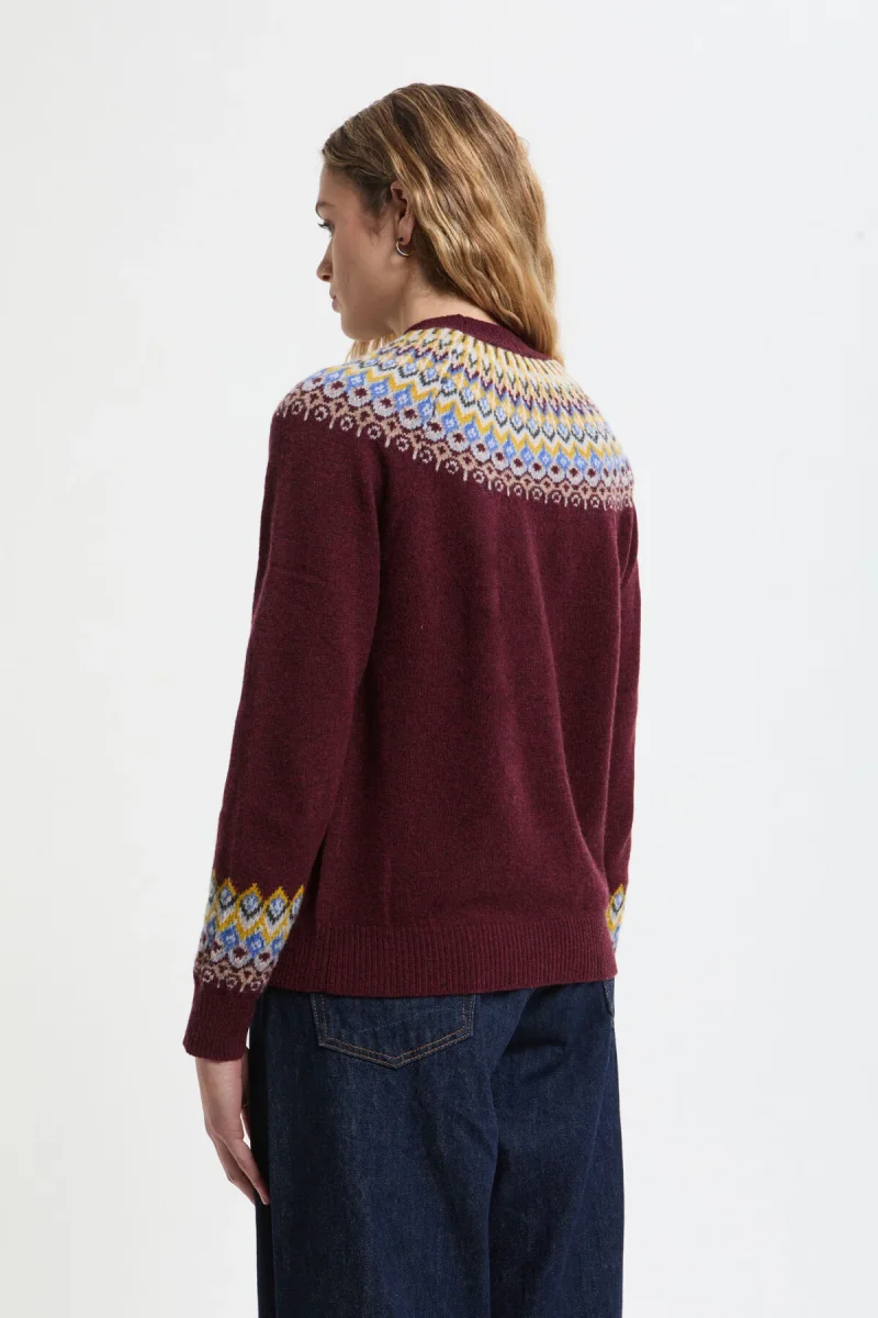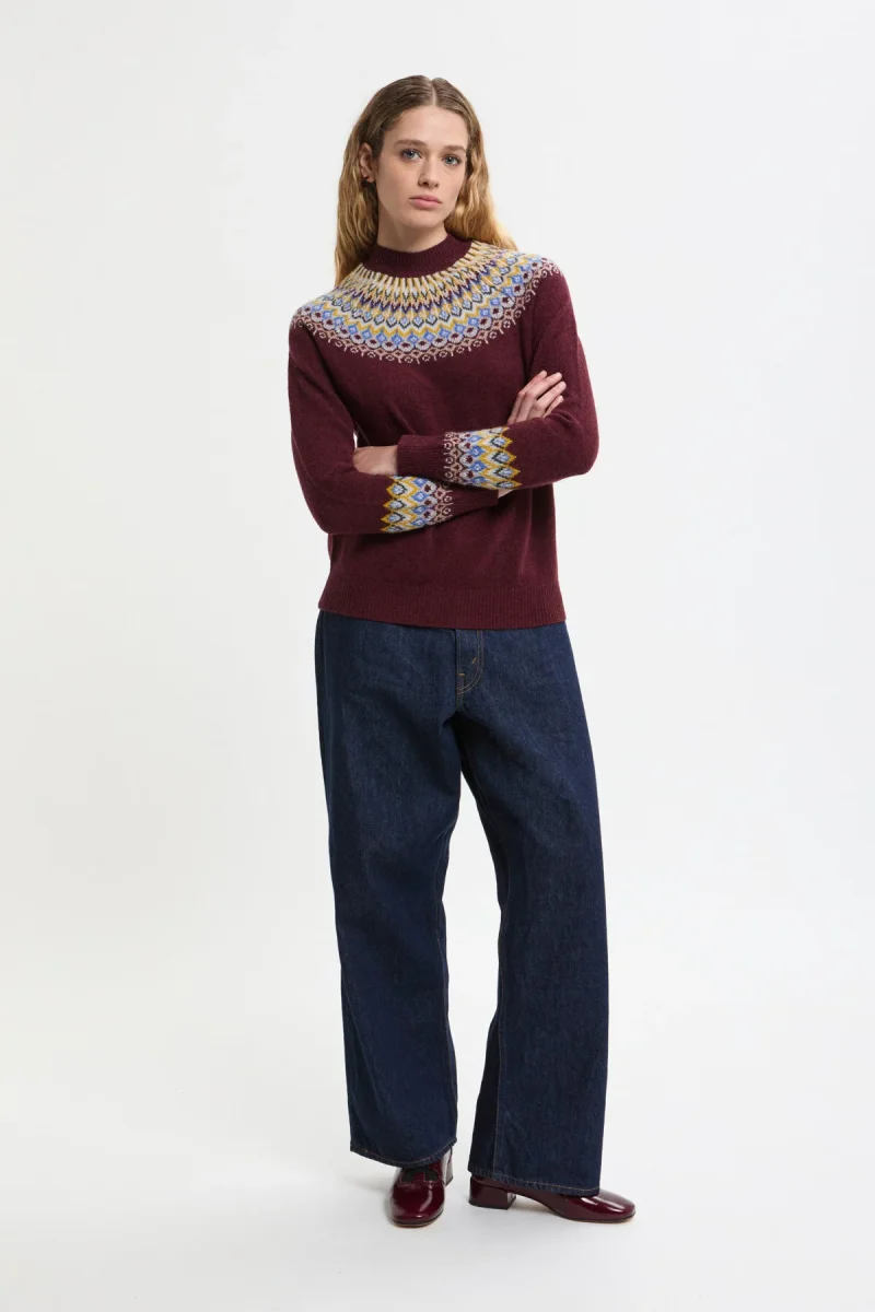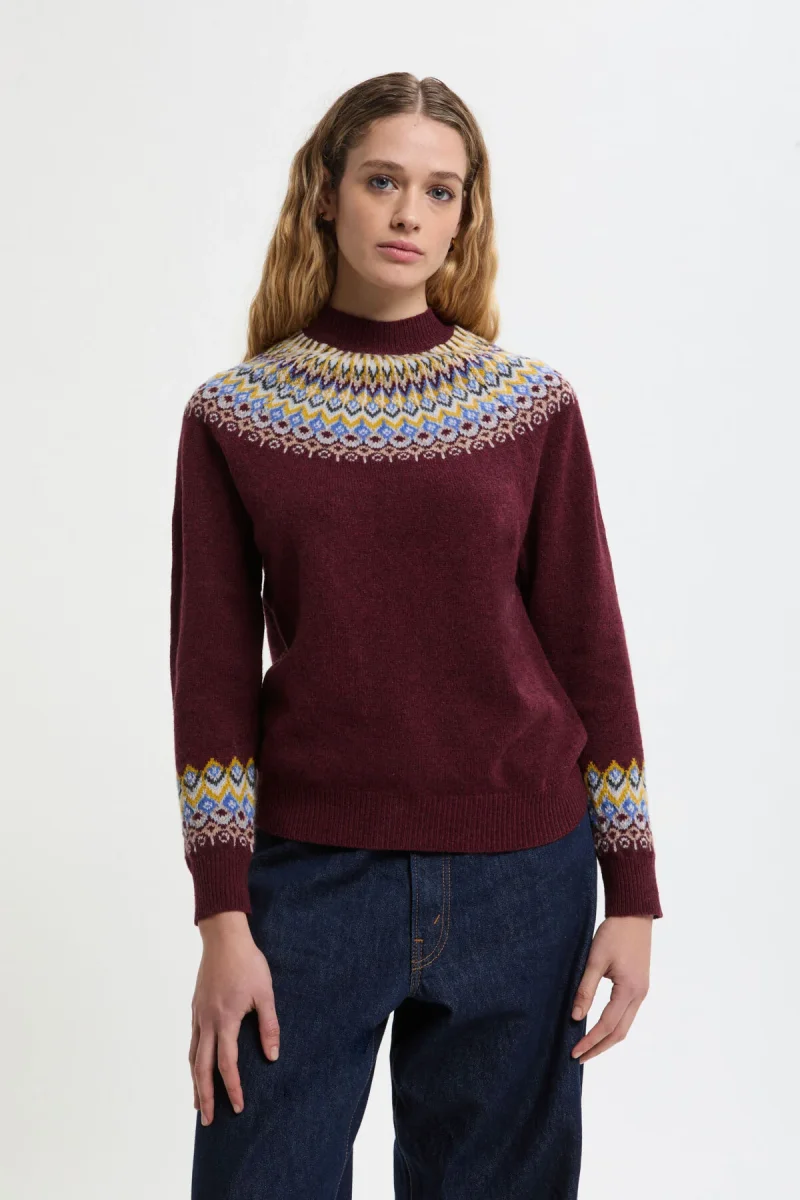 Il maglione Selmanita affascina con il suo raffinato filato mélange e il collo alto a coste. Il suo motivo Fair Isle, direttamente ispirato alle tradizioni scozzesi, aggiunge un tocco di autenticità e carattere. Questo motivo a maglia in rilievo, emblematico delle Isole Shetland, dona profondità e calore a questo capo casual-chic.