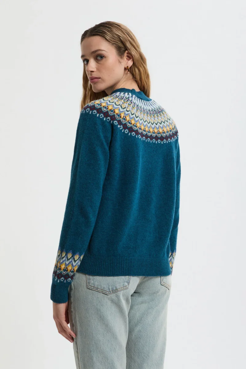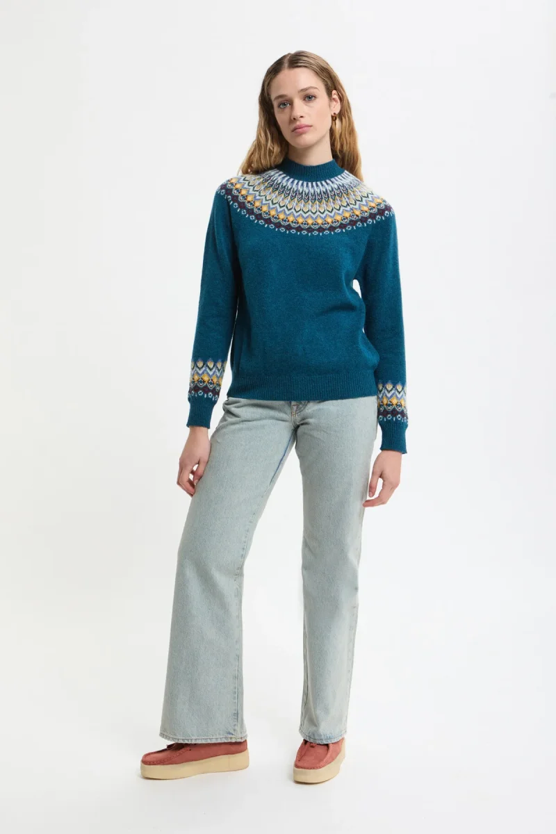 Il maglione Selmanita affascina con il suo raffinato filato mélange e il collo alto a coste. Il suo motivo Fair Isle, direttamente ispirato alle tradizioni scozzesi, aggiunge un tocco di autenticità e carattere. Questo motivo a maglia in rilievo, emblematico delle Isole Shetland, dona profondità e calore a questo capo casual-chic.
