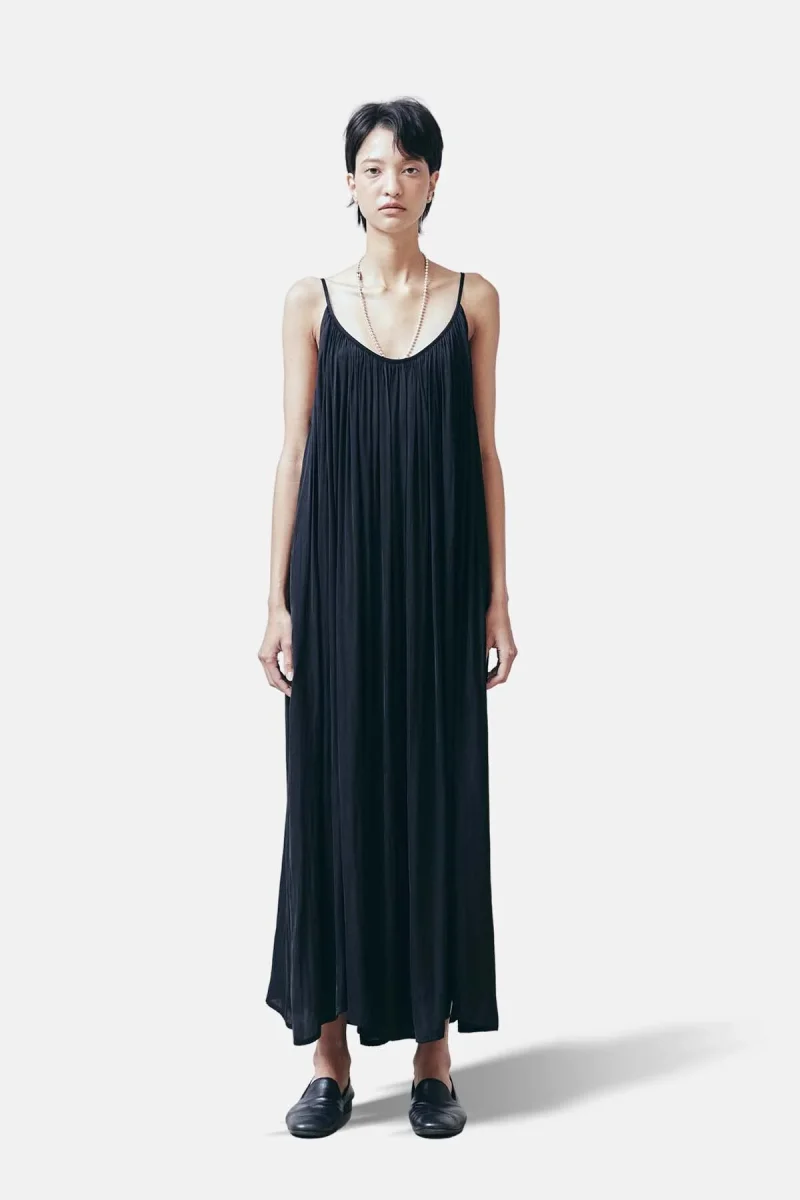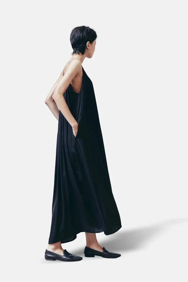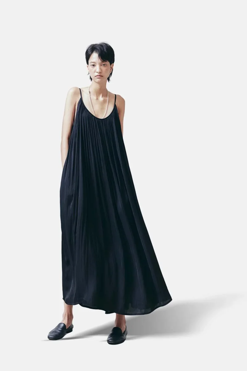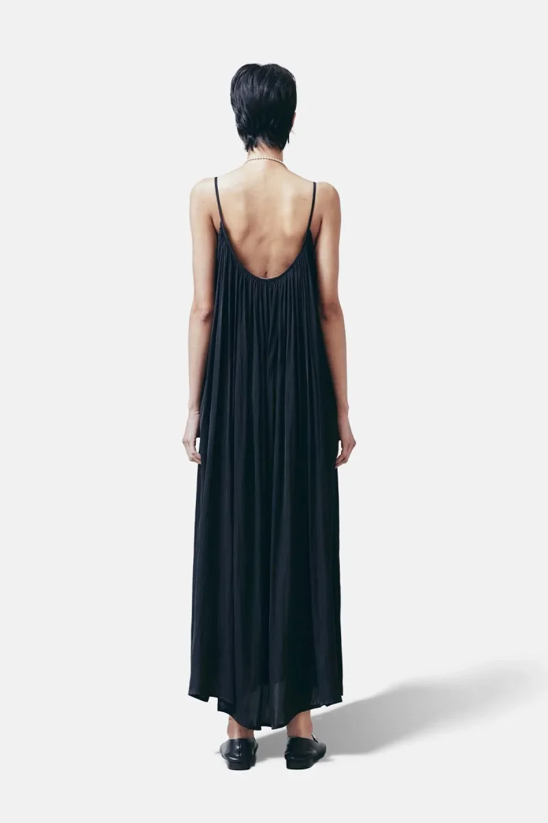 Maxi abito plissettato senza maniche con scollatura profonda sul retro.