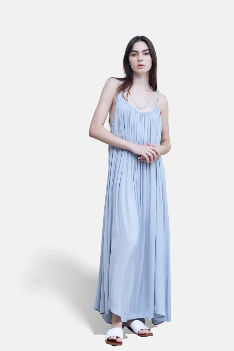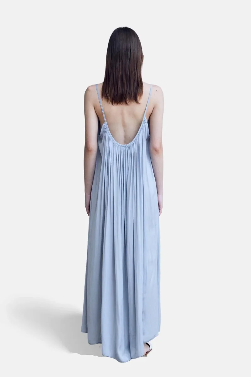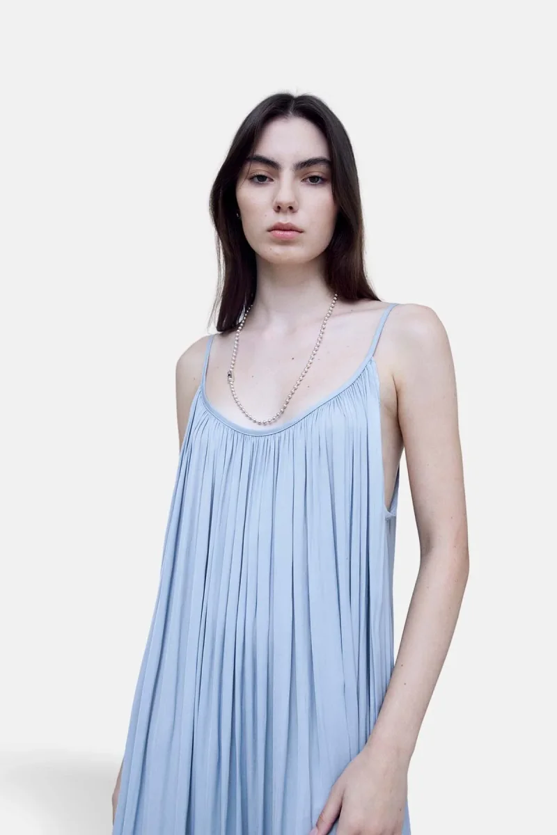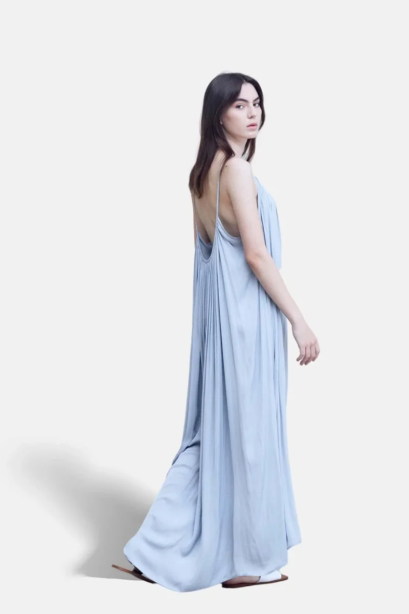 Maxi abito plissettato senza maniche con scollatura profonda sul retro.