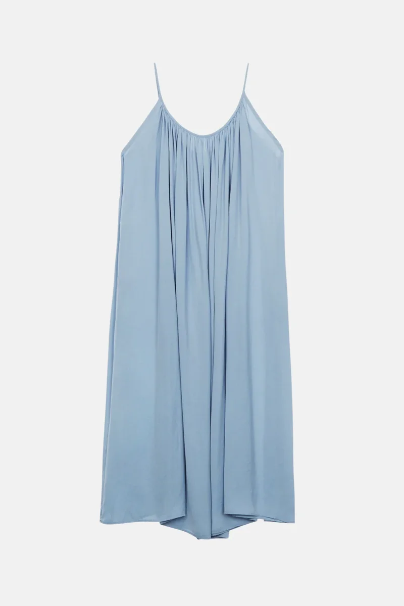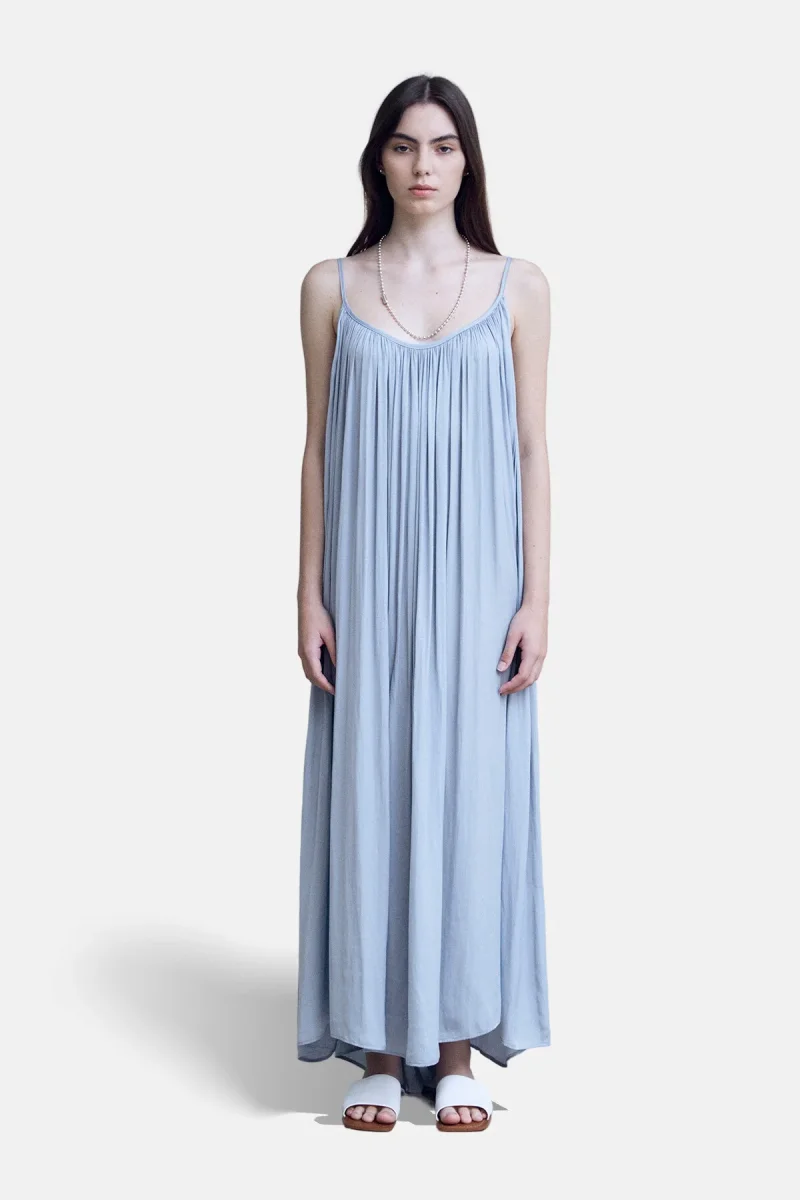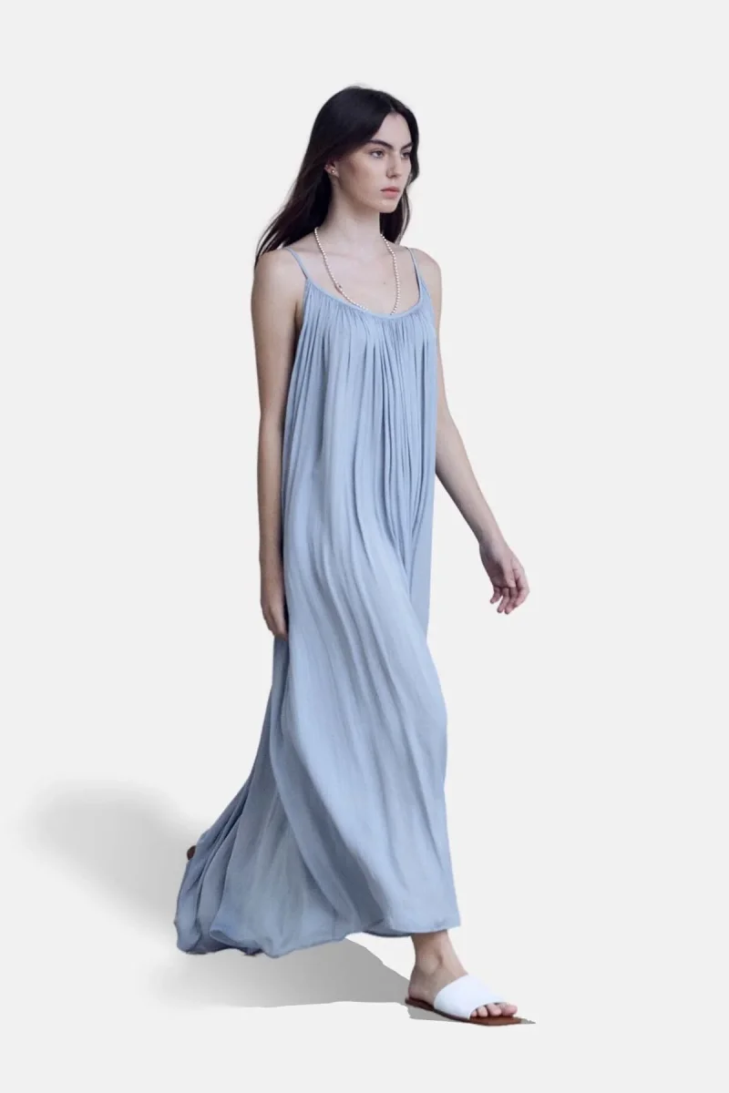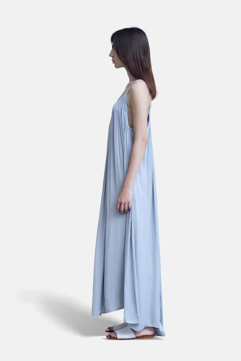 Maxi abito plissettato senza maniche con scollatura profonda sul retro.