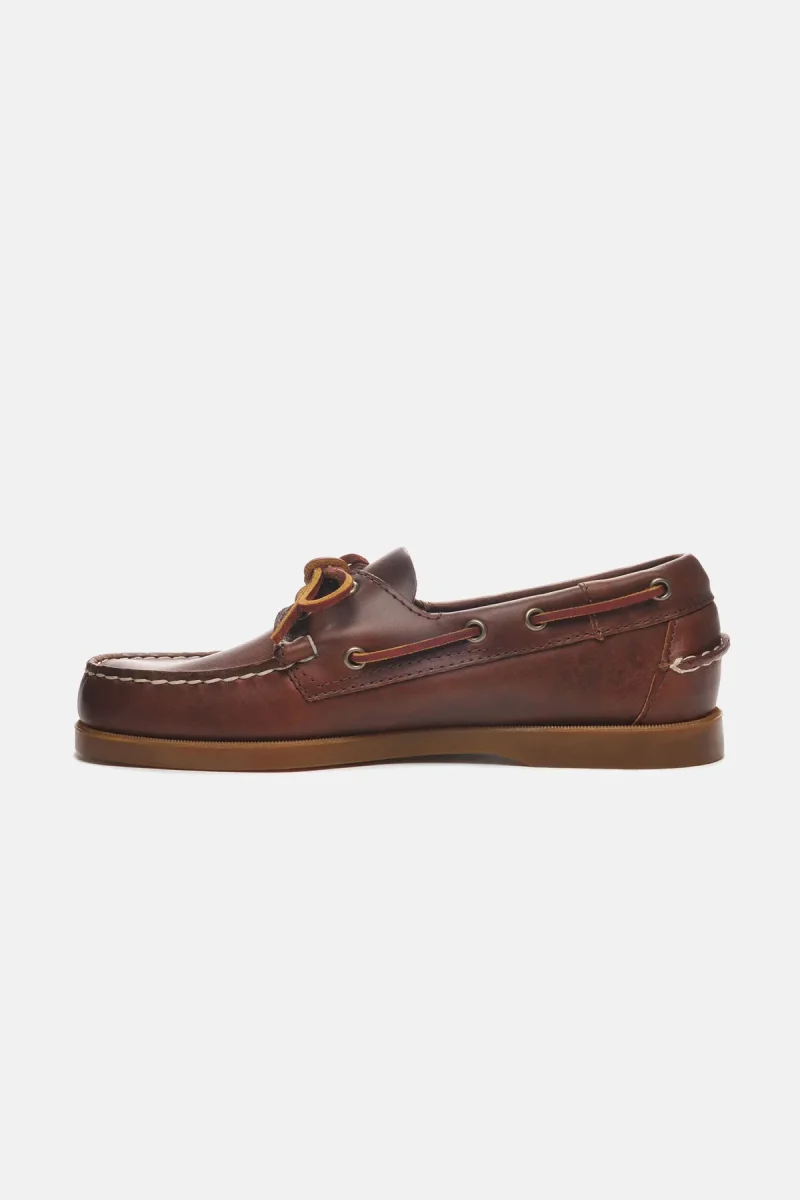 Realizzata in un unico pezzo di cuoio “pull-up” cucito a mano, questa resistente scarpa da barca è pensata per affrontare il mare. Con il tempo, la pelle cerata sviluppa una patina unica, raccontando la tua storia ad ogni passo. Soletta in pelle, allacciatura a 360° e suola in gomma antiscivolo non-marking garantiscono comfort e stabilità. Ispirata a Portland, storico porto marittimo e sede dell’omonimo Yachting Club.