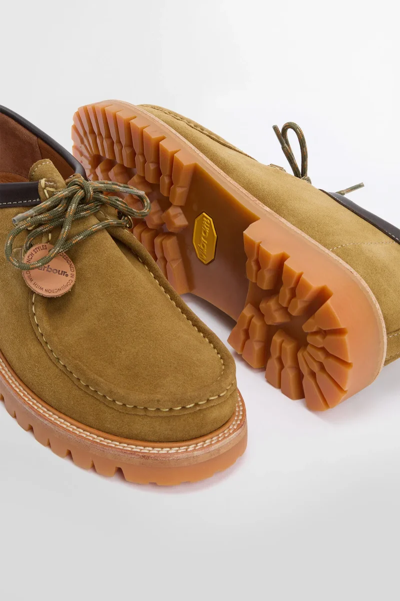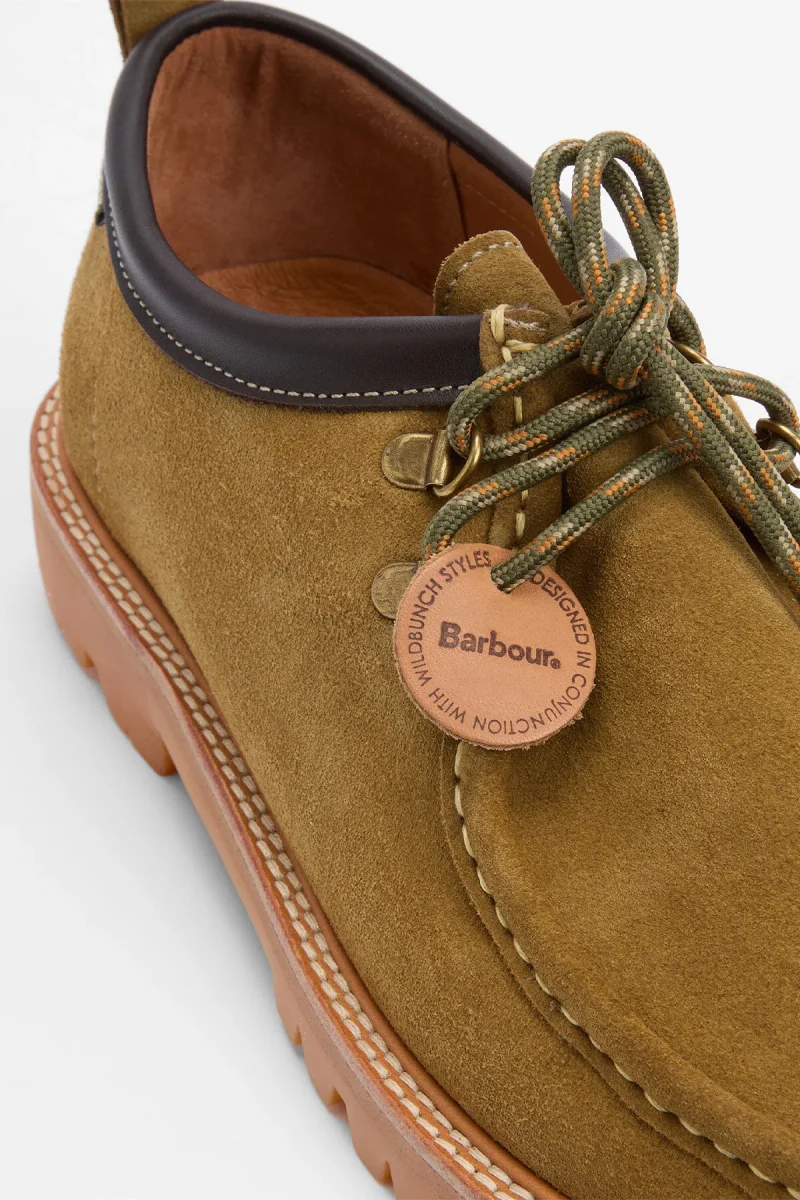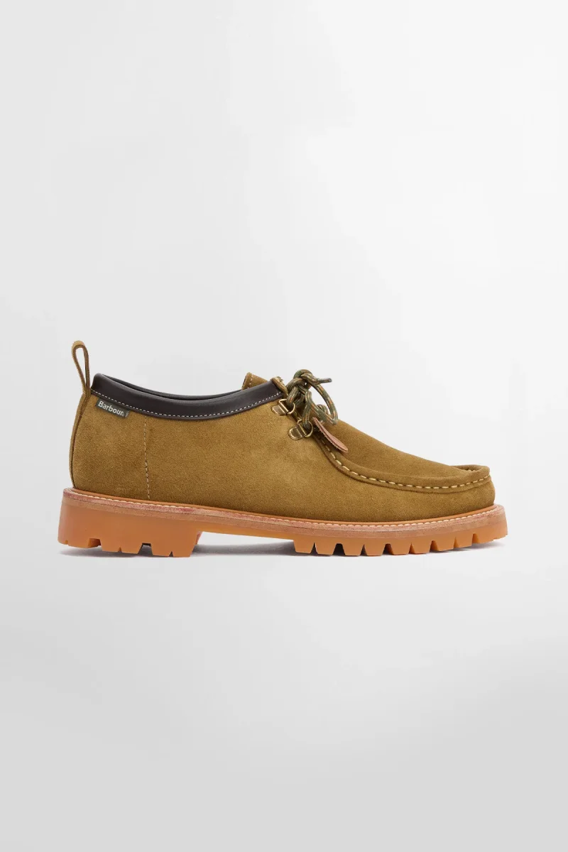 Realizzati a mano in Spagna con un’attenzione meticolosa per la qualità e i dettagli, i mocassini stringati con mascherina Coatham Barbour x Wildbunch Styles vantano i materiali più pregiati, con una struttura interamente in pelle scamosciata e una lussuosa fodera in pelle. Dotati di suola Vibram al servizio di una trazione e un’aderenza ottimali, presentano lacci intercambiabili e occhielli a D in ottone anticato, ispirati ai bottoni a pressione delle inimitabili giacche cerate Barbour.