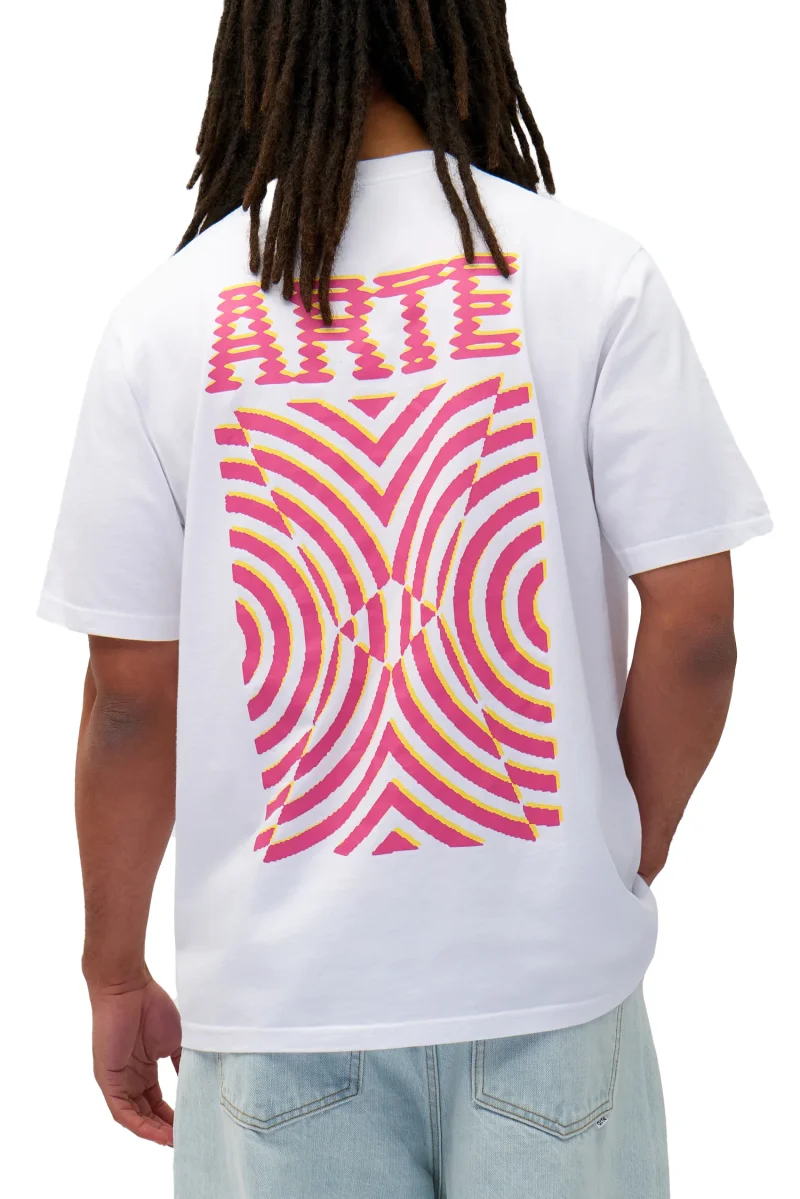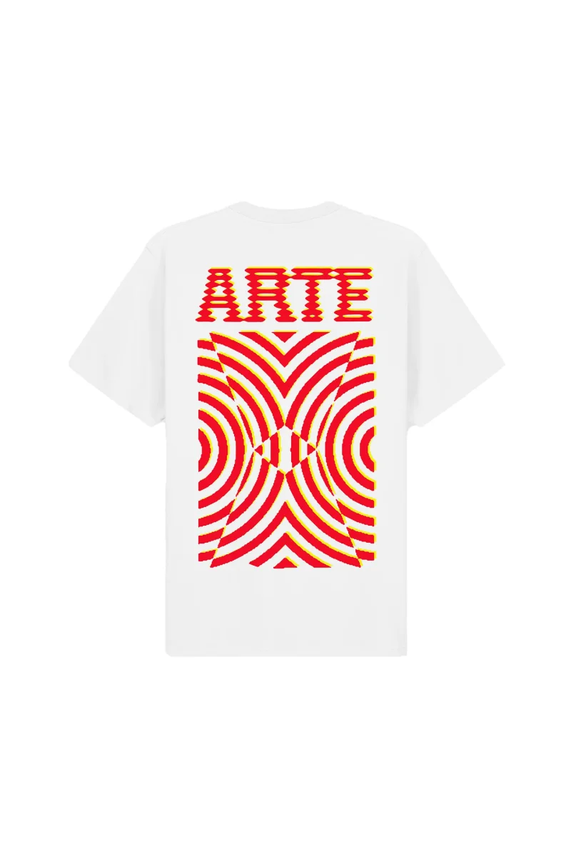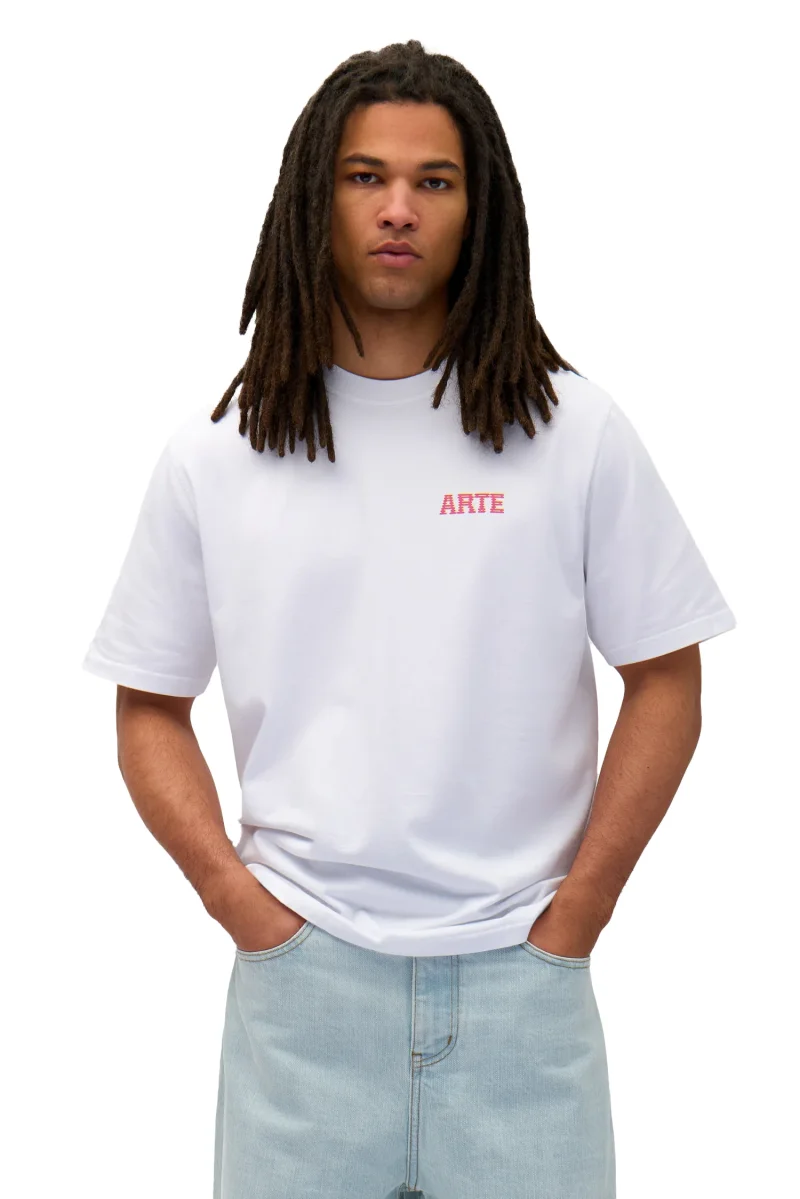 Realizzata in cotone premium heavyweight, questa T-shirt bianca ha una vestibilità rilassata, un girocollo leggermente più alto e una texture morbida al tatto. Sul petto, un logo Arte grafico rosso e giallo stampato sul lato sinistro aggiunge un tocco distintivo.
