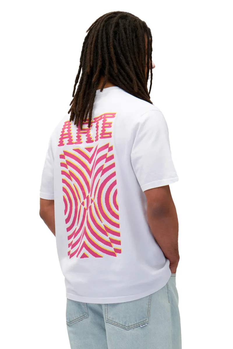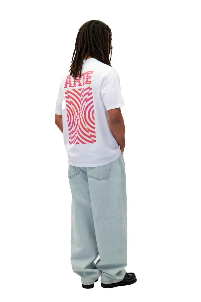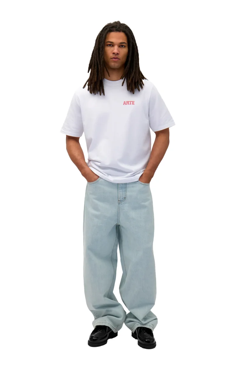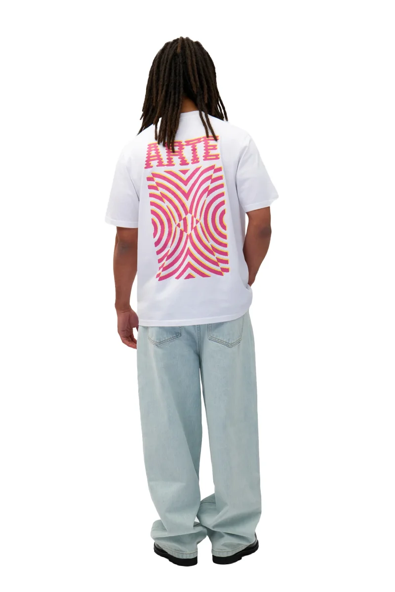 Realizzata in cotone premium heavyweight, questa T-shirt bianca ha una vestibilità rilassata, un girocollo leggermente più alto e una texture morbida al tatto. Sul petto, un logo Arte grafico rosso e giallo stampato sul lato sinistro aggiunge un tocco distintivo.