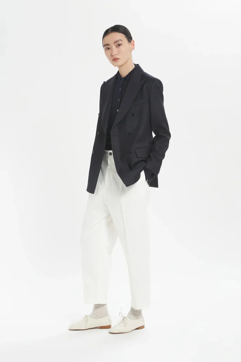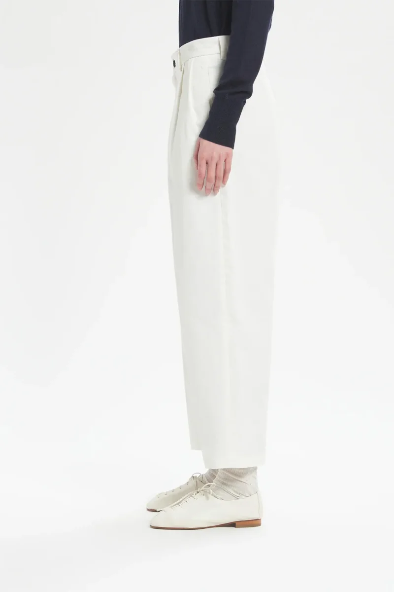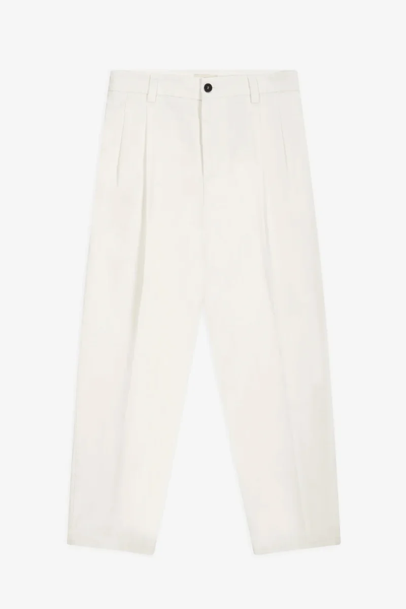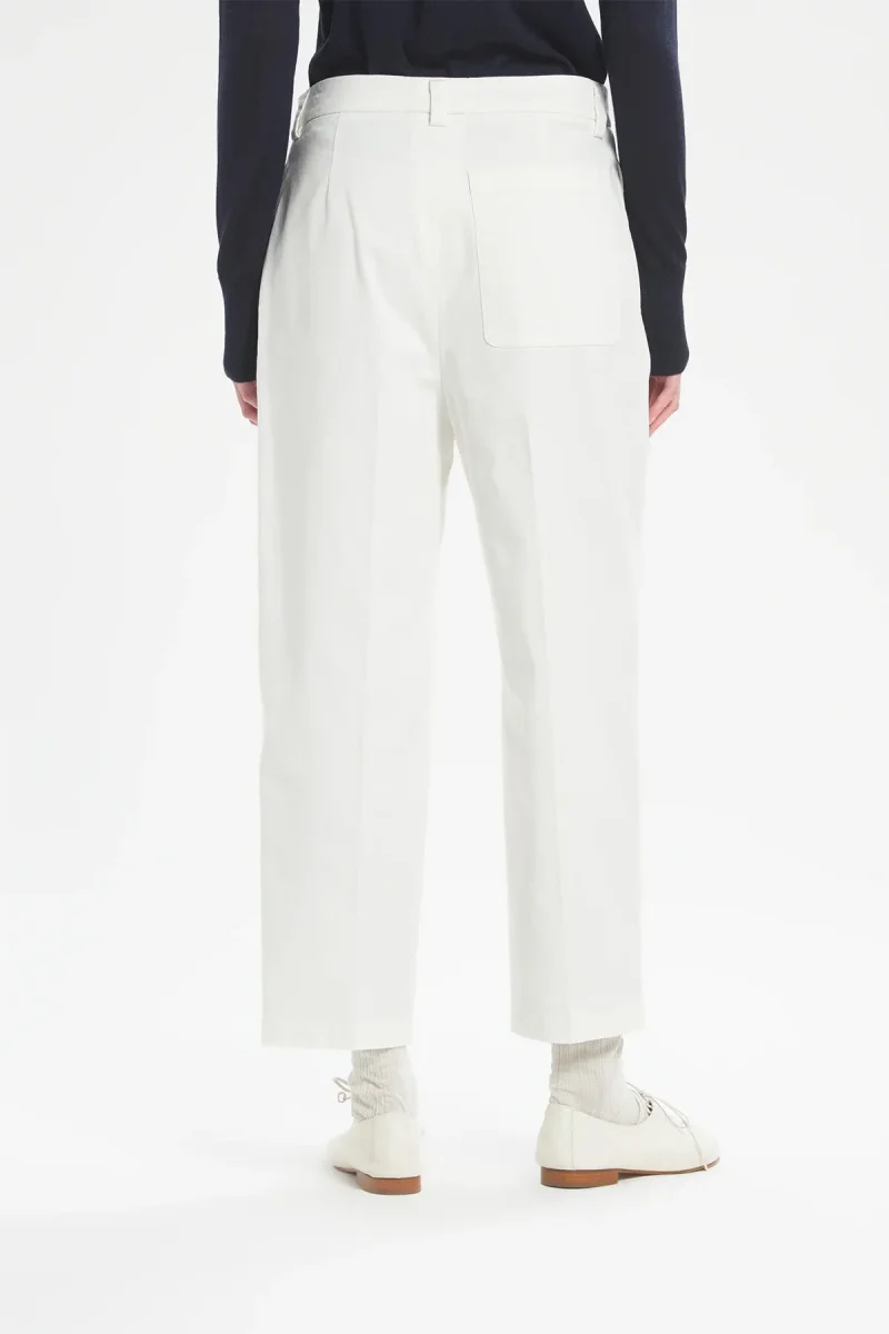 Questi pantaloni cropped, con una pince sul davanti presentano una silhouette pulita e sartoriale. Realizzati in resistente twill di cotone, uniscono comfort e stile, rendendoli la scelta ideale sia per look casual che raffinati.