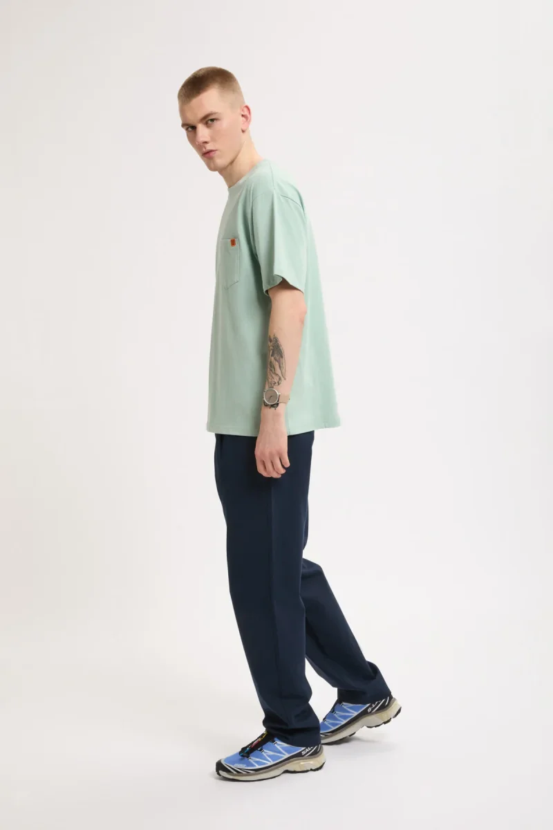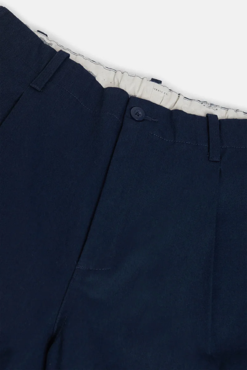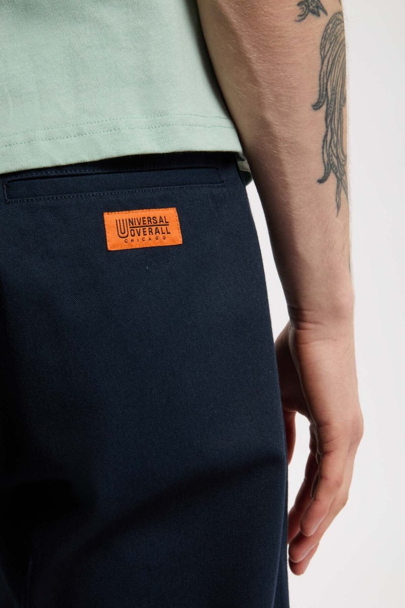 Questi pantaloni a vestibilità standard sono realizzati in tessuto T/C twill strutturato, tessuto con filati spessi per un effetto leggermente robusto. Progettati con una pinces frontale per creare volume sui fianchi, la silhouette si affusola delicatamente dalla coscia all’orlo, offrendo una forma pulita e moderna. La lunghezza è leggermente cropped per valorizzare la vestibilità contemporanea. Le tasche posteriori a filetto in stile sartoriale aggiungono un tocco raffinato, mentre la fascia interna in vita è foderata con tessuto marchiato con l’iconico logo UNIVERSAL OVERALL. Rifiniti con bio-wash per una texture morbida e un leggero effetto sbiadito ispirato al vintage.
