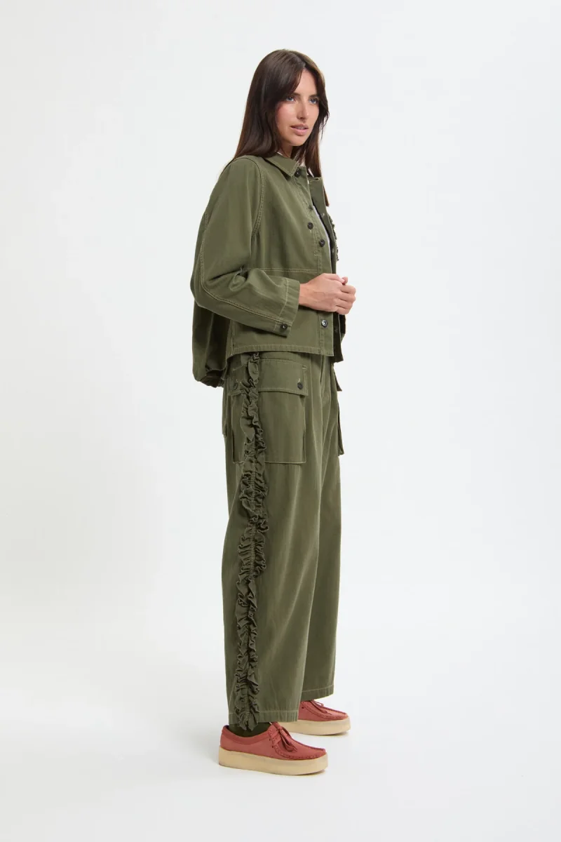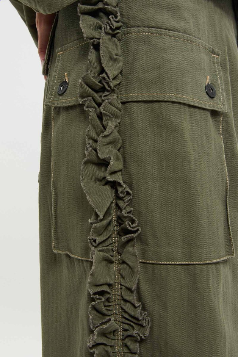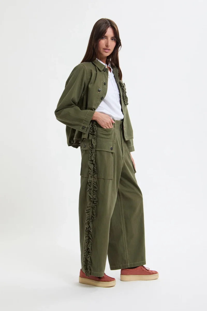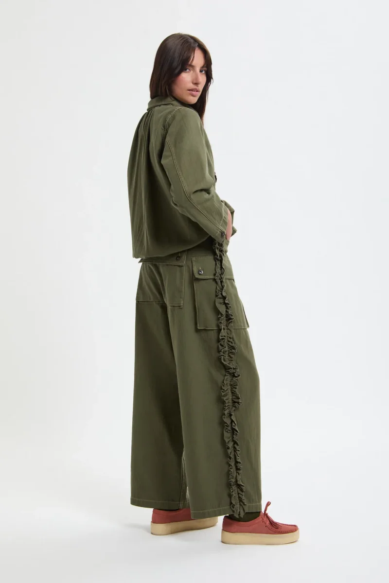 Le cuciture laterali sono arricchite da un vistoso bordo a volant, elemento simbolico di , mentre la fodera interna delle tasche frontali è decorata con la rondine iconica del brand, realizzata con tecnica stencil.