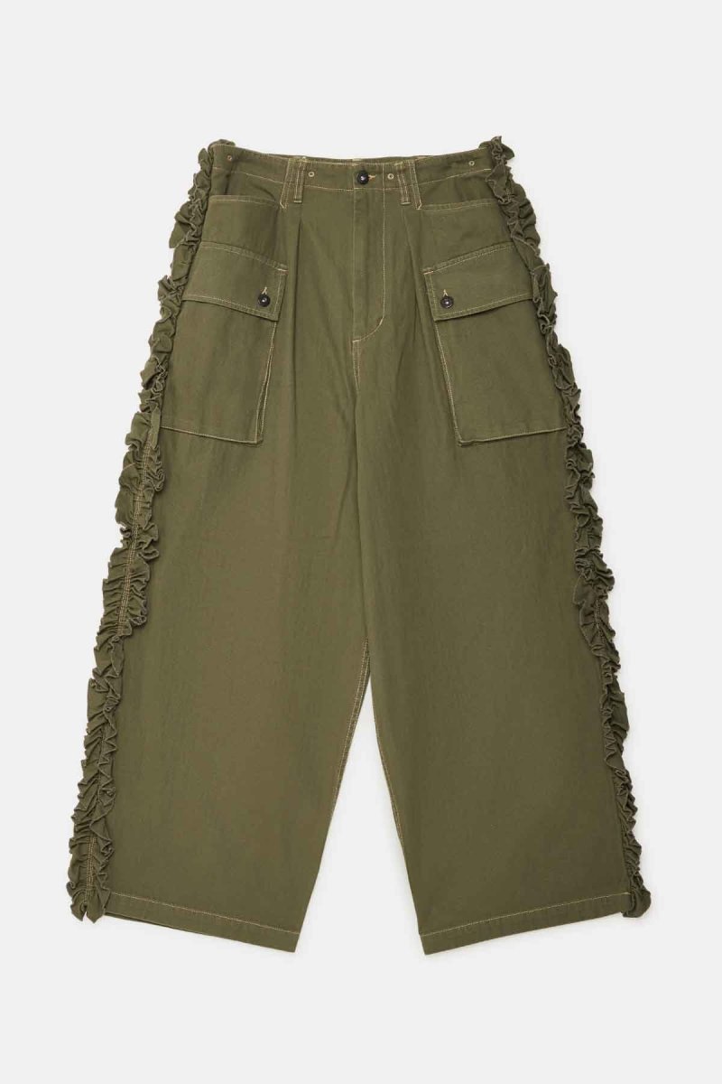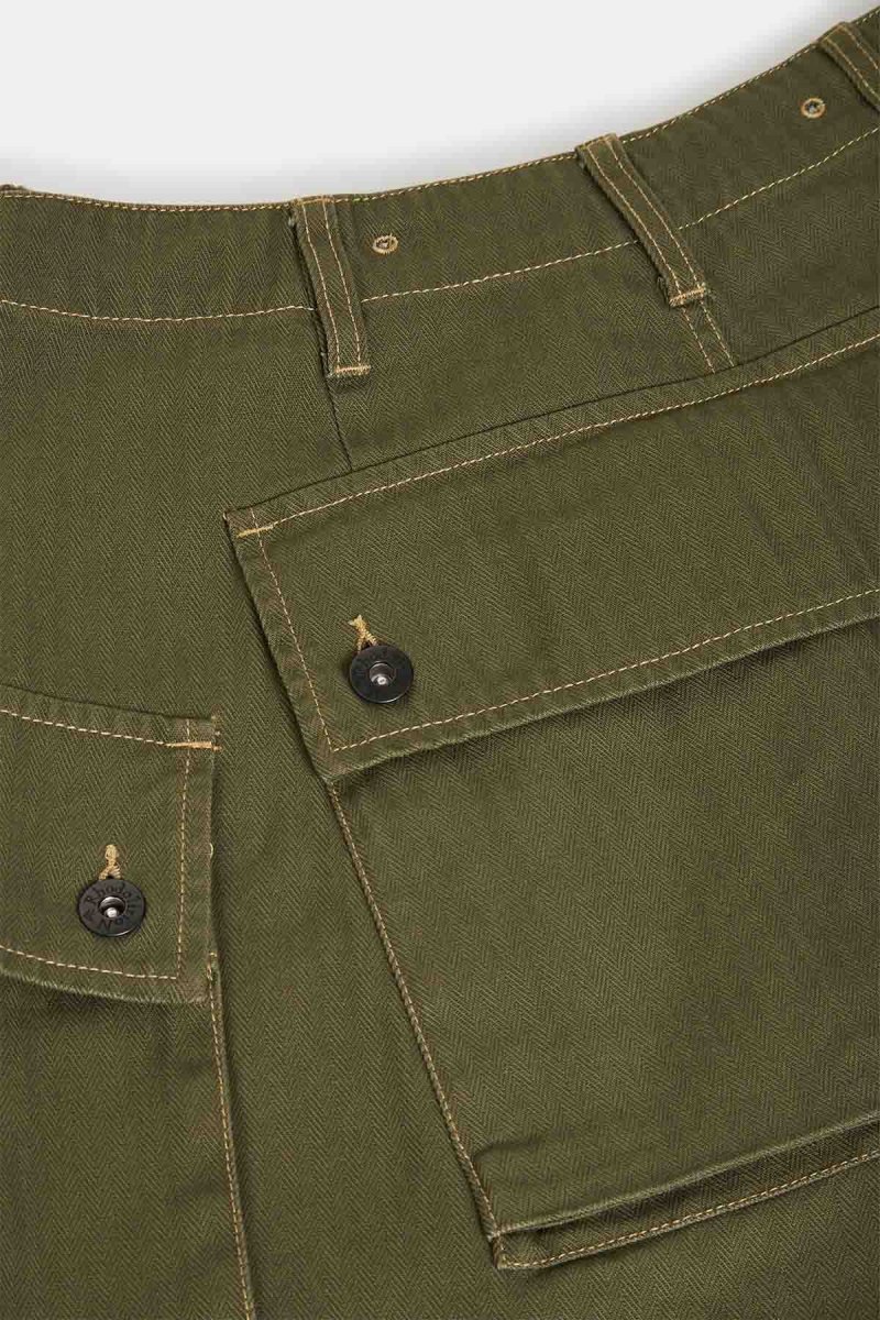 Questi pantaloni da lavoro si ispirano ai utility pants in tessuto spigato, con origini legate all’USMC. Presentano tasche con soffietto ad alta capienza posizionate sul retro e sulle cosce. Gli occhielli in vita sono mantenuti come retaggio per le bretelle a gancio.