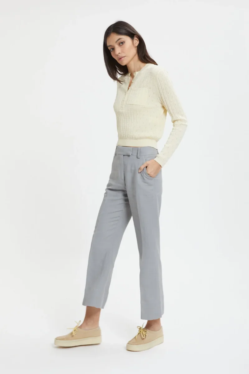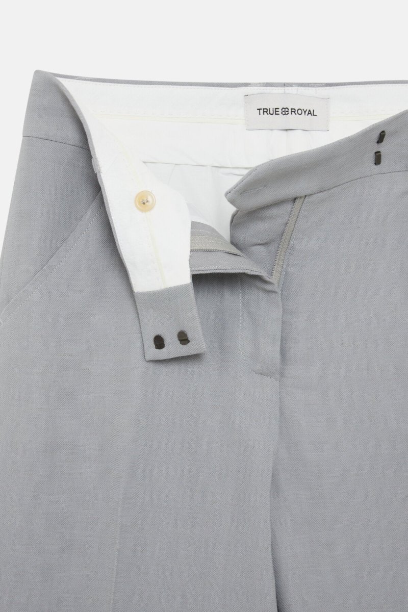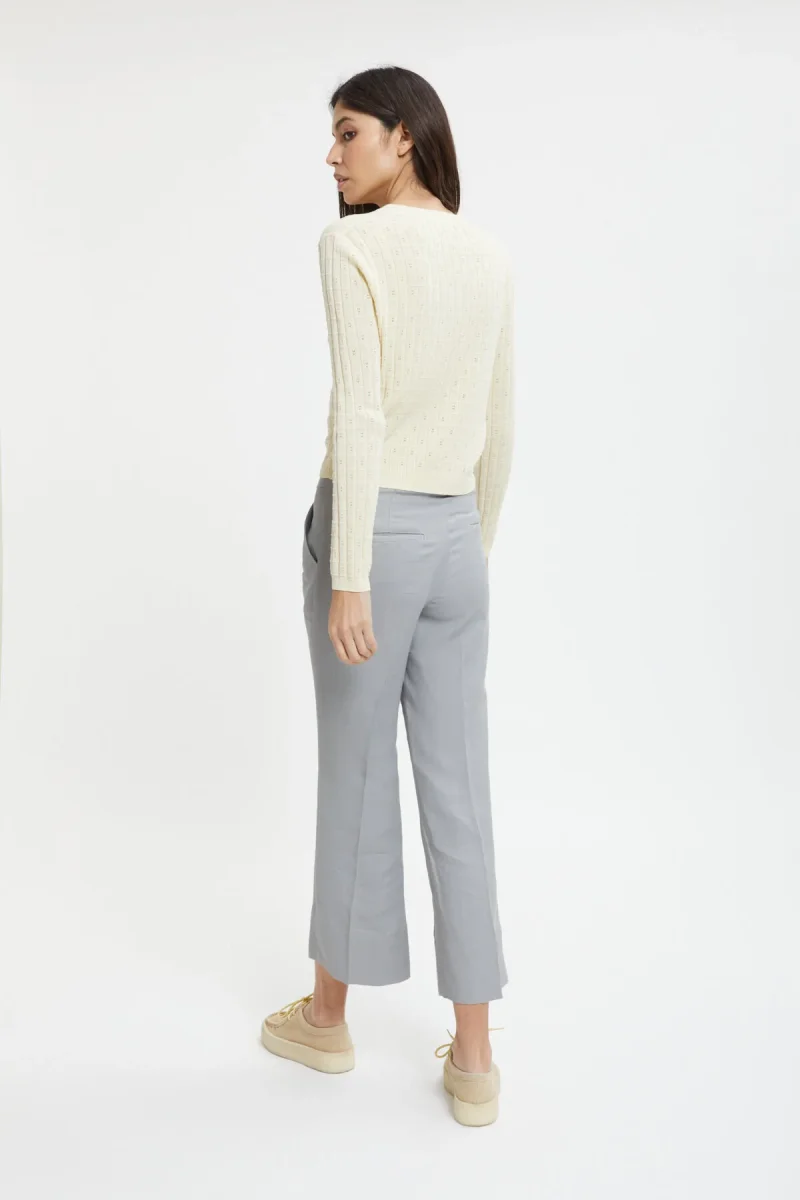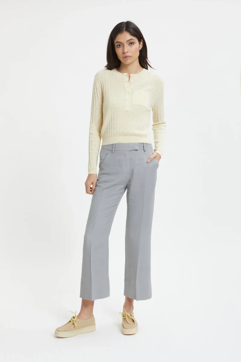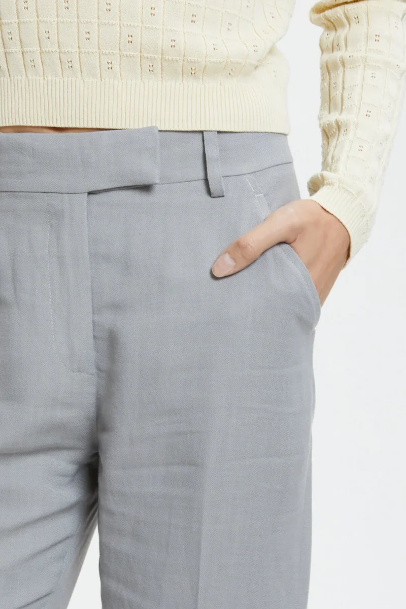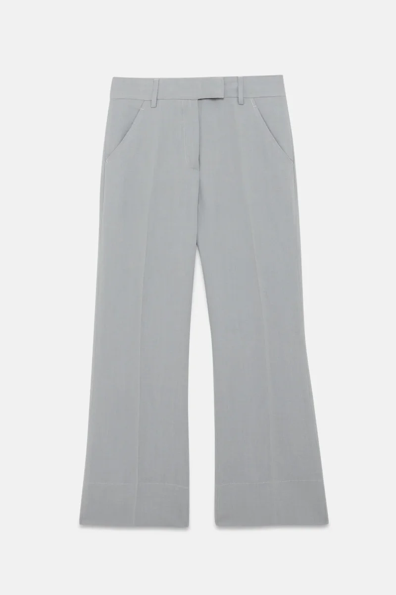I pantaloni Giada di True Royal in viscosa e lino sono caratterizzati da un taglio classico a vita alta, con il fondo leggermente a zampa. Il tessuto comodo e leggero li rende ideali per le giornate primaverili.