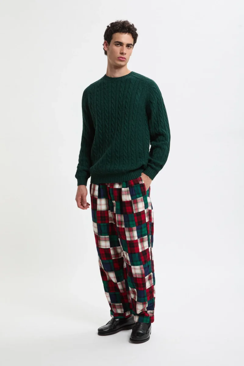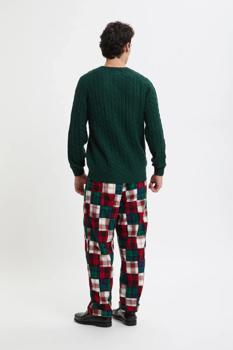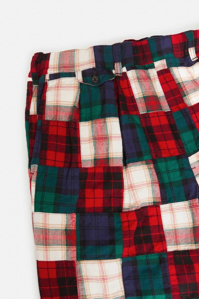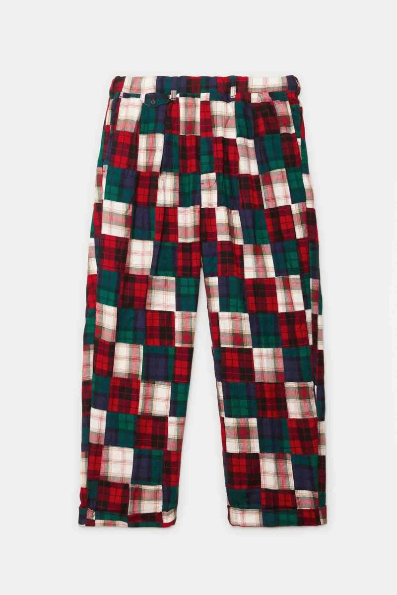 Questi pantaloni BEAMS PLUS rivisitano la flanella indiana con un patchwork tartan dal carattere deciso. Le pieghe frontali e la gamba rilassata assicurano comfort e libertà di movimento, mentre la costruzione multicolore aggiunge un tocco artigianale e distintivo. Un capo iconico che unisce tradizione e stile casual contemporaneo.