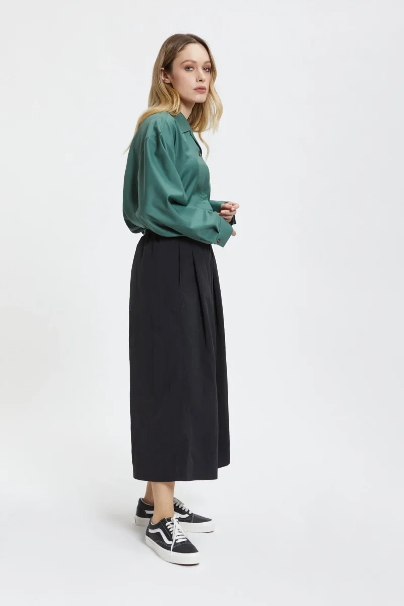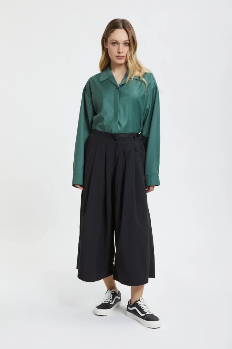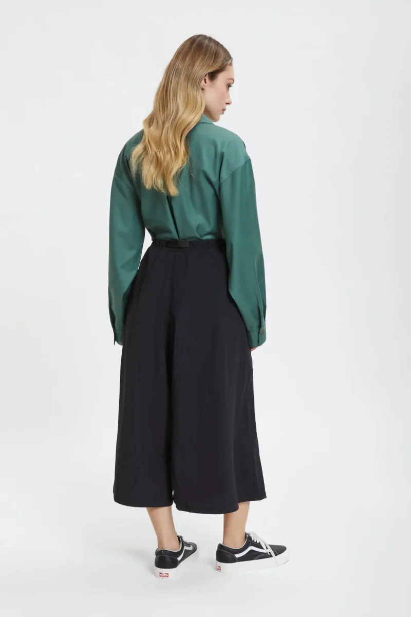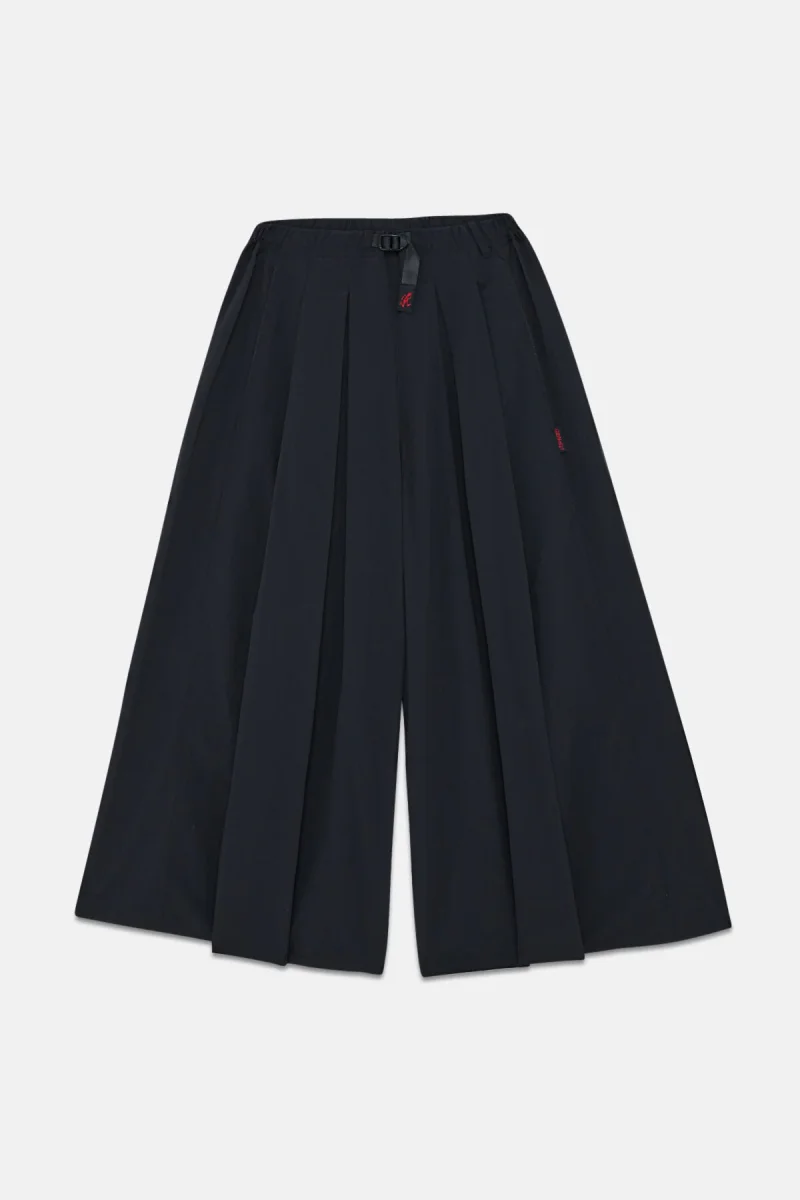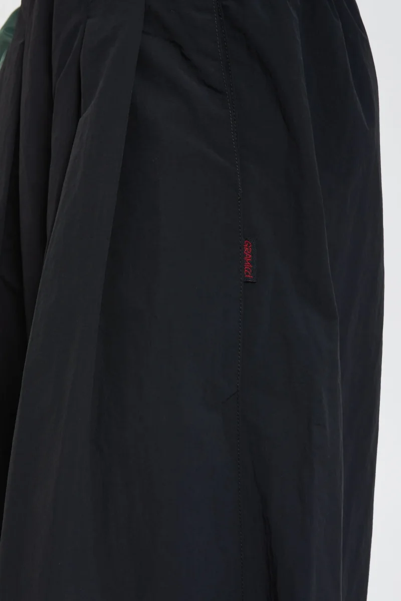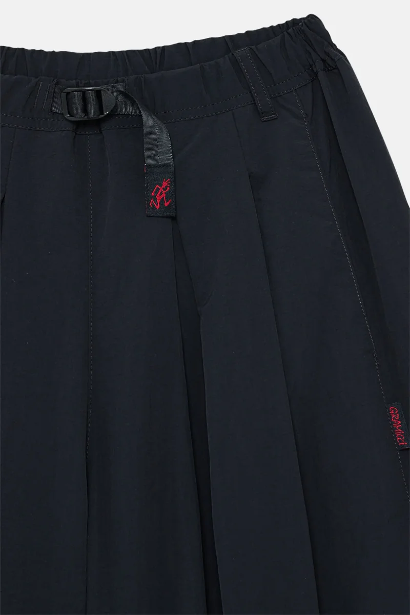 Questi pantaloni a zampa sono realizzati in GRAMICCI DURABLE NYLON, un nylon resistente che ha un tocco asciutto e una sensazione da capo già lavato. Simili a una gonna, i pantaloni si distinguono per le profonde pieghe anteriori e il drappeggio creato dal materiale corposo.