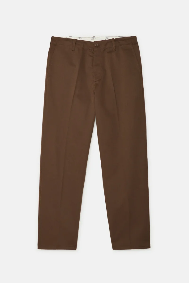Questo capo è realizzato in twill T/C, un tessuto iconico amato da UNIVERSAL OVERALL. Conosciuto per le sue proprietà di asciugatura rapida, resistenza e resistenza alle pieghe, è perfetto per l’uso quotidiano. Il design si ispira ai dettagli in vita d’archivio, aggiornando però la vestibilità e la silhouette per un look più moderno. Le pieghe centrali aggiungono eleganza e definiscono la silhouette pulita e classica di questo capo essenziale.