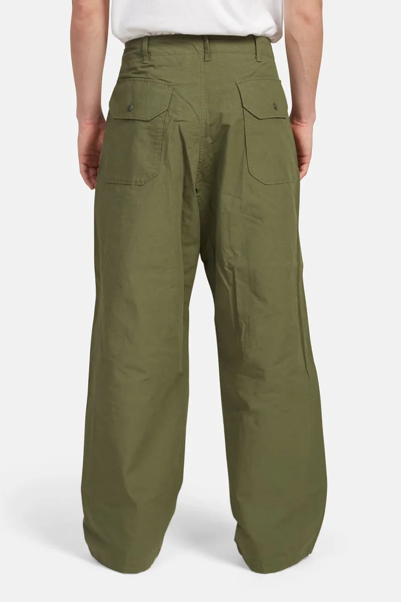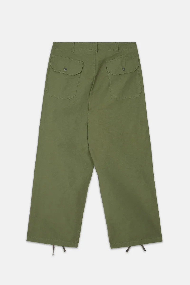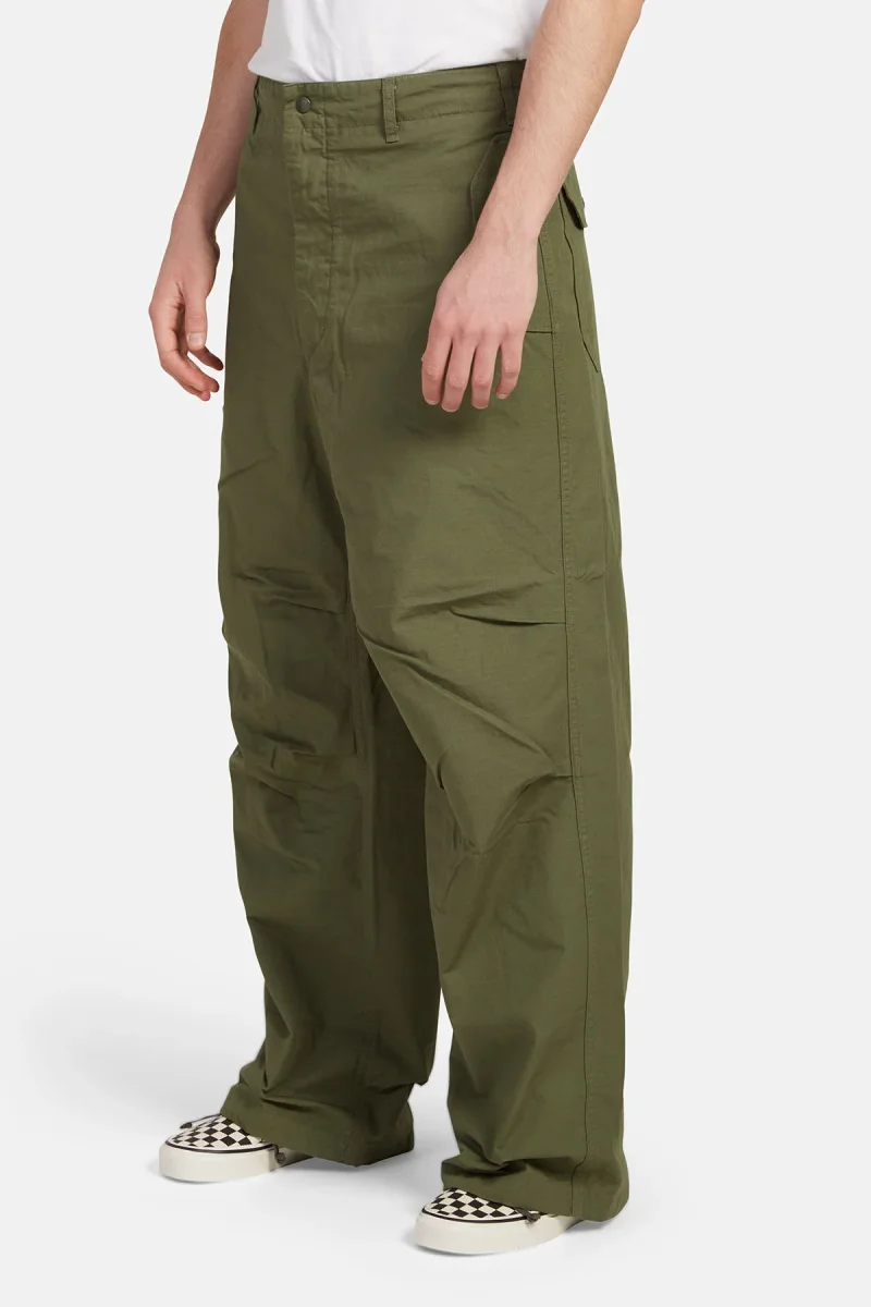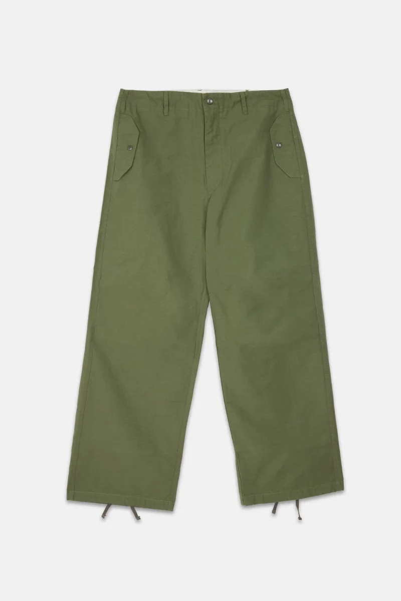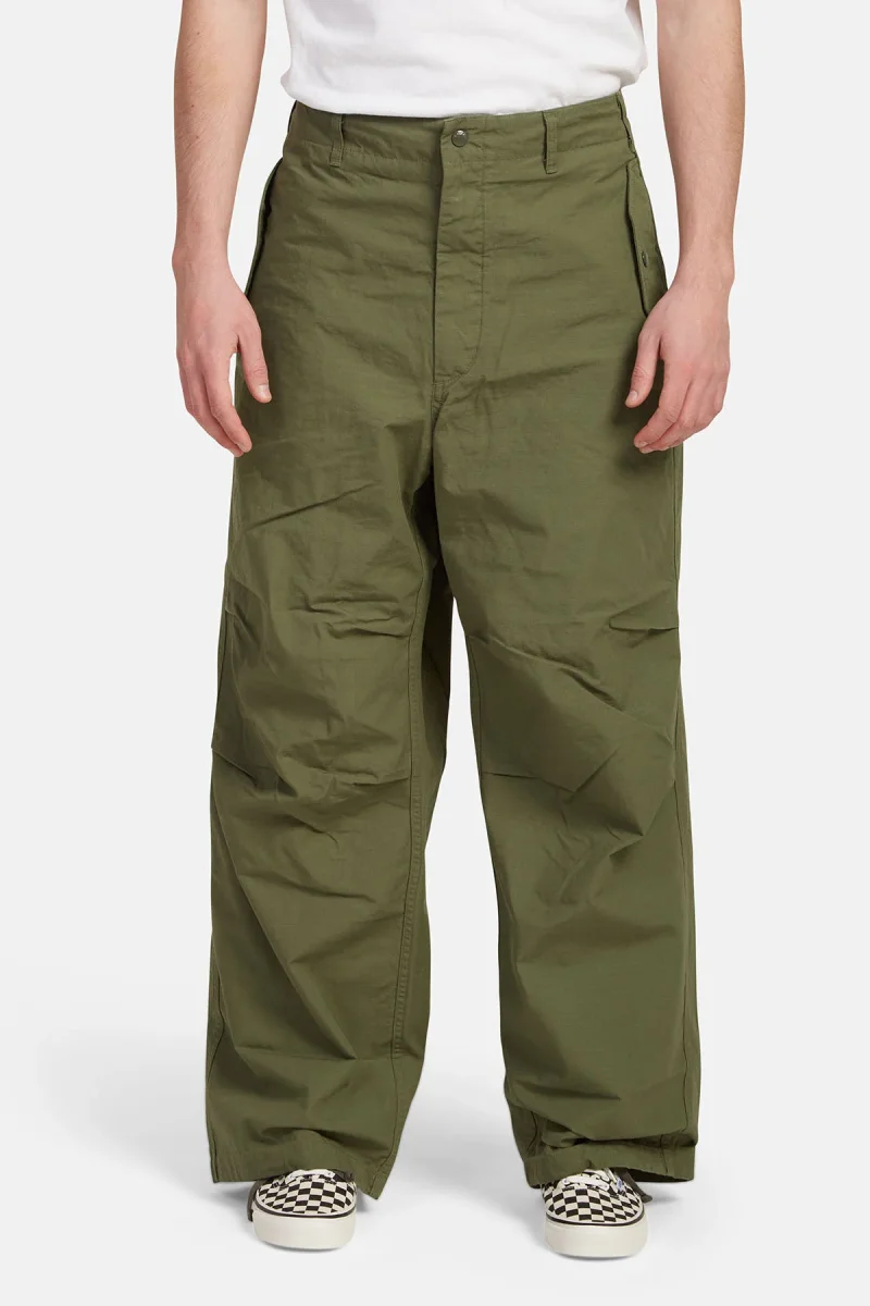 Pantaloni creati pensando al taglio dei sovrapantaloni militari. La caratteristica principale è la forma ampia come suggerisce il nome. Il design è molto semplice anche se si possono notare dettagli da pantalone militare come le tasche con patta, rinforzi sulle ginocchia e coulisse al fondo. La versione in cotone ripstop è interessante anche per la sua texture che viene valorizzata man mano che lo si indossa.