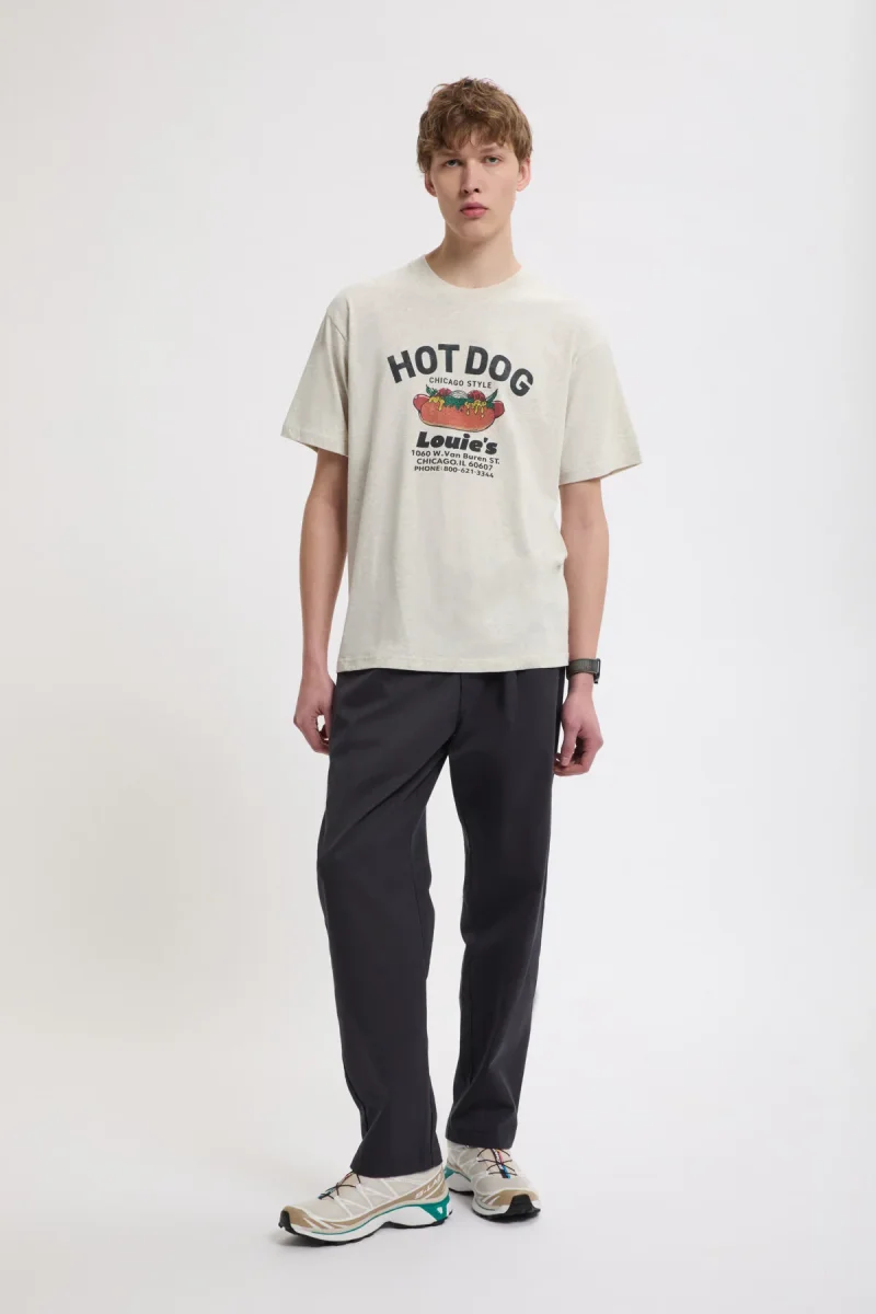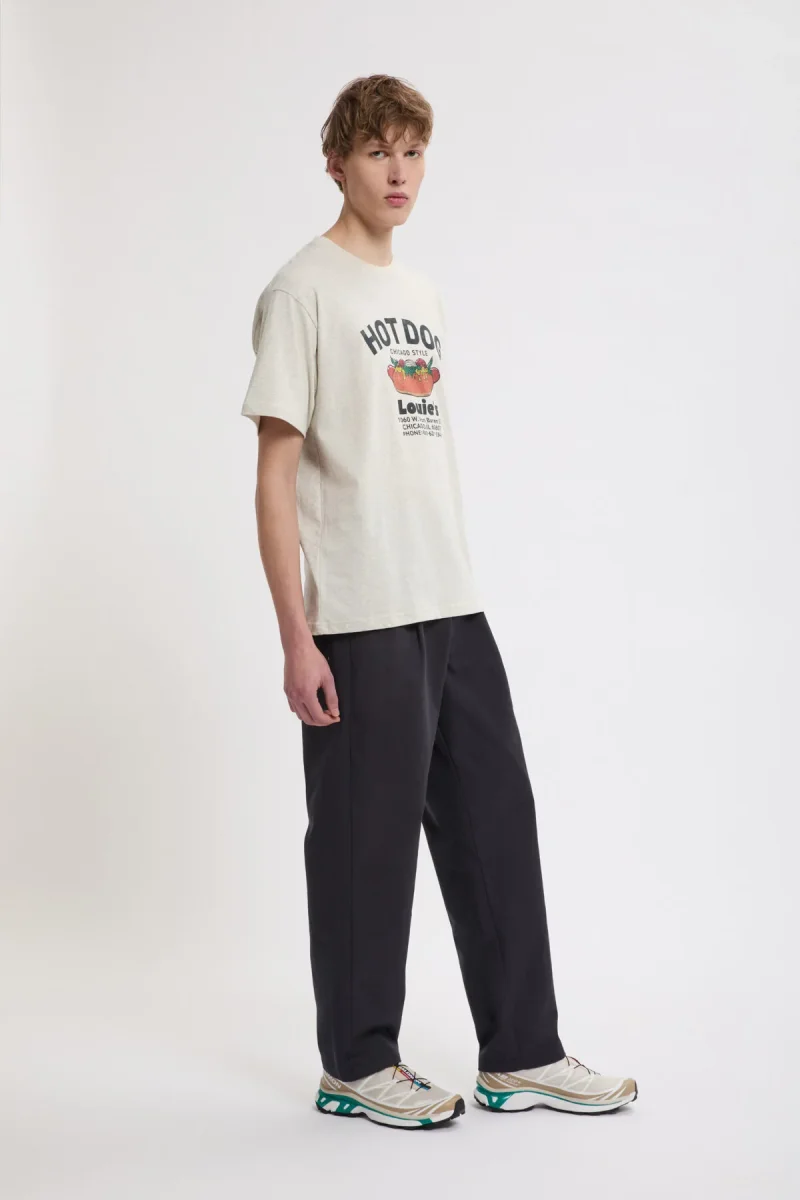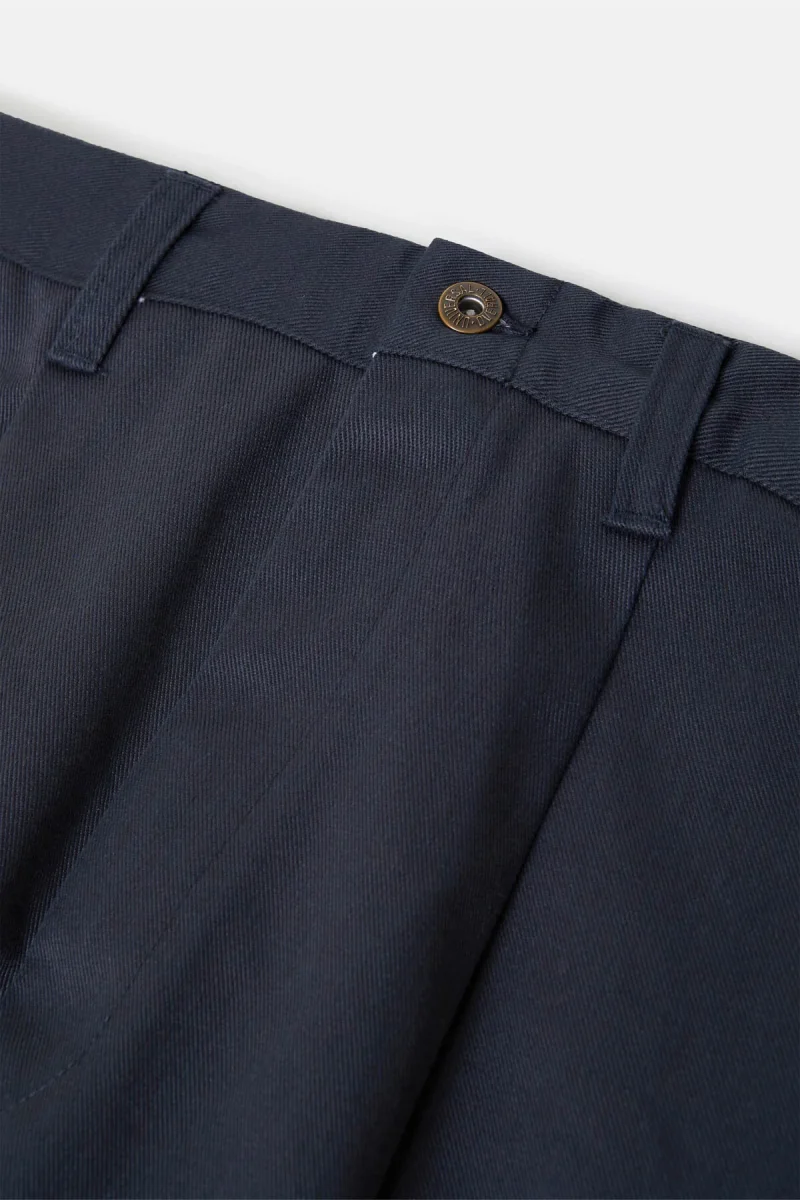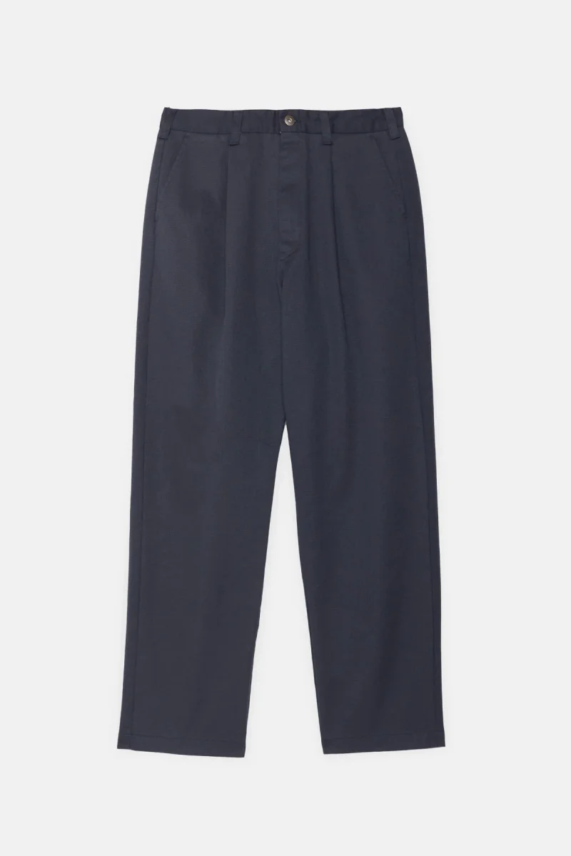 Questi pantaloni plissettati con una pinces offrono un look elegante in vita garantendo al contempo il massimo comfort. La singola pinces frontale aggiunge un tocco classico, con una vestibilità rilassata sui fianchi che si restringe verso l’orlo. Realizzati in tessuto T/C spesso e resistente con una evidente trama diagonale, sottoposti a bio-wash per conferire una mano morbida e un aspetto leggermente vissuto.