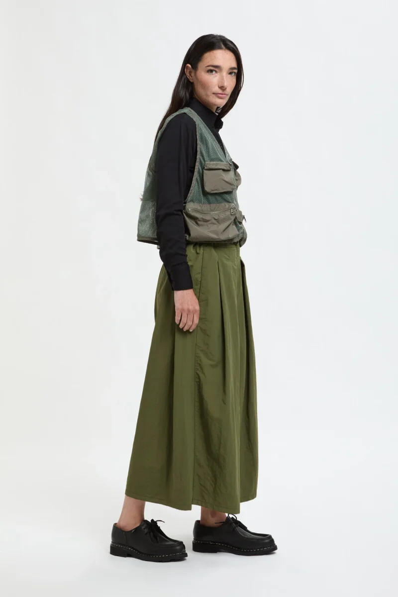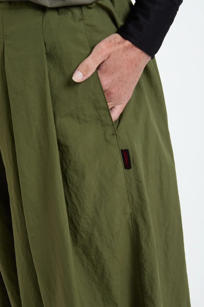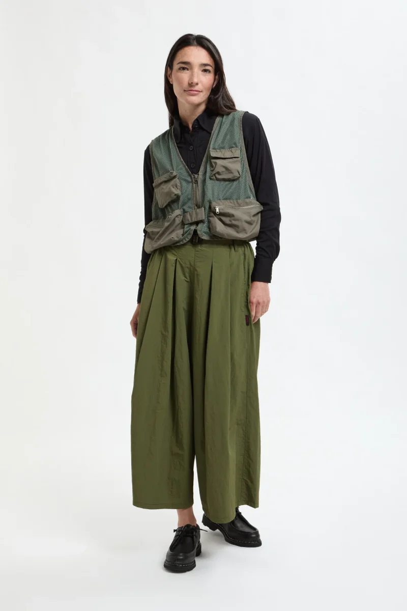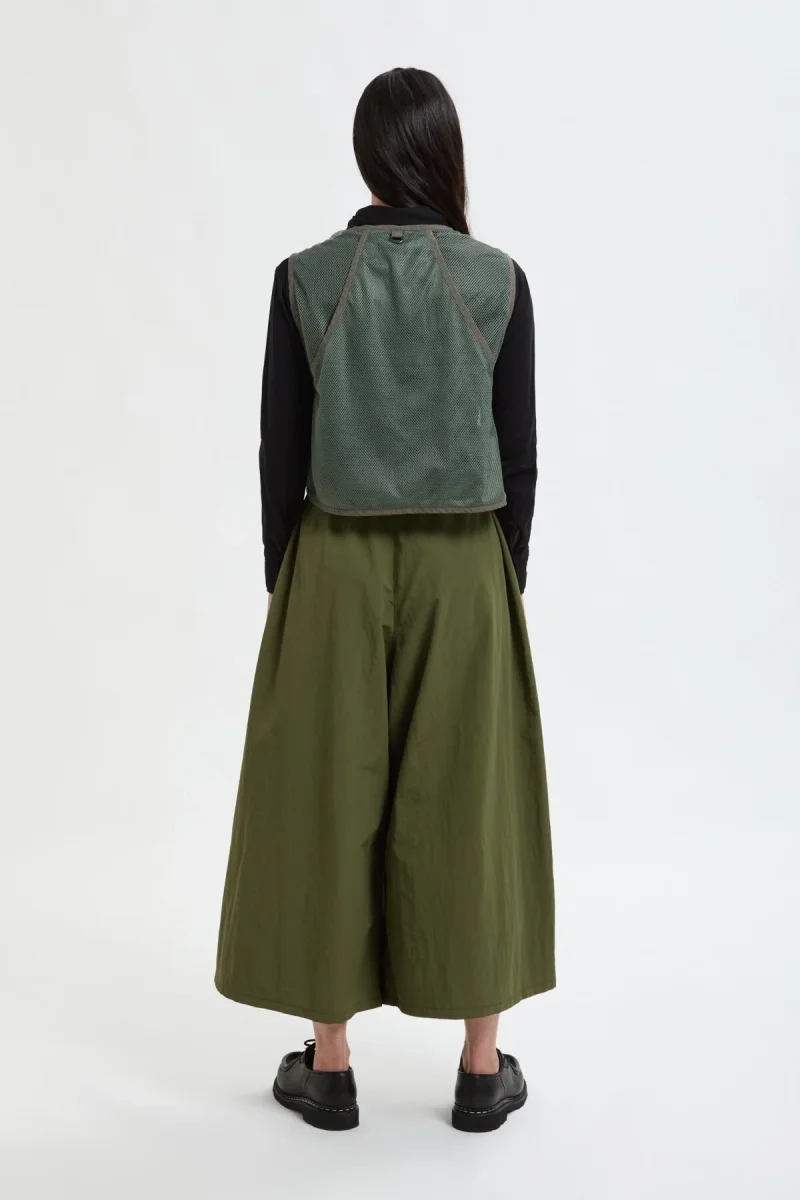 I Pantaloni Svasati sono un modello a gamba ampia di grande effetto, realizzati in un tessuto chiamato Nylon Resistente. Questo materiale leggero, ricavato da scarti di produzione e lavorato in un filato fresco, è perfetto per l’estate, dando a questi pantaloni una resistenza rassicurante e una piacevole leggerezza. Il risultato è un drappeggio particolare e un aspetto che ricorda una gonna.