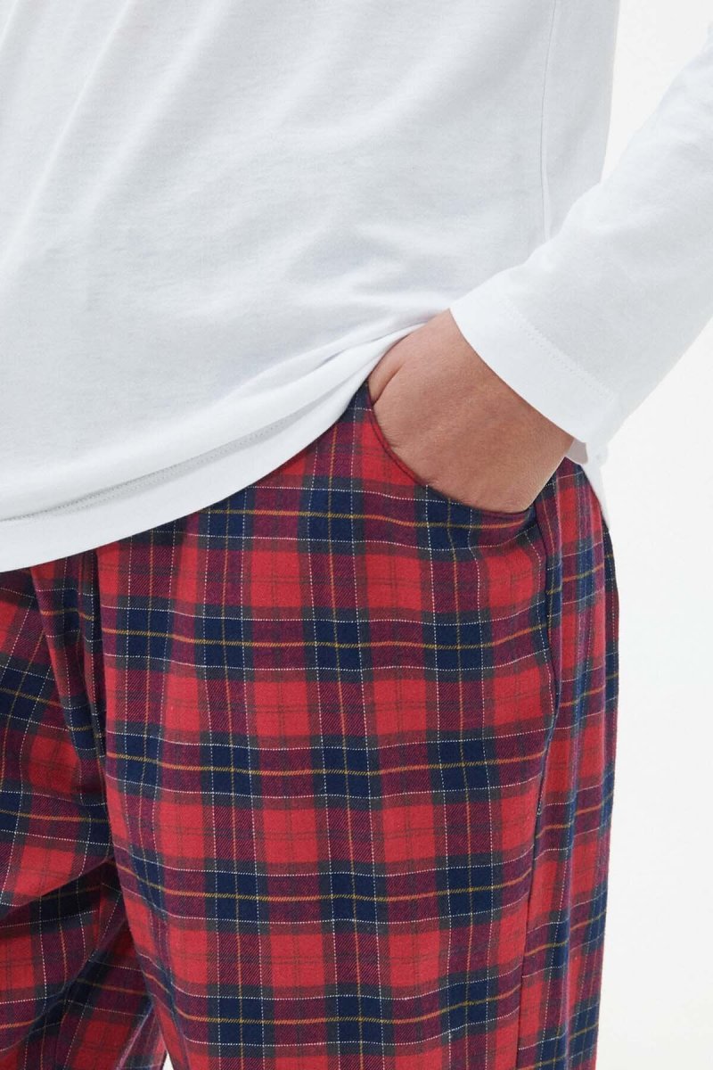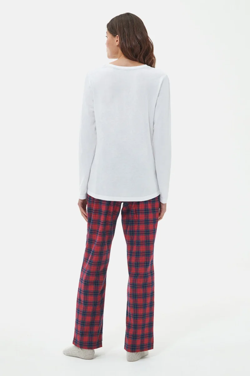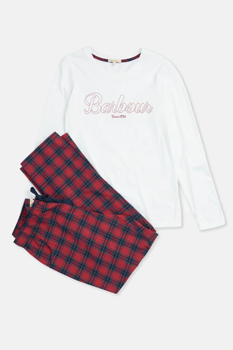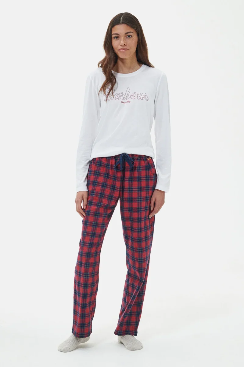 Composto da una maglia a maniche lunghe e da un paio di pantaloni, il pigiama Phoebe è perfetto da indossare per trascorrere momenti di relax in casa o da portare con te nelle gite fuori porta del fine settimana. La maglia in misto cotone presenta una stampa del nome Barbour sul petto, mentre i pantaloni sono caratterizzati da un motivo tartan e da una chiusura con cordino in vita.