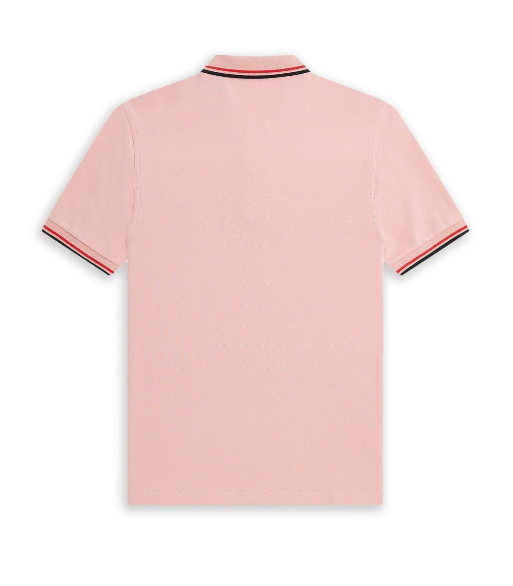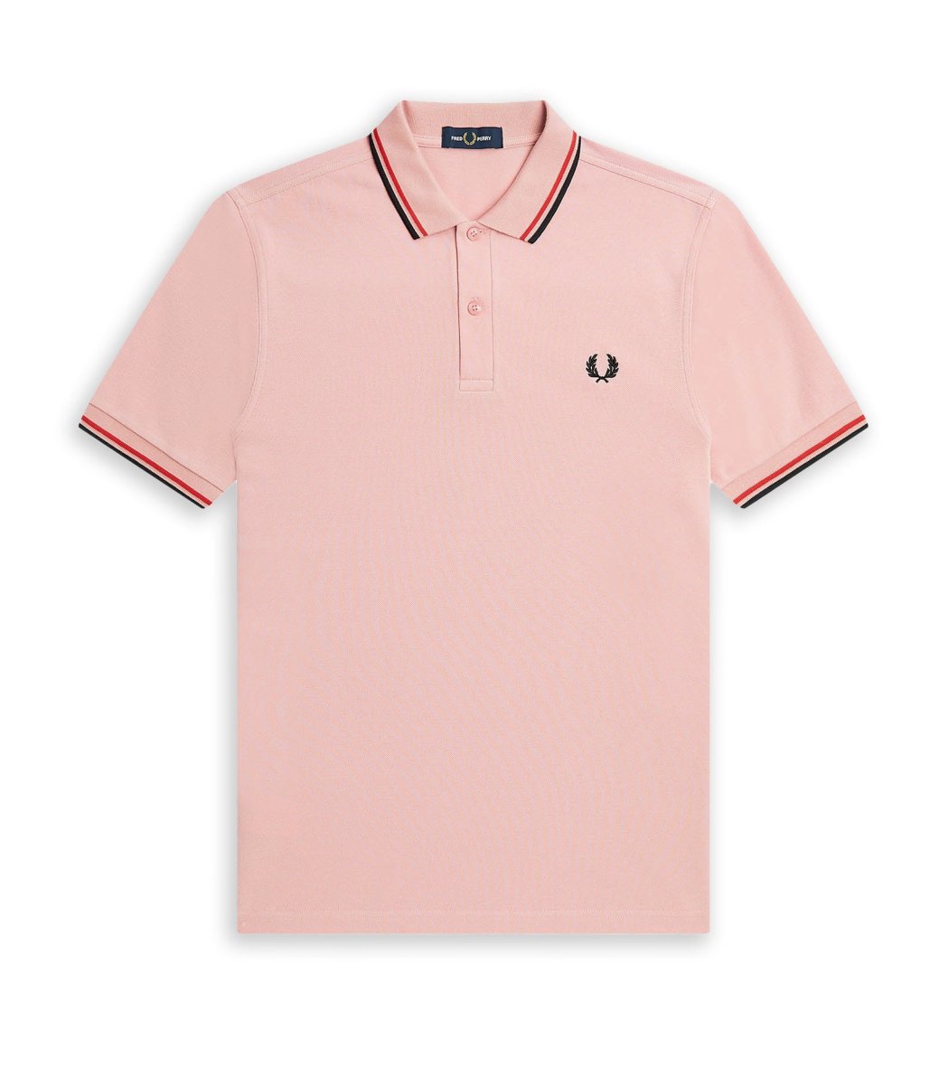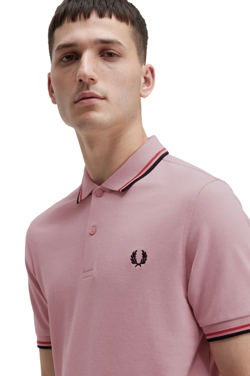 Polo manica corta Fred Perry colore rosa da uomo con dettagli righe sul collo e lungo le maniche cotone morbido vestibilità regolare.
