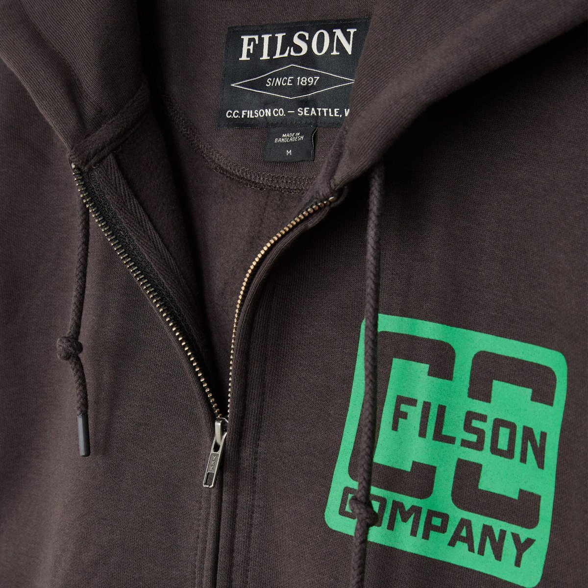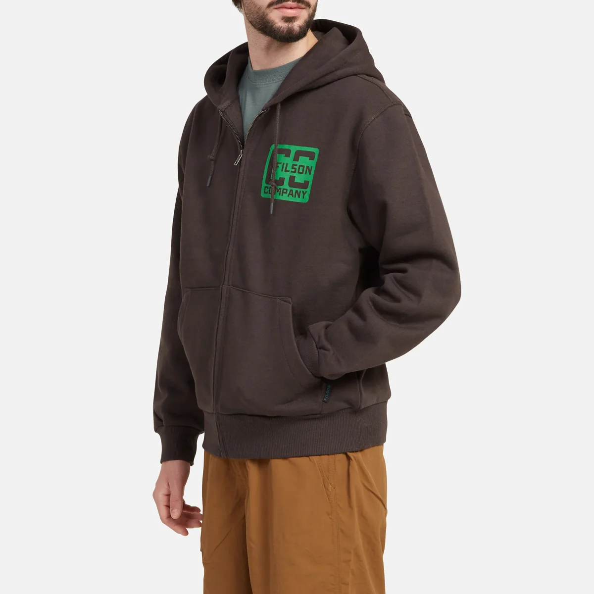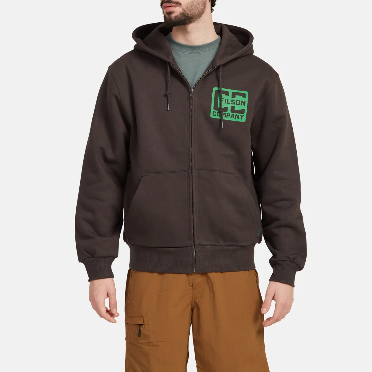 Il tessuto di lunghissima durata composto al 75% da cotone e al 25% da poliestere presenta uno strato interno isolante che intrappola il calore e una superficie esterna liscia non tendente a formare pallini. La presenza del poliestere aiuta ad evitare il restringimento del capo. L’orlo e i polsini in robusta maglia a coste ampie consentono di adattare la vestibilità e presentano straordinarie proprietà di elasticità e recupero della forma. Le dimensioni generose del cappuccio consentono di indossarlo anche sopra ad un berretto e i lacci offrono la possibilità di regolarlo e fissarlo in presenza di vento. È dotata di una robusta cerniera anteriore per aumentare la traspirazione e di una grafica originale Filson. I polsini e l’orlo in maglia a costine mantengono inalterata la loro forma. Cappuccio regolabile con lacci.