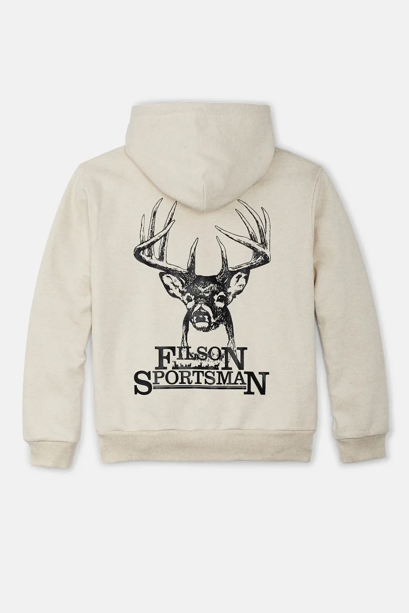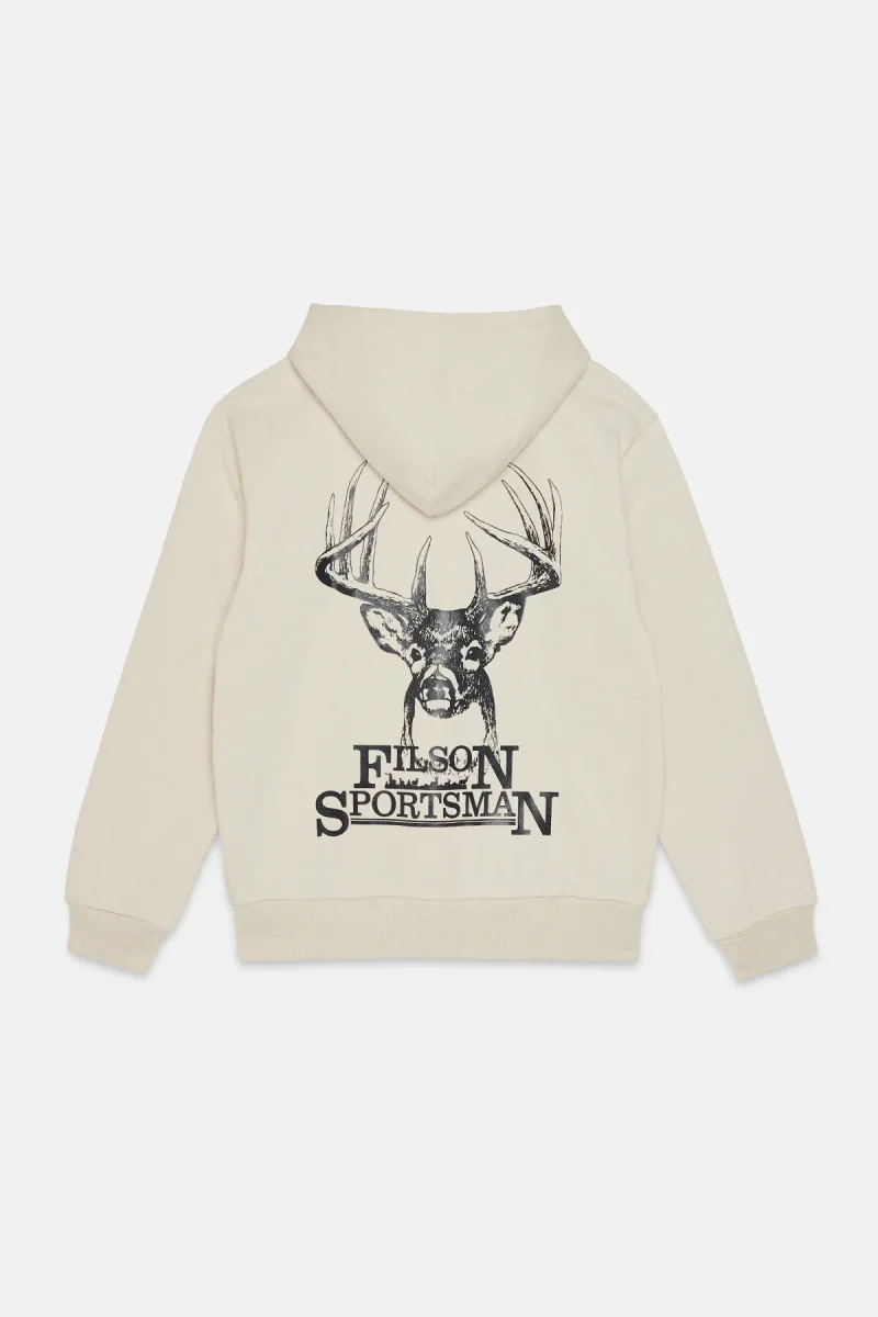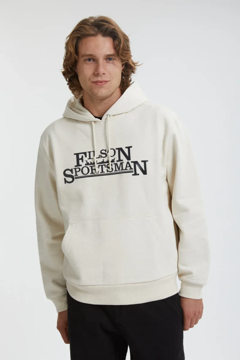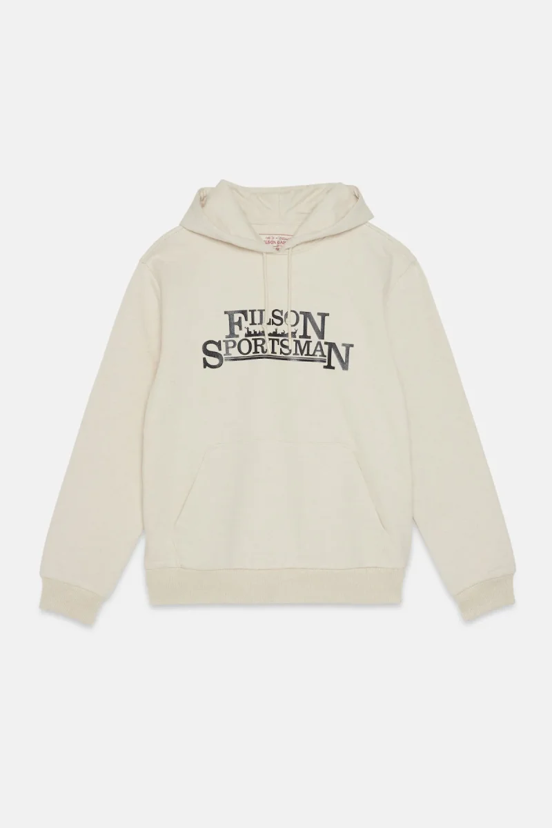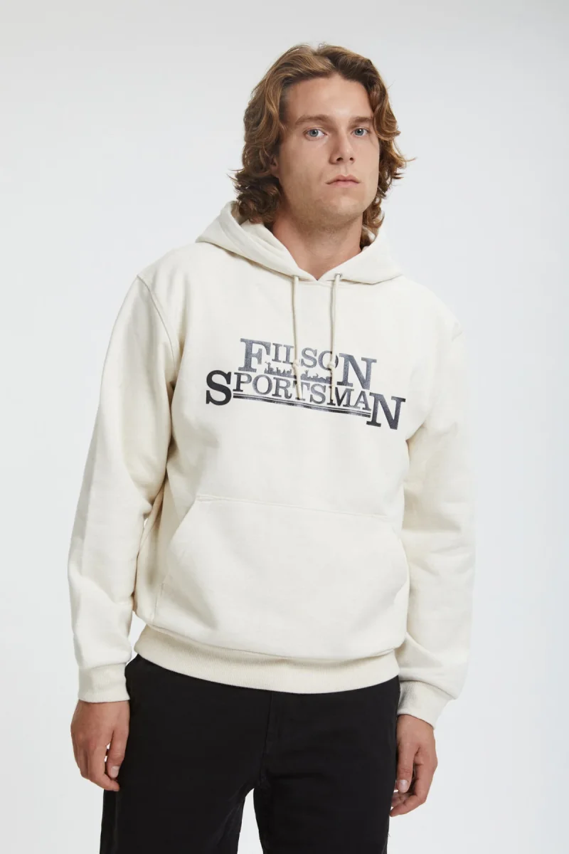 Il robusto tessuto con cui è realizzato si caratterizza per la composizione in 75% cotone / 25% poliestere, che rende il capo isolante, così da poter trattenere al meglio il calore, e al contempo garantisce una superficie esterna liscia che resiste al pilling. Il poliestere presente nel tessuto aiuta a evitare che gli abiti si restringano. L’orlo e i polsini sono dotati di una robusta struttura a coste larghe che assicura una vestibilità su misura e un’eccezionale elasticità senza il rischio che il capo possa sformarsi. L’ampio cappuccio può essere indossato sopra un cappellino da baseball ed è regolabile con una coulisse per resistere alle folate di vento. La grafica personalizzata è firmata Filson. Tasca anteriore a marsupio.