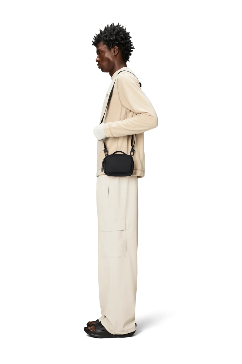 La Rains Box Bag Micro Nera è la crossbody più compatta e pulita della famiglia Box: design squadrato minimal, zip rivestita e vibe super “tech” ma facile da abbinare con tutto. È fatta per portarti dietro solo l’essenziale (telefono, portafoglio, chiavi, AirPods) senza ingombro, e proprio per questo è perfetta per city, eventi, viaggi e daily leggero. Dentro la descrizione ci sta bene anche la taglia: misura H 11 × W 16 × P 7,5 cm e ha una capacità di 1,3 L, quindi è micro davvero, ma sfruttabile. SKU: 1412001BLACK