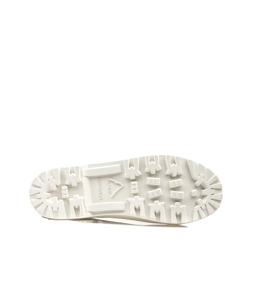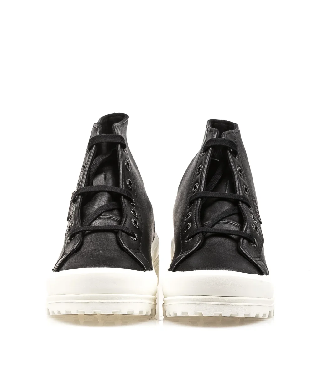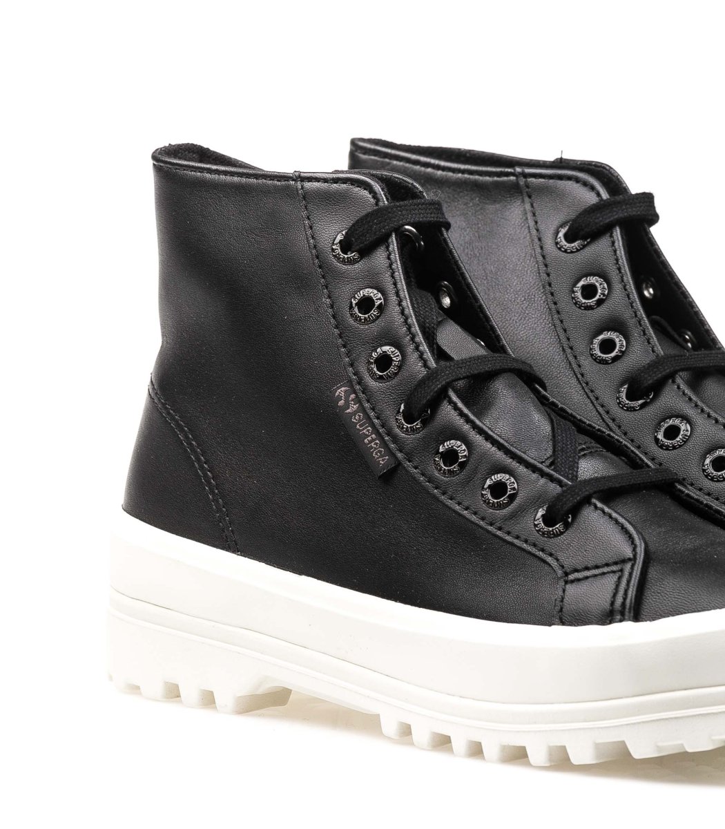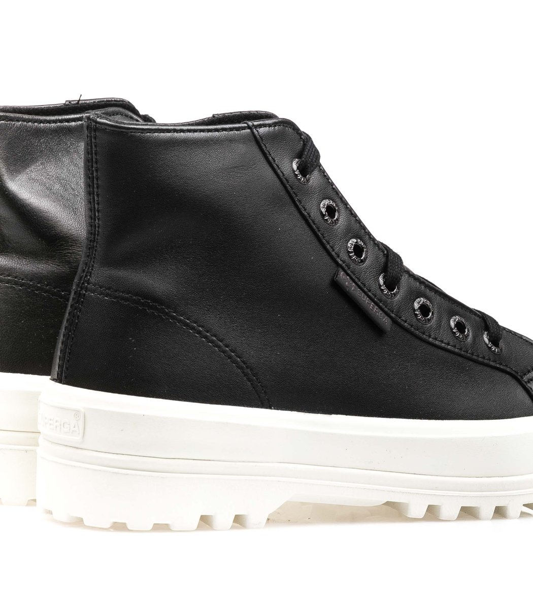Scarponcino colore nero da donna Superga con suola alpina rialzata e tomaia in pelle nero lucido.