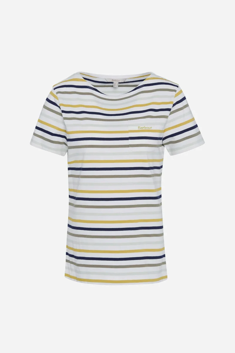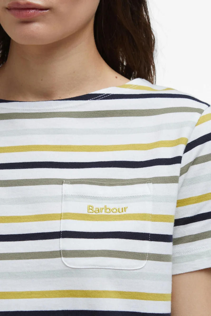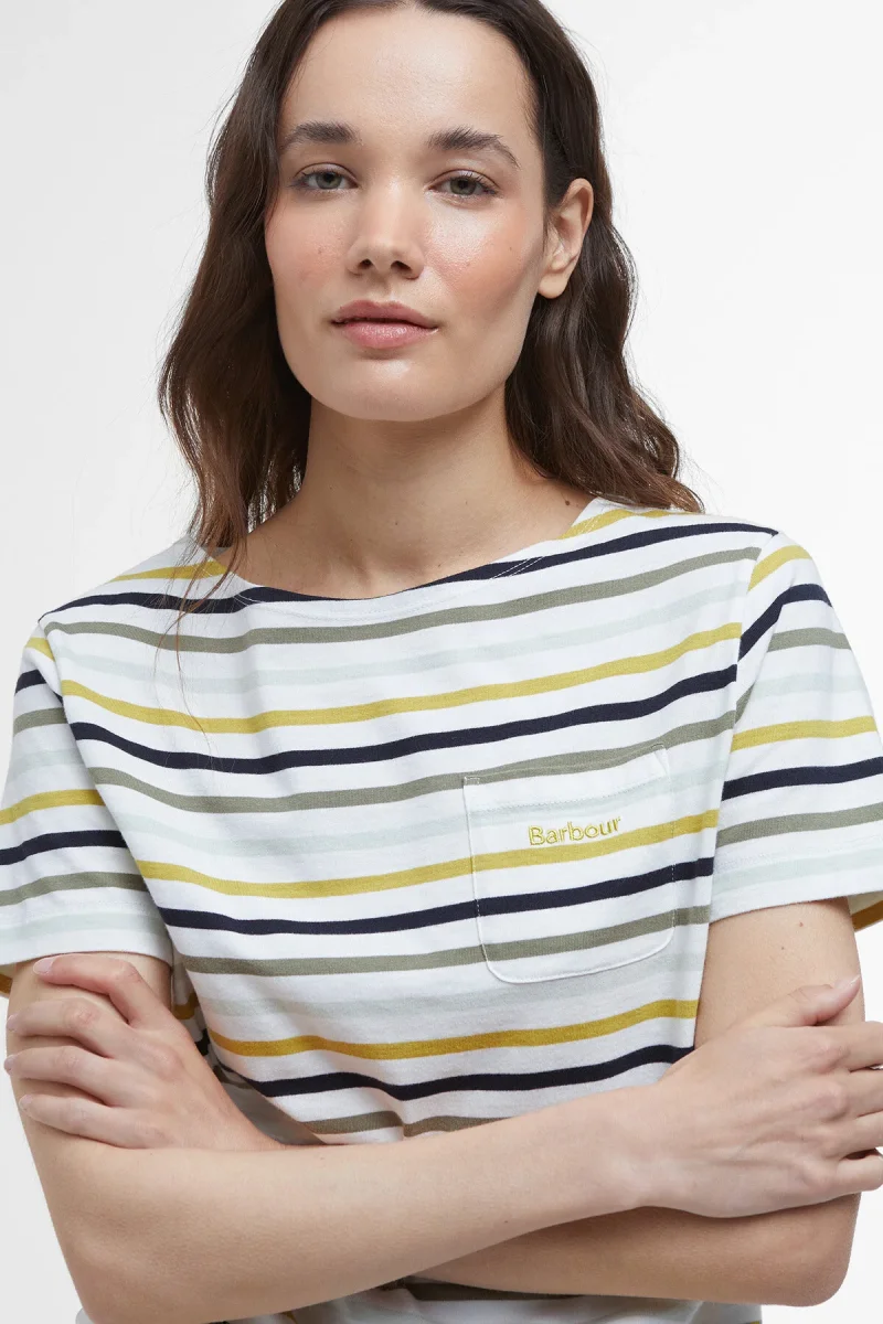 Rivisitazione in chiave contemporanea delle classiche maglie a righe in stile nautico, la T-Shirt Bradley firmata Barbour è caratterizzata da righe a blocchi multicolor che conferiscono al capo il giusto tocco di modernità. Perfetto da abbinare a un paio di jeans o chino per un look elegante e disinvolto, il capo è impreziosito da un piccolo logo ricamato sul petto a sinistra.
