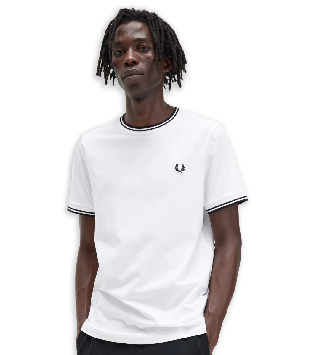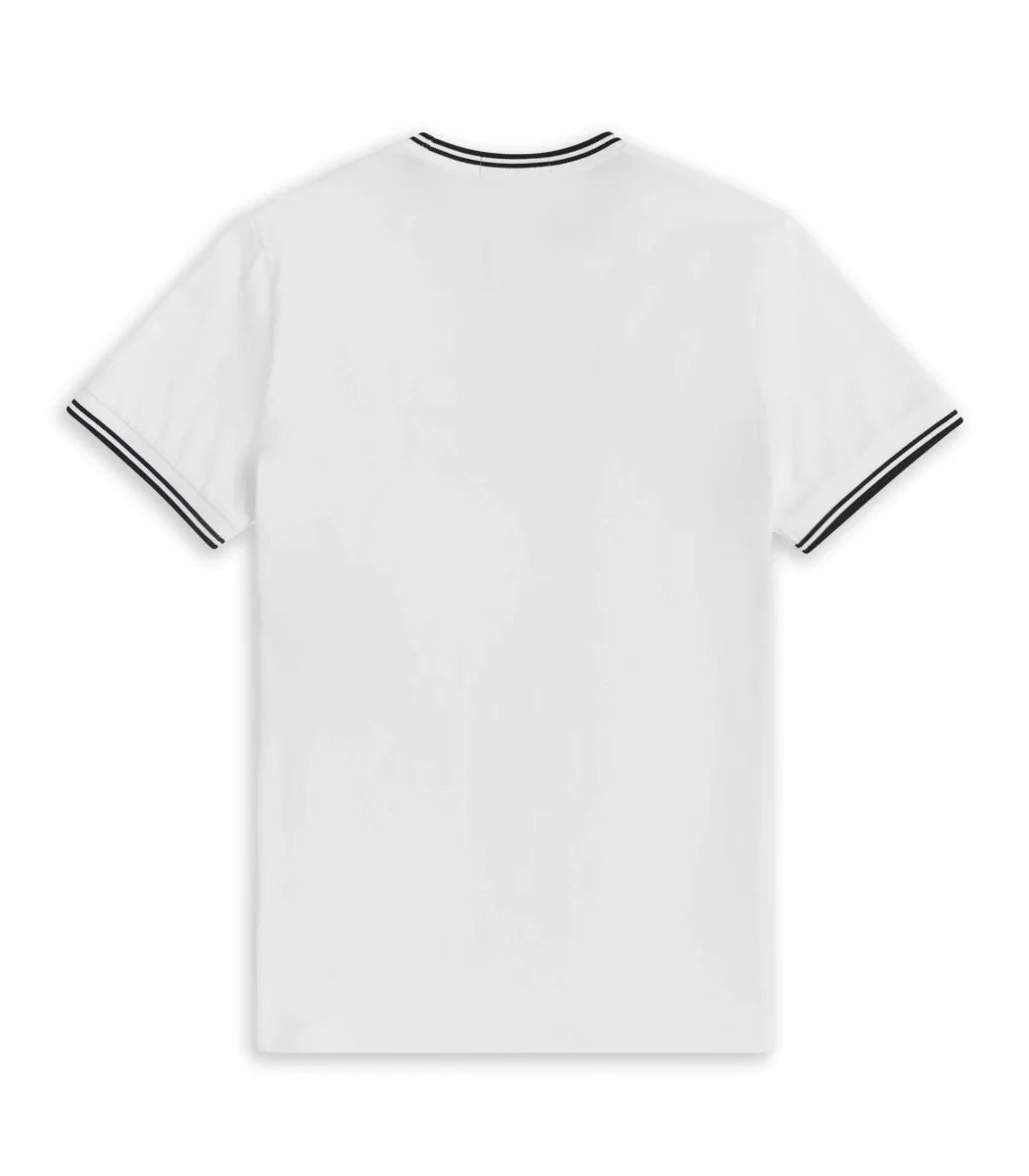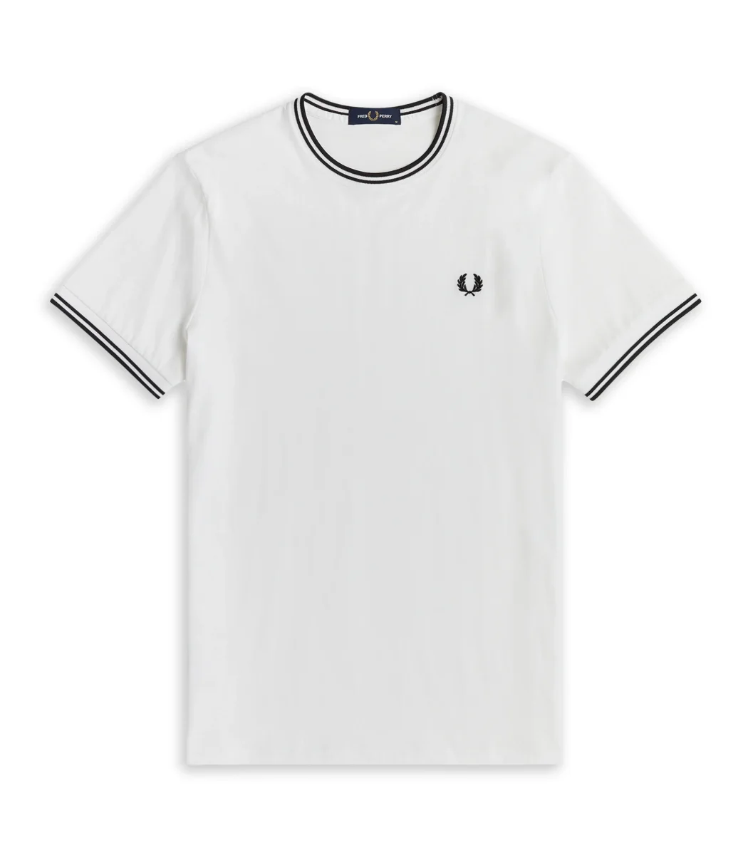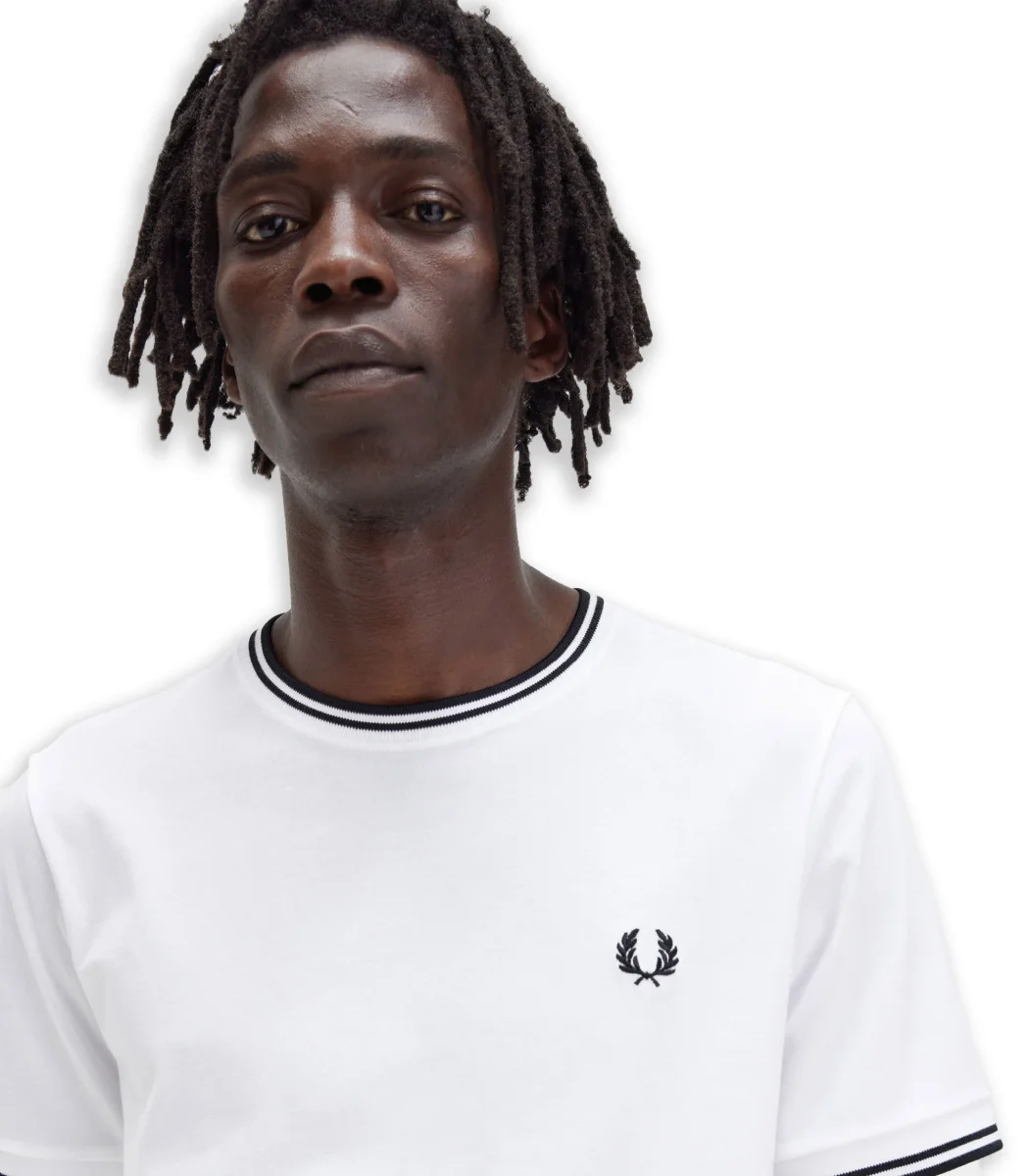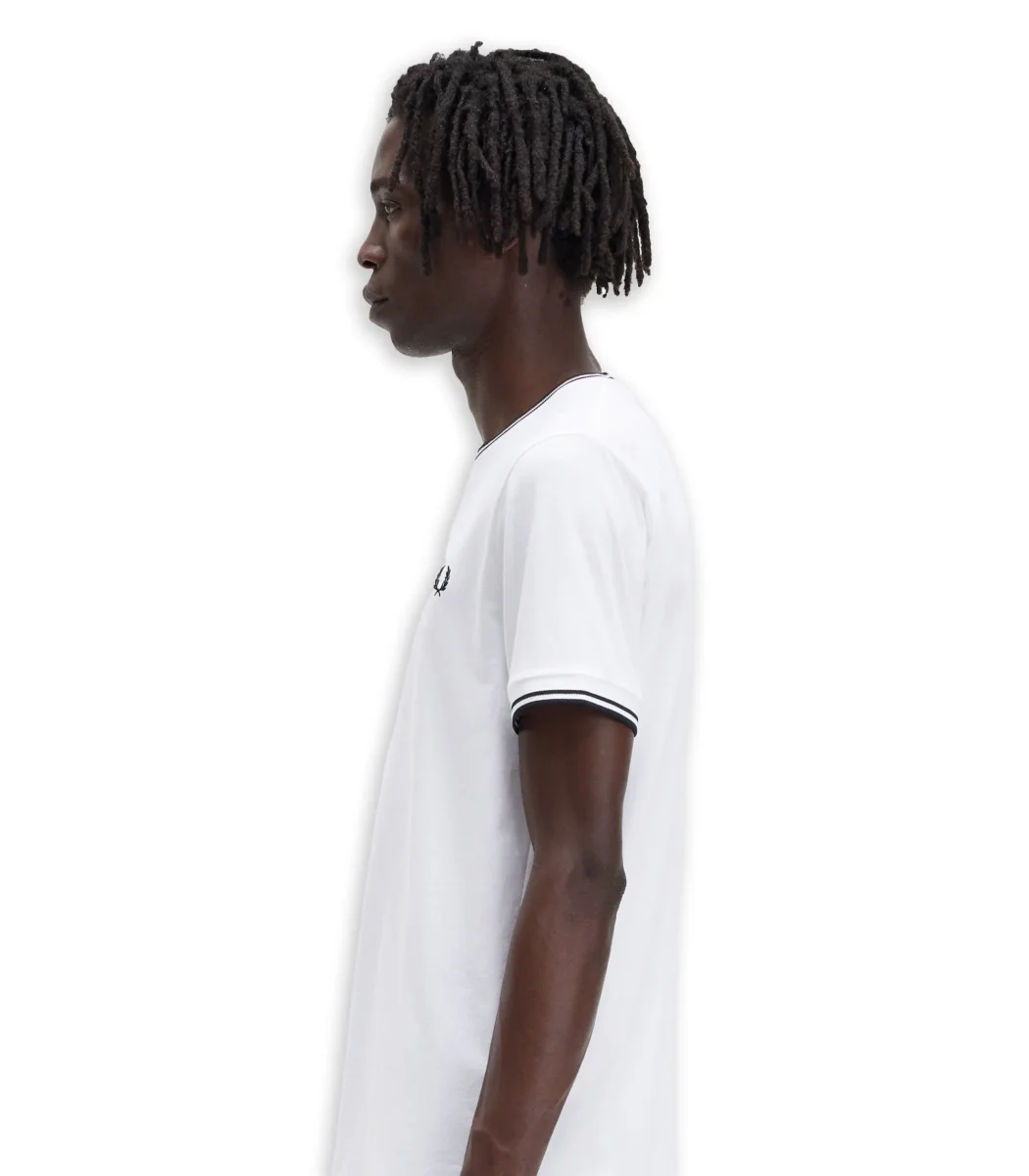 T-shirt Fred Perry con dettaglio rigato collo e maniche logo ricamato frontale cotone morbido vestibilità regolare.