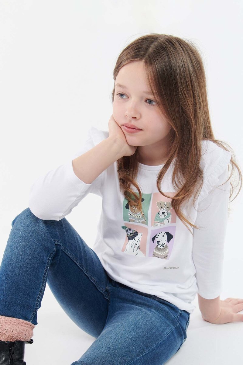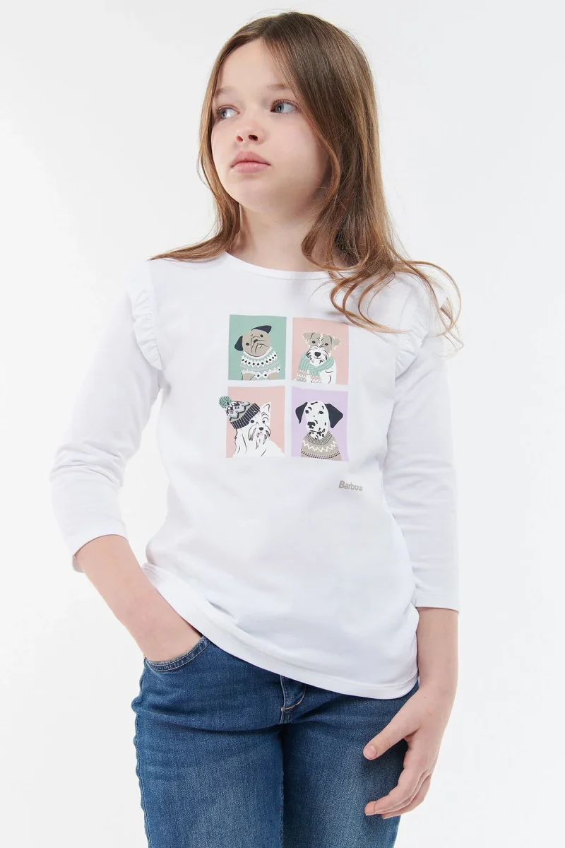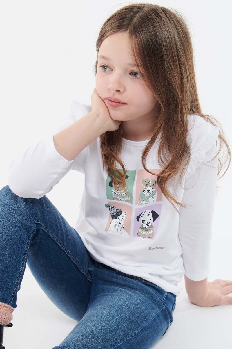 La T-shirt Barbour Sophie è realizzata in leggero tessuto di misto cotone e presenta una simpatica grafica con un cane sul petto. Con maniche lunghe e rouches sulle spalle, questo capo si abbina a qualsiasi look casual.