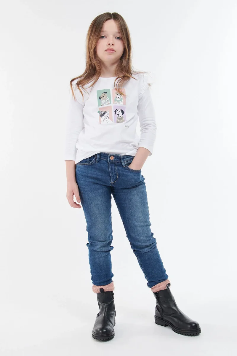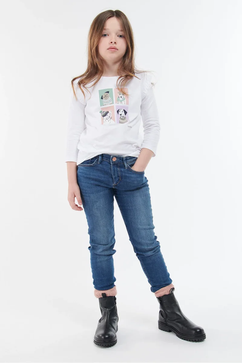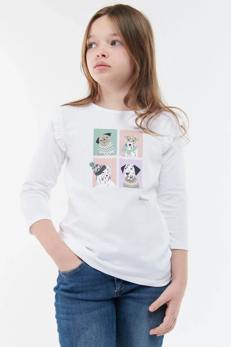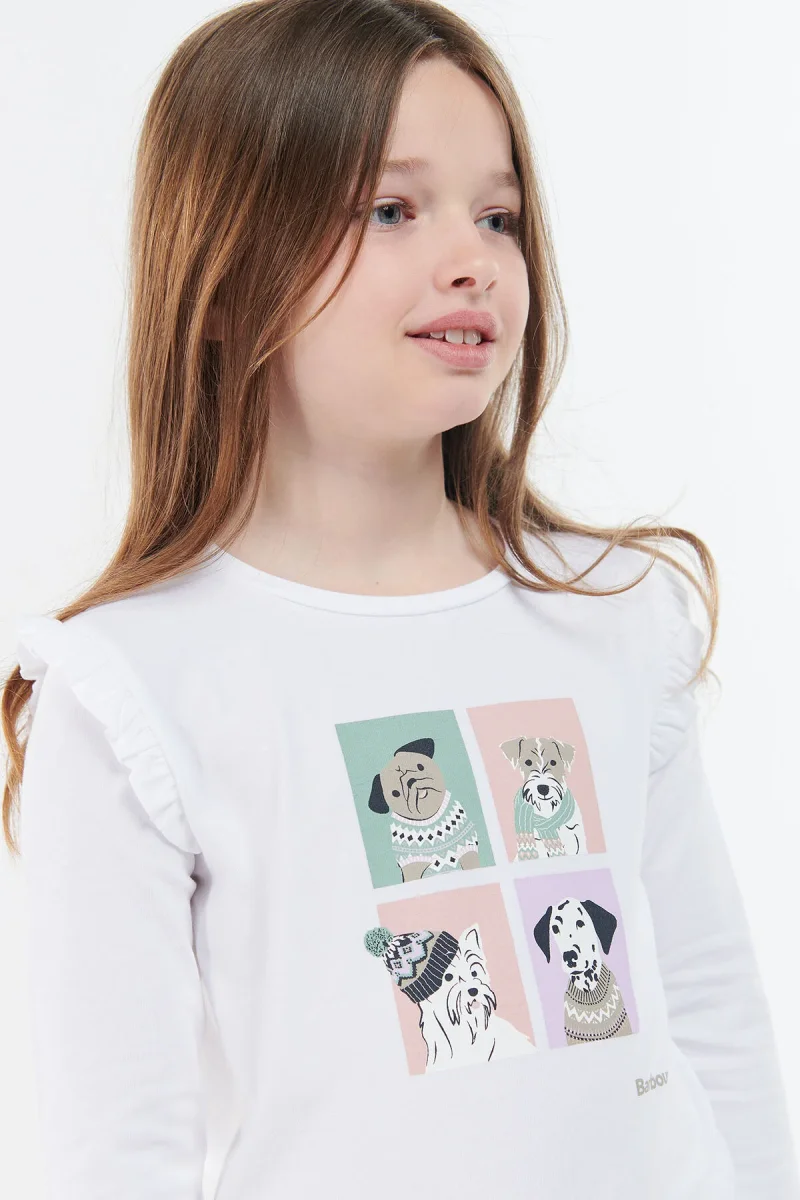 La T-shirt Barbour Sophie è realizzata in leggero tessuto di misto cotone e presenta una simpatica grafica con un cane sul petto. Con maniche lunghe e rouches sulle spalle, questo capo si abbina a qualsiasi look casual.