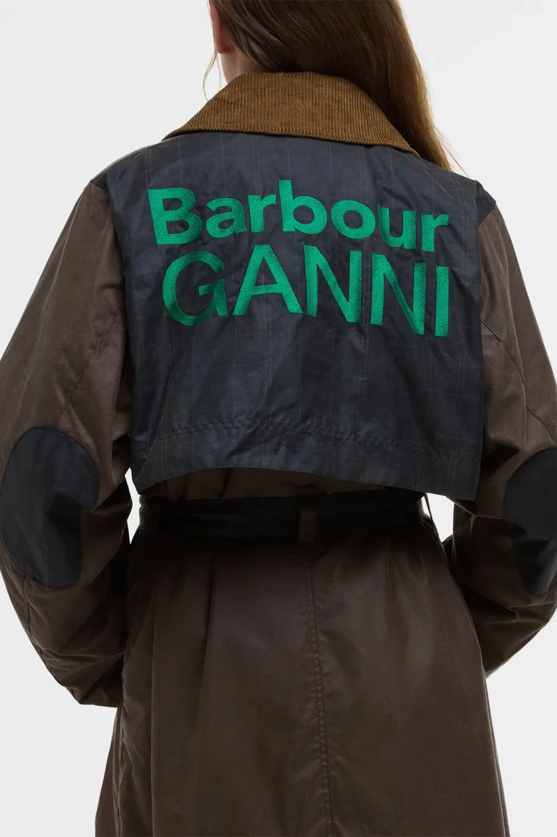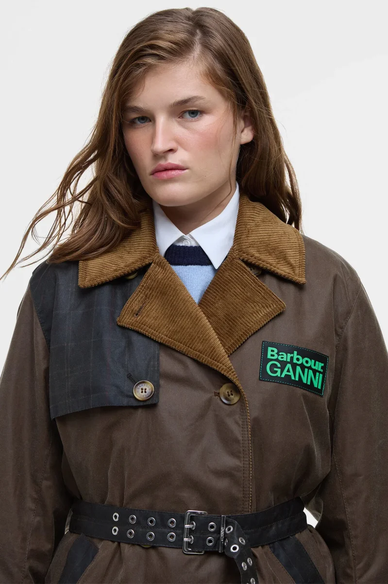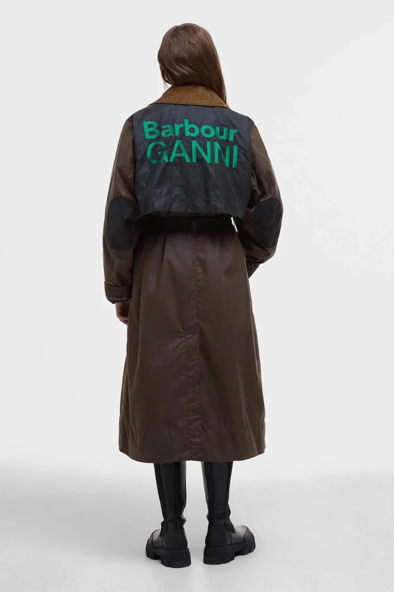 Sintesi perfetta delle inconfondibili silhouette di Barbour e degli iconici dettagli di GANNI, il trench cerato della collezione Barbour x GANNI è un vero e proprio mix di funzionalità e design all’avanguardia. Realizzato nel caratteristico cotone cerato di Barbour e impreziosito da patch in classico tartan, questo modello è dotato delle inconfondibili maniche morbide e della speciale cintura con fibbia di GANNI. Impreziosito dal logo Barbour GANNI ricamato sulla parte posteriore, questo trench è l’emblema del tocco inconfondibile di entrambi i brand.