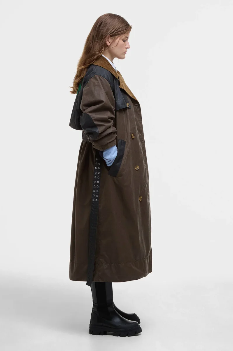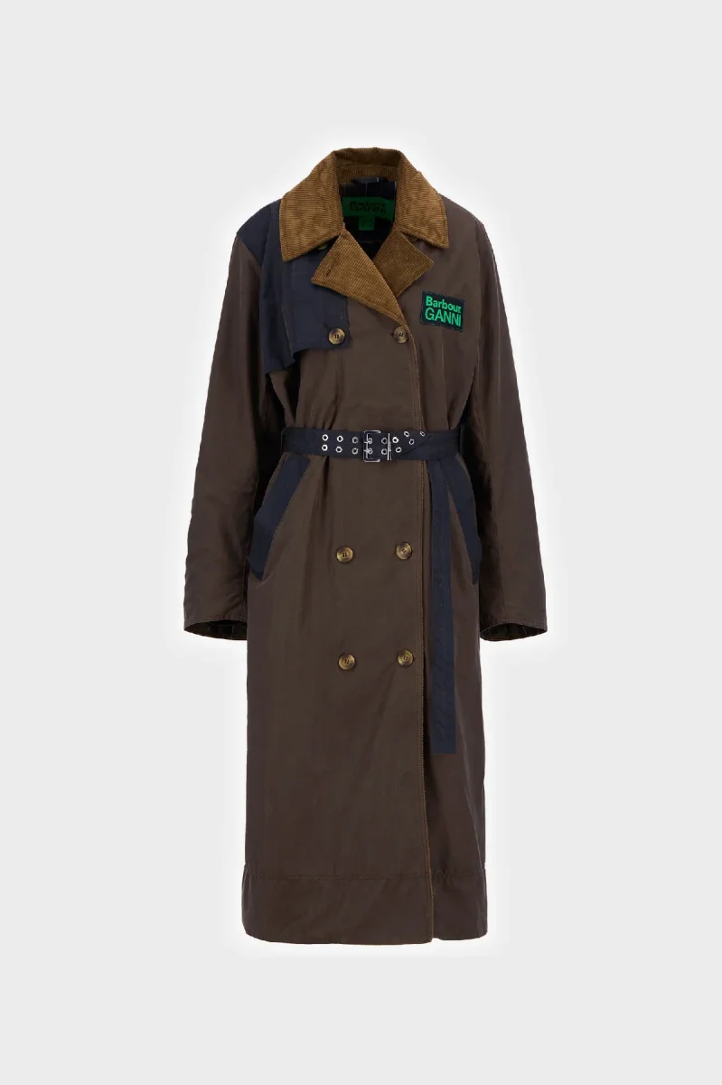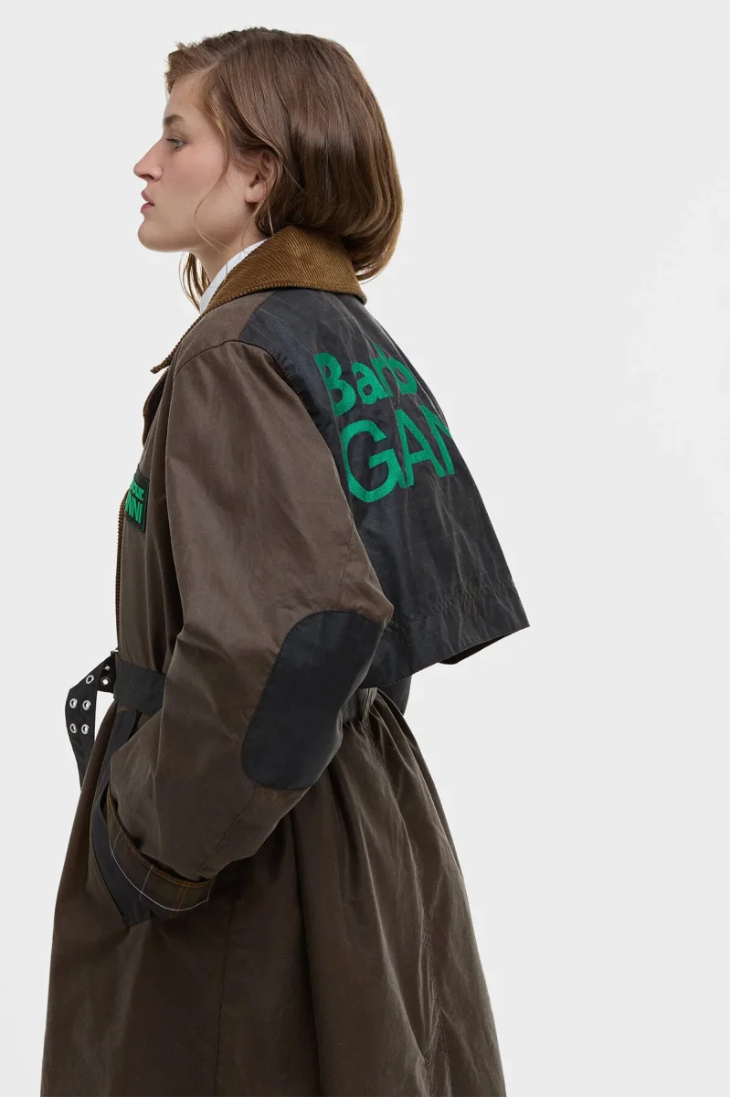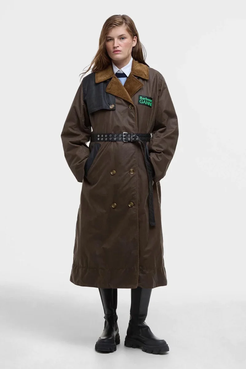 Sintesi perfetta delle inconfondibili silhouette di Barbour e degli iconici dettagli di GANNI, il trench cerato della collezione Barbour x GANNI è un vero e proprio mix di funzionalità e design all’avanguardia. Realizzato nel caratteristico cotone cerato di Barbour e impreziosito da patch in classico tartan, questo modello è dotato delle inconfondibili maniche morbide e della speciale cintura con fibbia di GANNI. Impreziosito dal logo Barbour GANNI ricamato sulla parte posteriore, questo trench è l’emblema del tocco inconfondibile di entrambi i brand.