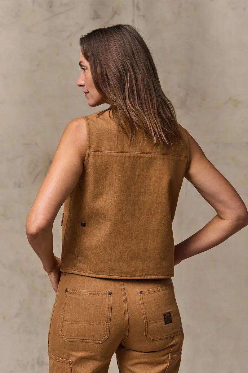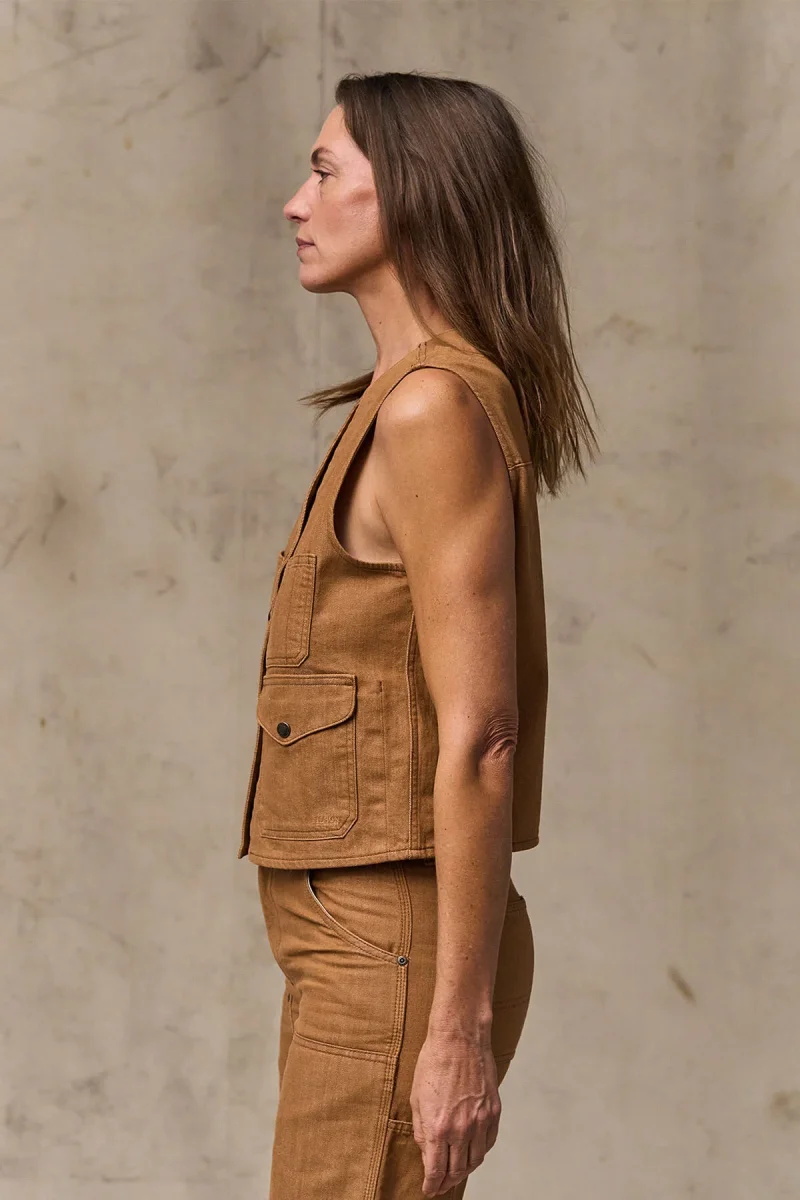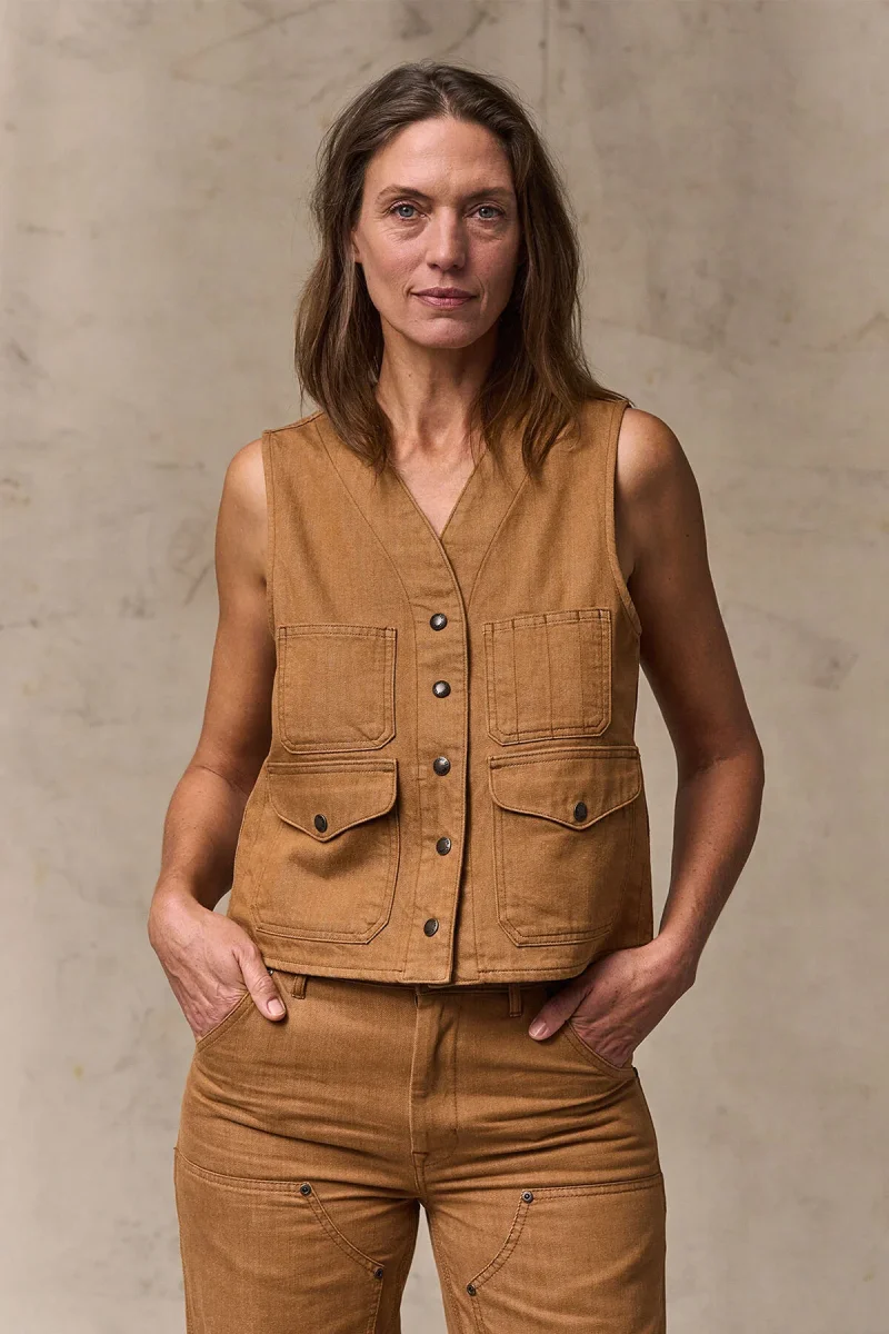 Fedele alle sue radici che affondano nella tradizione dell’abbigliamento da lavoro, il gilet è dotato di tasche cargo con patta, tasche portaoggetti aperte sul petto e una tasca posteriore a tutta larghezza originariamente progettata per contenere mappe e carte topografiche. La chiusura frontale con bottoni a pressione e il design con scollo a V lo rendono semplice e pratico.