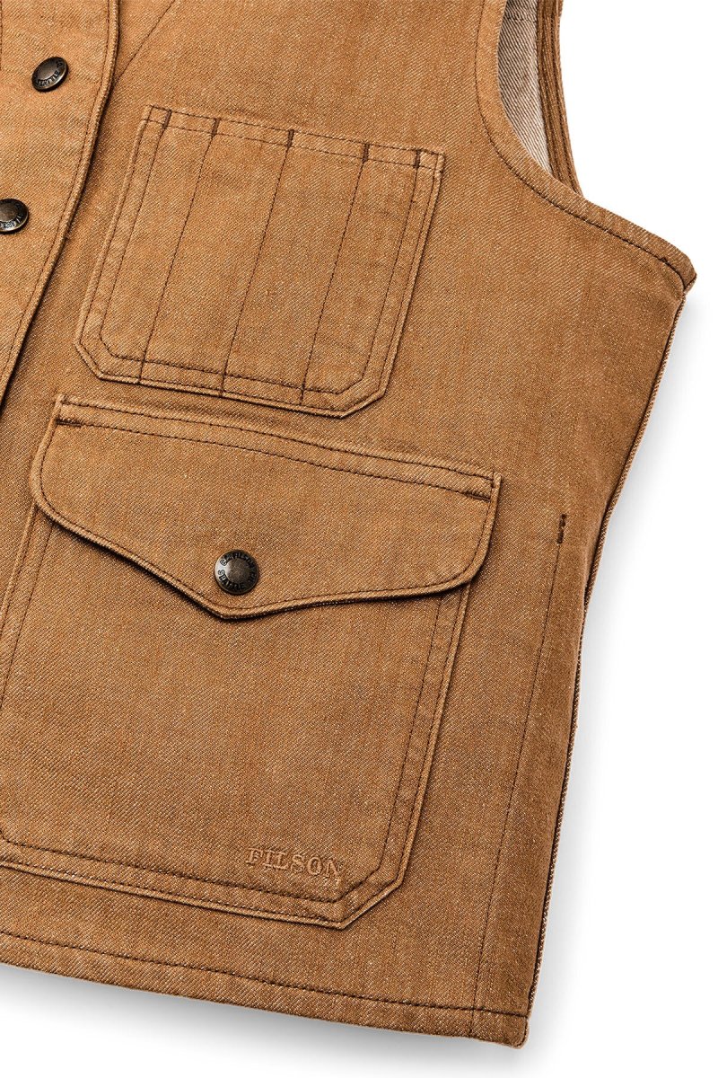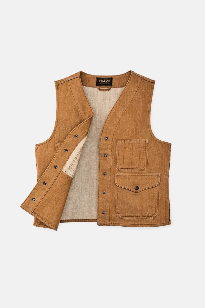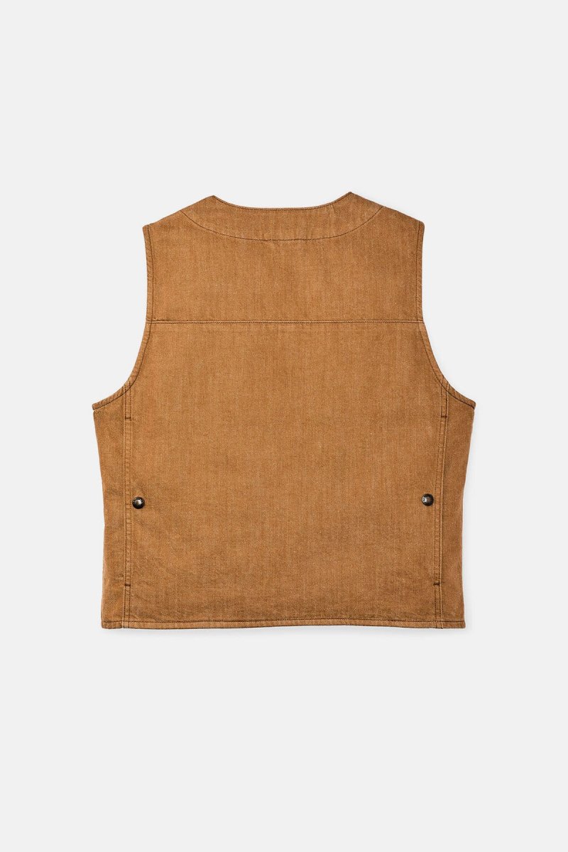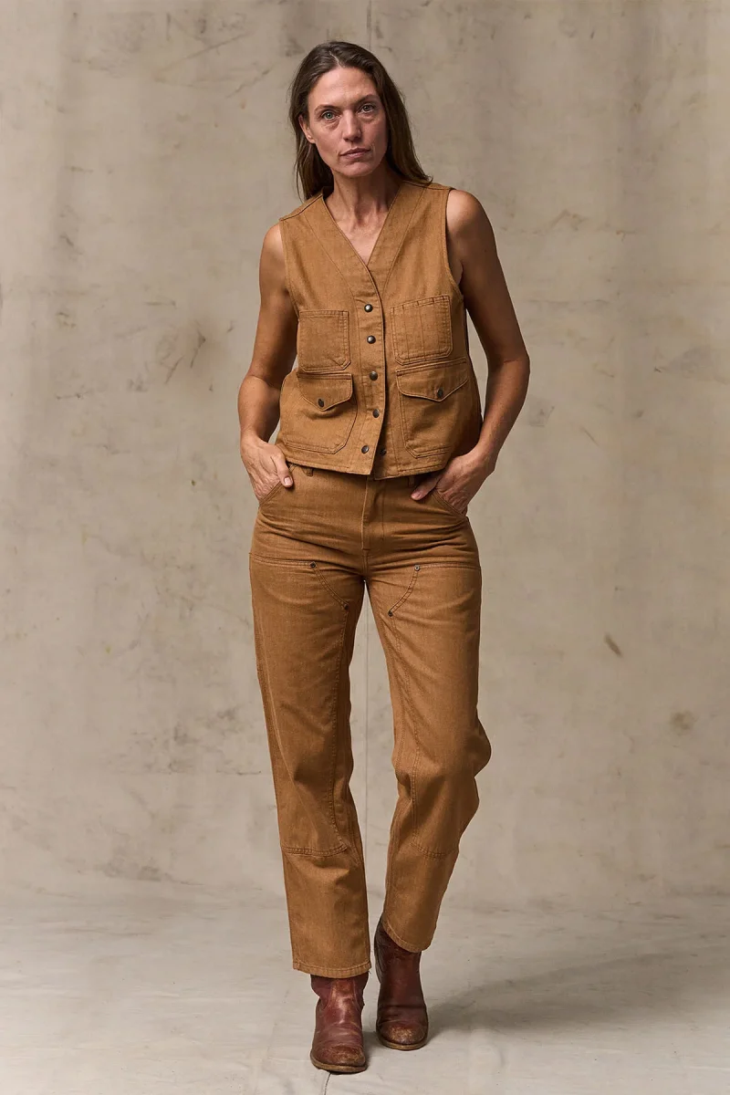 Fedele alle sue radici che affondano nella tradizione dell’abbigliamento da lavoro, il gilet è dotato di tasche cargo con patta, tasche portaoggetti aperte sul petto e una tasca posteriore a tutta larghezza originariamente progettata per contenere mappe e carte topografiche. La chiusura frontale con bottoni a pressione e il design con scollo a V lo rendono semplice e pratico.