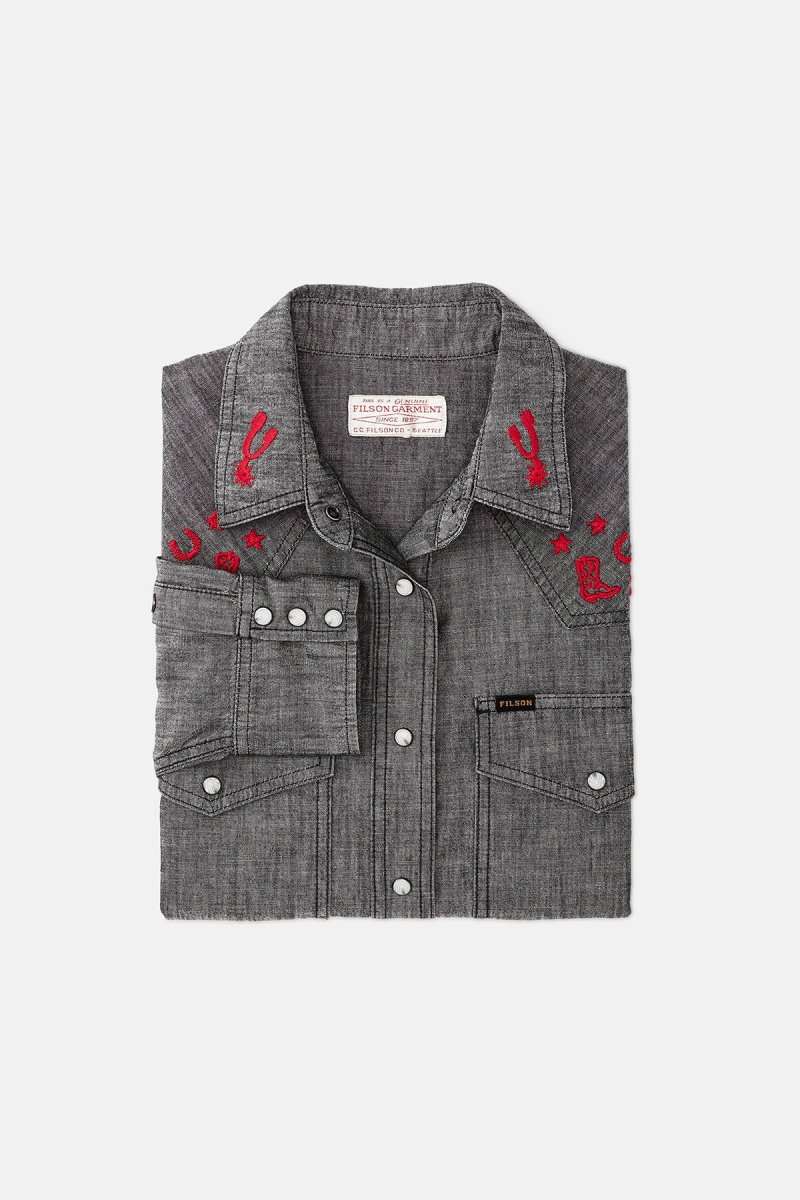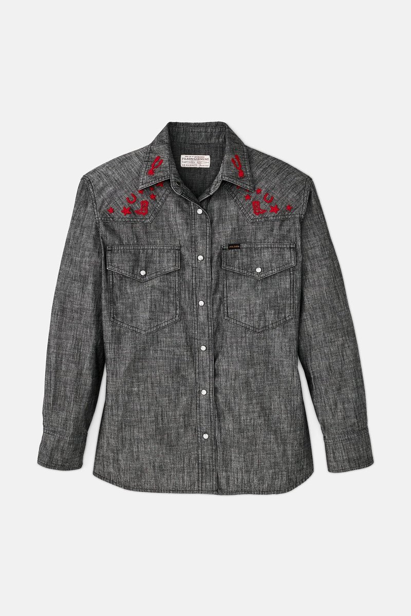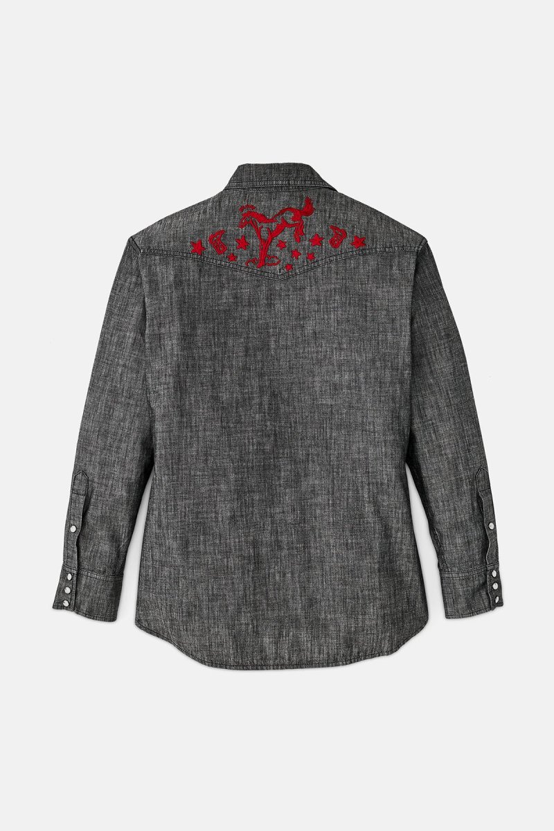 Questa camicia in stile western è realizzata in cotone chambray, un tessuto leggero e resistente utilizzato per l’abbigliamento da lavoro. I polsini e la chiusura frontale sono dotati di bottoni a pressione, mentre le tasche e il carré a punta donano al capo uno stile inconfondibile. I ricami ispirati alla fauna selvatica sul carré anteriore e sul retro aggiungono un tocco unico. Colletto francese e orlo ricurvo.