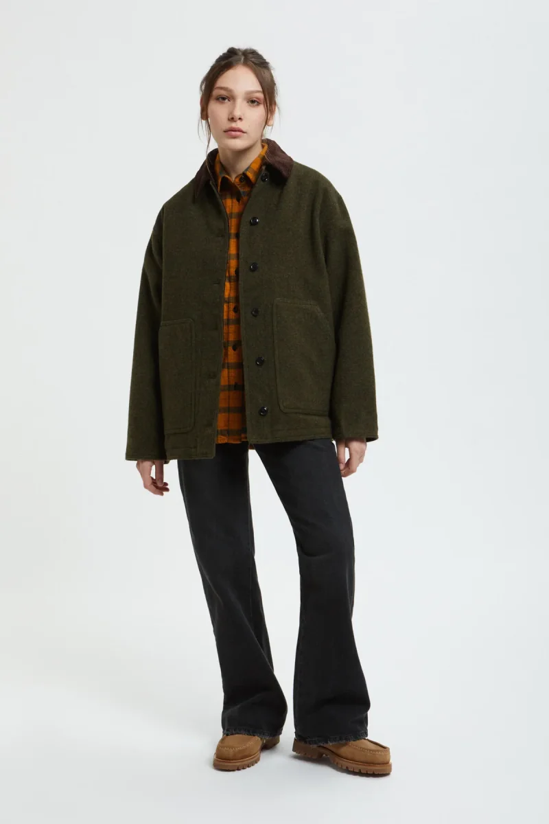 Questa giacca da campagna è realizzata con la nostra iconica lana Mackinaw, che da generazioni garantisce calore nel clima umido e freddo del Pacifico nord-occidentale. È completamente foderata in twill di cotone, con uno spesso velluto di cotone a coste sottili sulla chiusura interna e sul colletto. Il design semplice e senza tempo è caratterizzato dalle classiche tasche applicate che consentono di raggiungere in modo facile e veloce gli oggetti essenziali o le chiavi. La chiusura frontale è dotata di bottoni resistenti.