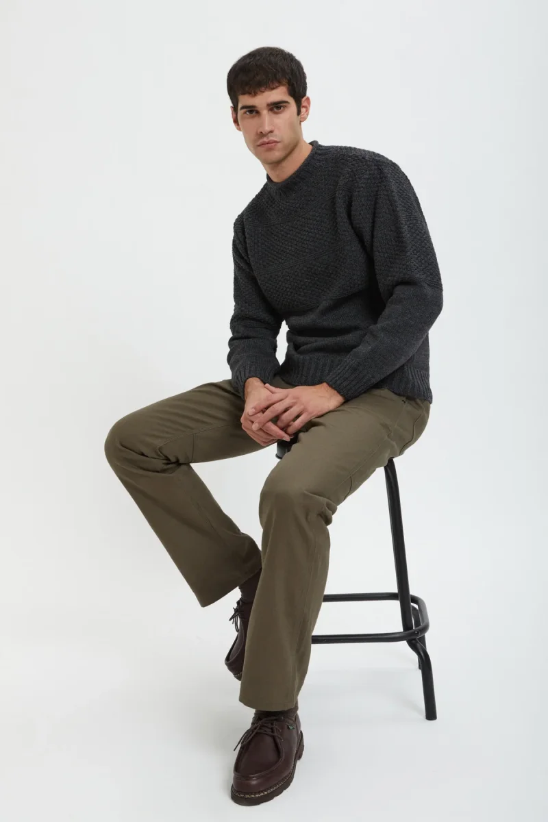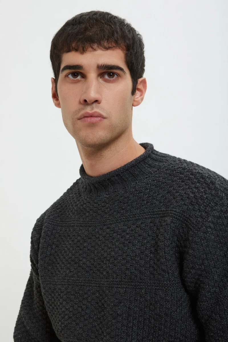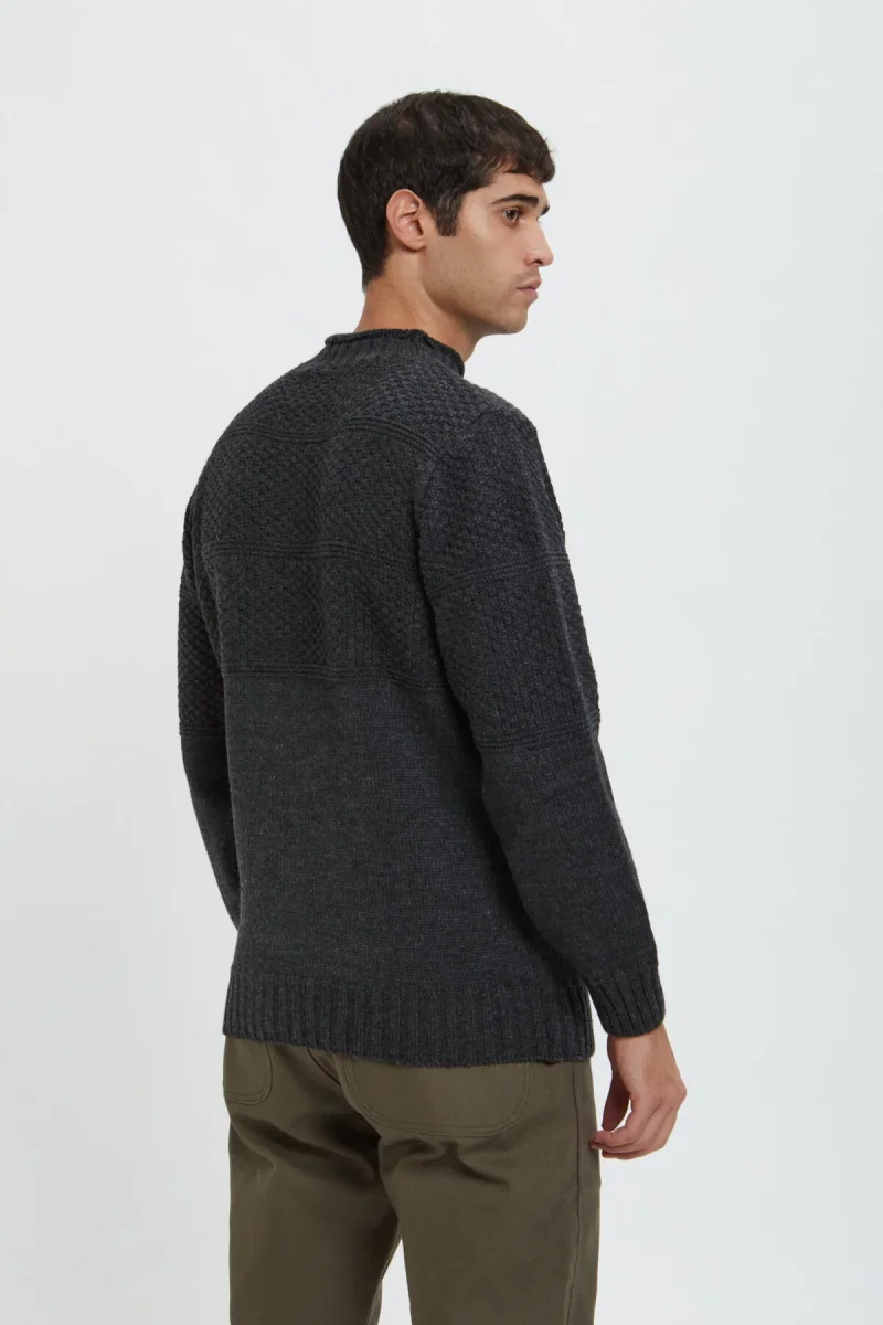 Un classico intramontabile, questo maglione è lavorato a maglia a Dublino, poco lontano dalla costa irlandese nei pressi dell’isola di Ireland’s Eye. Sulla parte superiore, il busto e le maniche sono lavorati in punto riso, che dona un finish unico dalla texture zigrinata. Sulla parte inferiore, invece, sono lavorati nel tradizionale punto Jersey. Il colletto e l’orlo rimangono arricciati all’indietro, offrendo un aspetto grossolano e comodo.